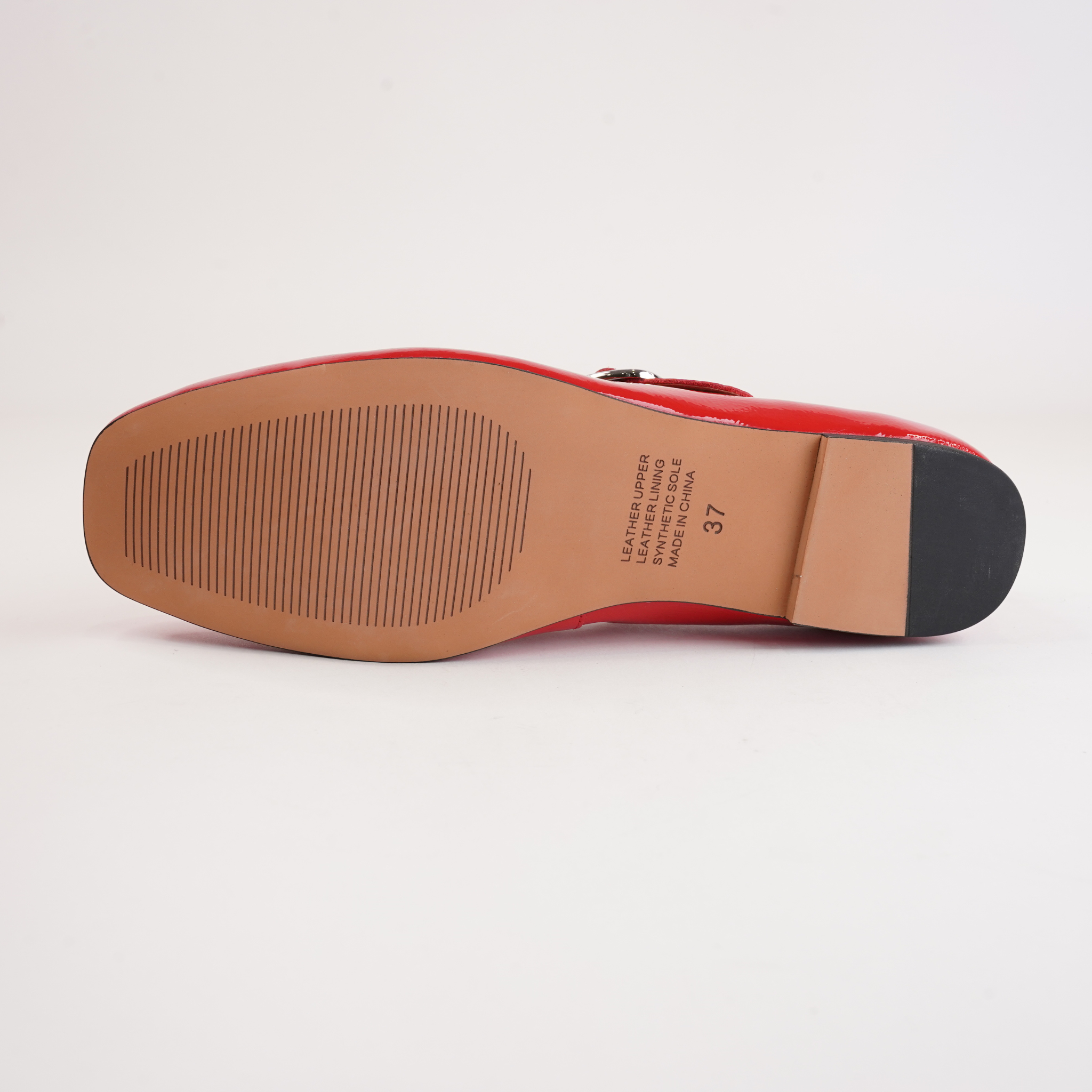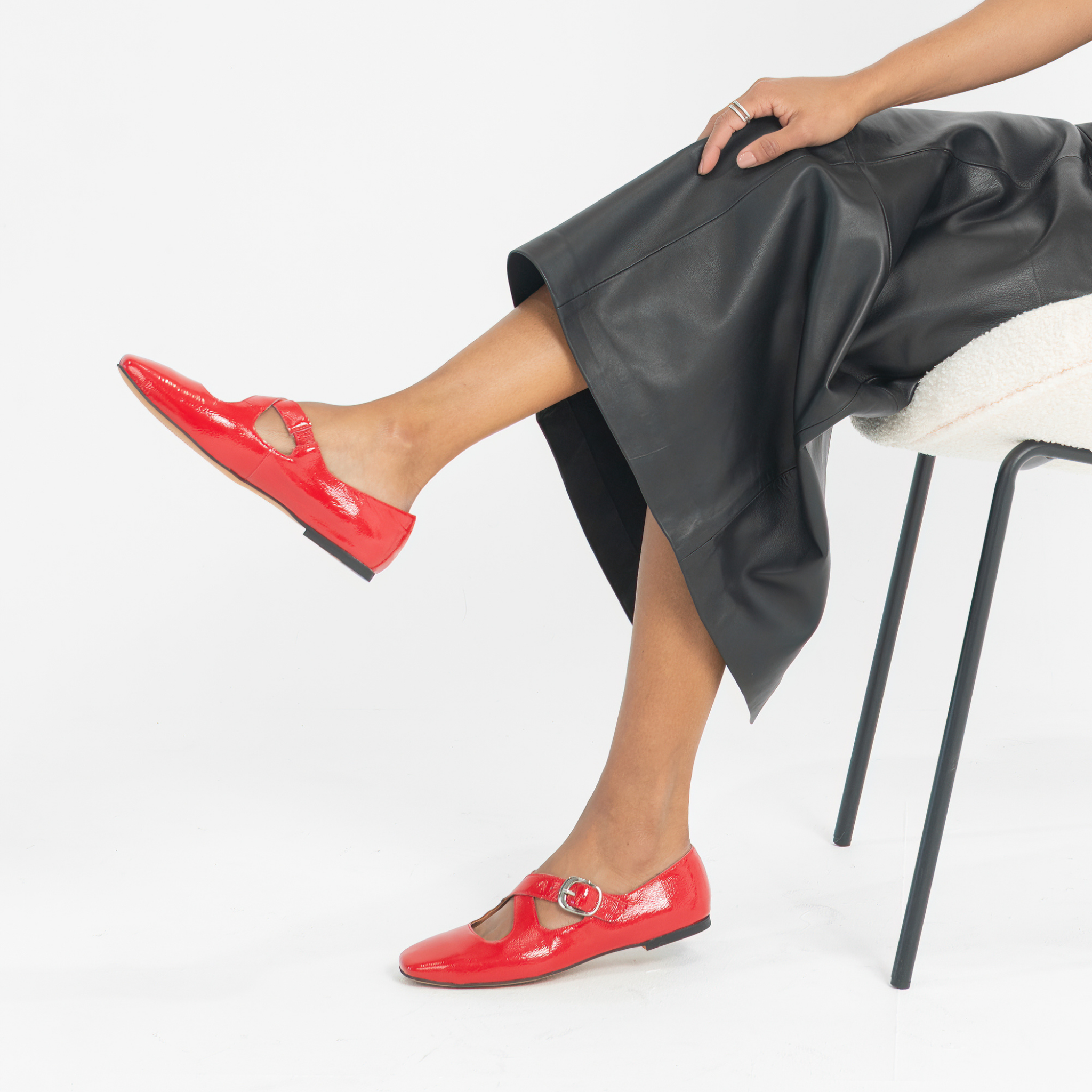 Sophisticated and bold, the Nowa flats by Mollini in red crinkle patent leather are a wardrobe must-have. With a statement silver buckle and flattering cross-strap design, they bring effortless polish to any outfit.