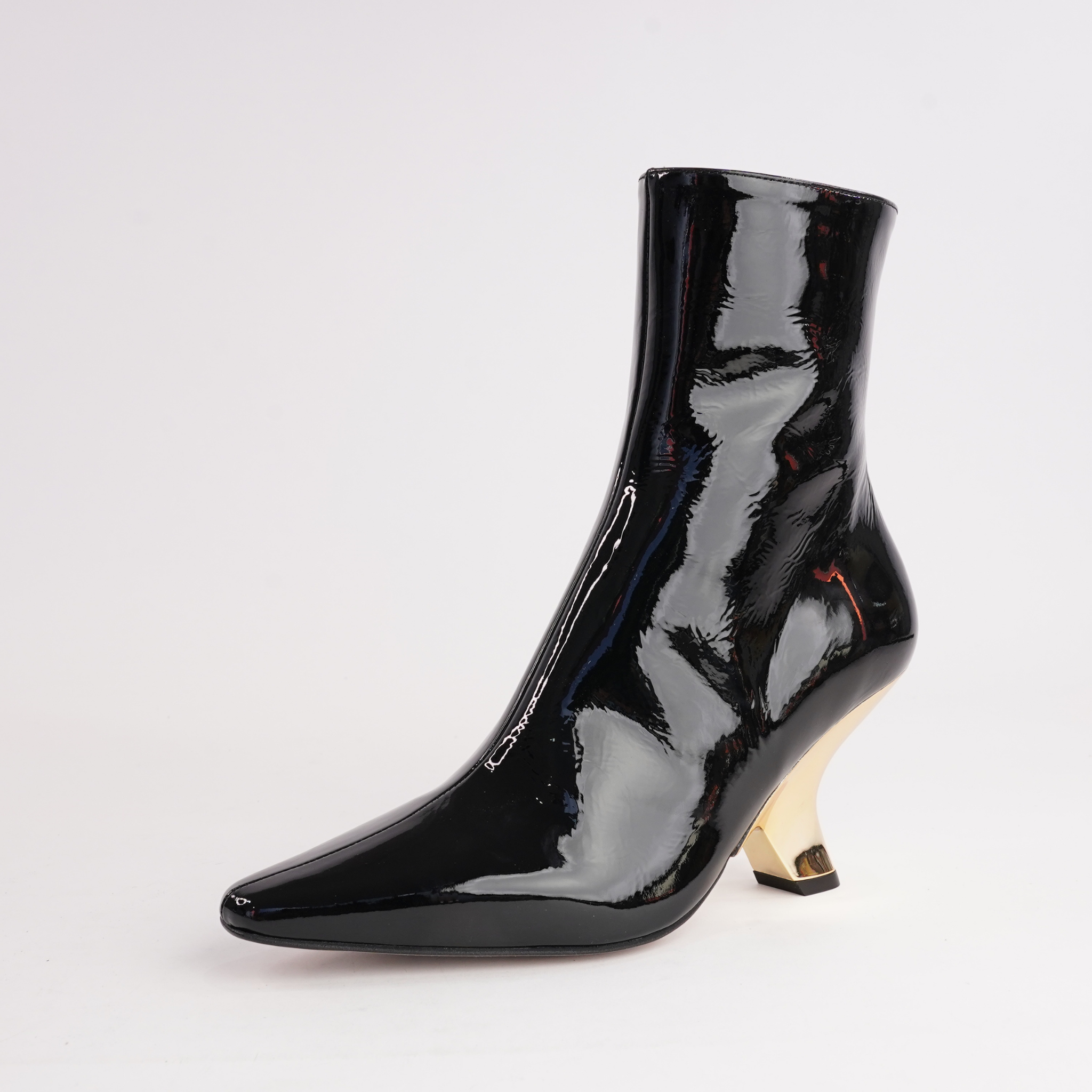 Bold, modern, and unforgettable the AG-24573 Black Patent Ankle Boots by Neo bring runway-worthy glamour to your wardrobe. With a gold-toned hourglass heel and sharp pointed toe, they’re made for stepping out in serious style.