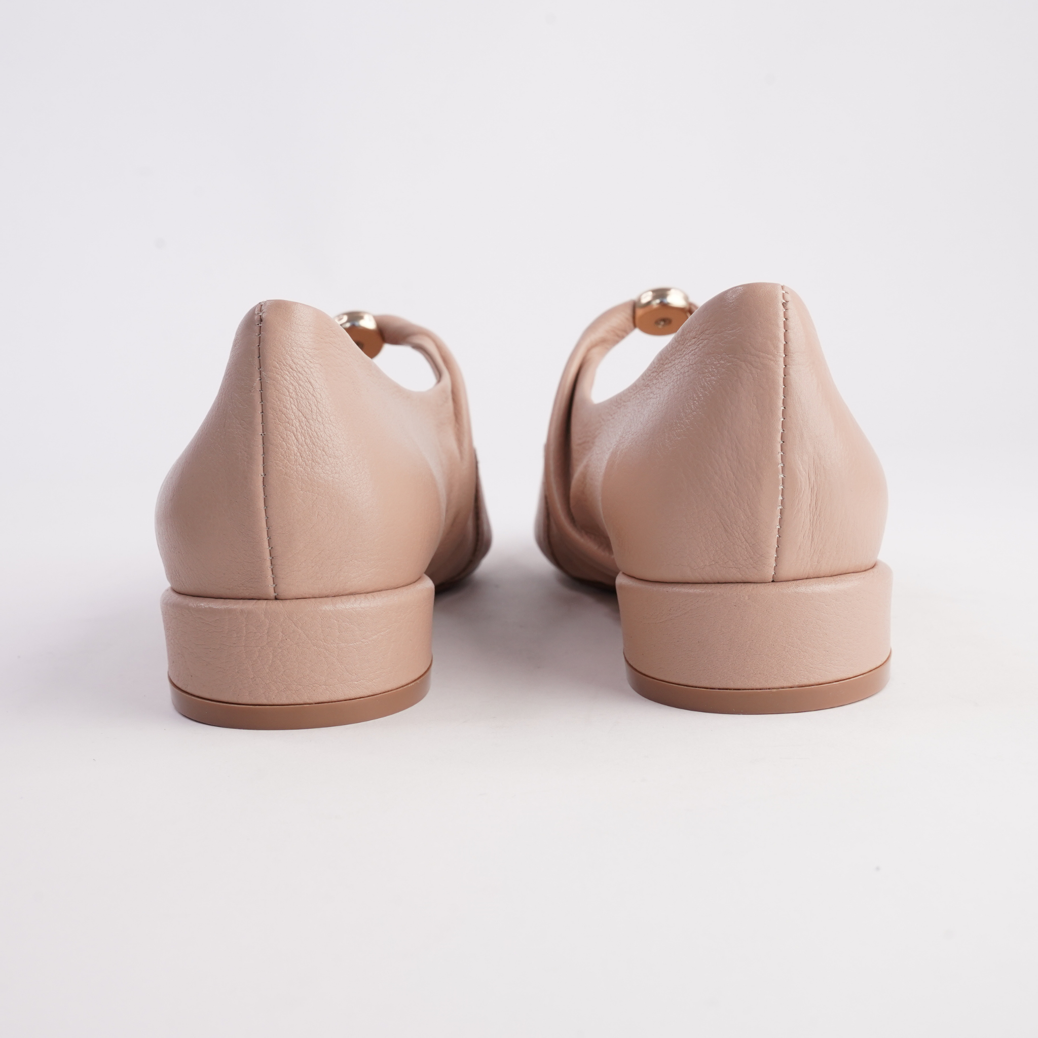 Understated with a quiet twist, Estrela is a modern flat designed for women who like their everyday shoes a little elevated. Crafted in soft cappuccino leather, this style features a gathered front with a subtle metal accent that adds interest without overpowering the look. The low block heel gives just enough lift, making it ideal for all-day wear, from office hours to after-hours.