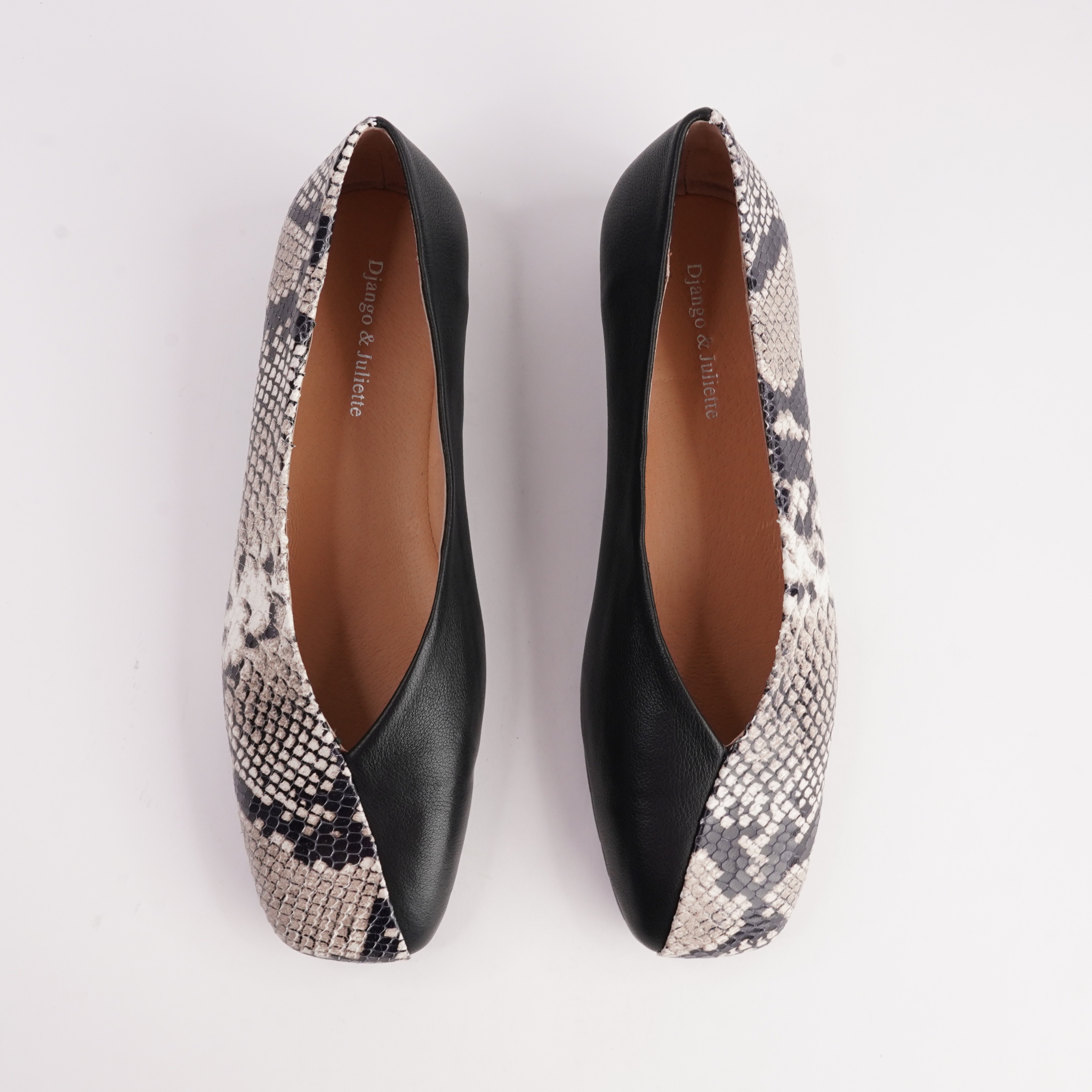 A modern flat with a little edge Paydes blends classic black leather with striking black-and-white snake print for a look that feels effortless yet elevated. The soft leather upper and flexible sole make this an easy all-day option, while the contrast panels add just enough interest to lift simple outfits.