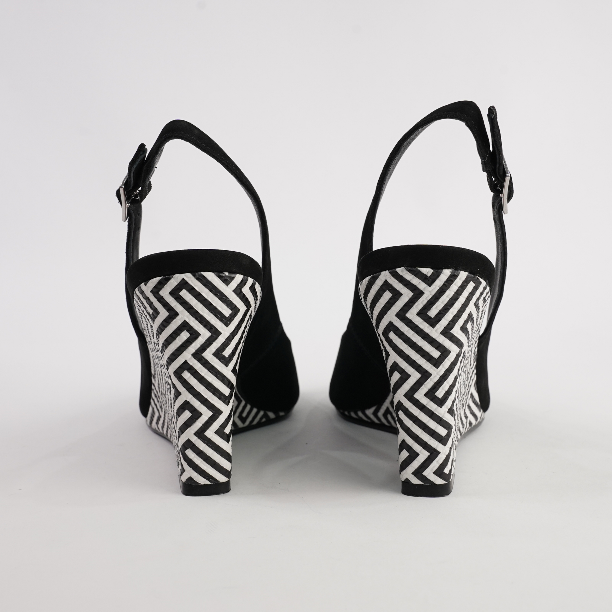 Step into timeless elegance with the Bryce Heels by Chrissie. Crafted from luxe black nubuck leather, these slingback wedges feature a chic peep-toe design and an adjustable buckle strap for a secure fit. The standout detail is the bold monochrome geometric wedge, adding a modern twist to a classic silhouette. Perfect for day-to-night styling, Bryce delivers both comfort and sophistication.