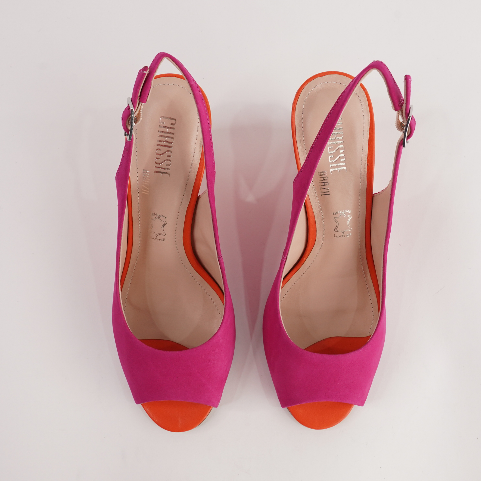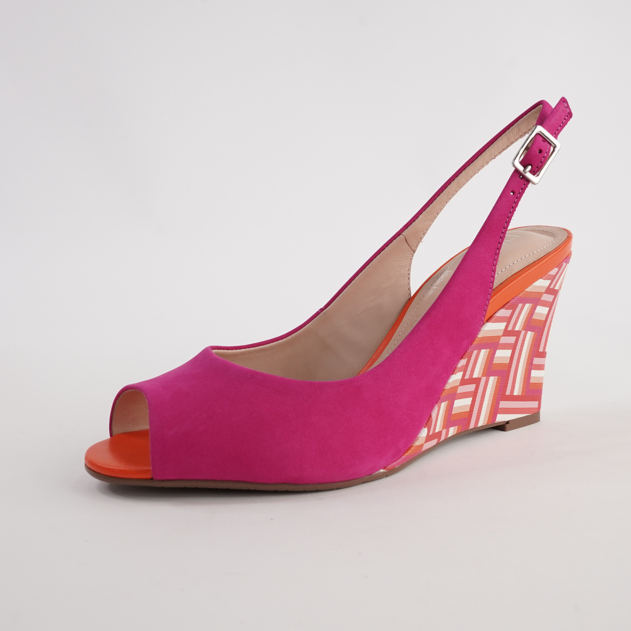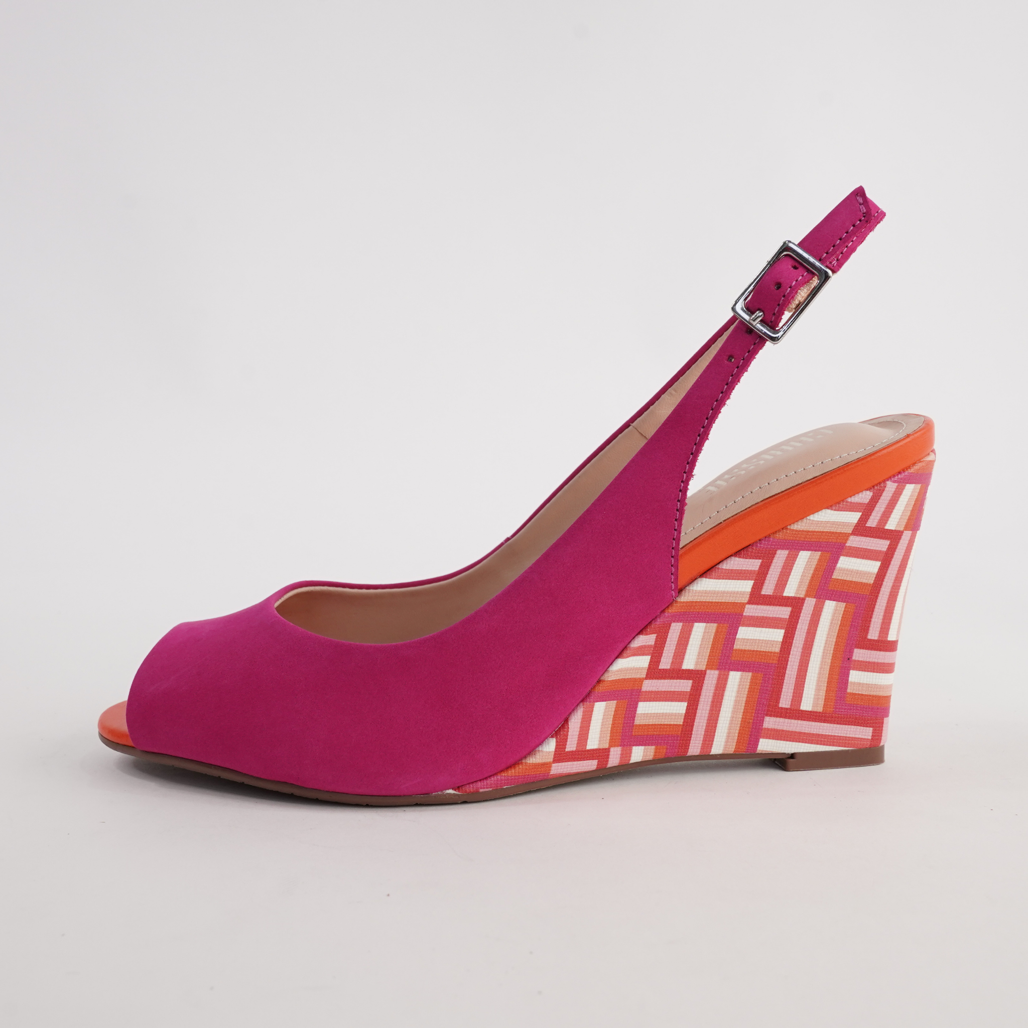 Brighten up your wardrobe with the Bryce Heels by Chrissie. Crafted from soft fuchsia nubuck leather, these statement wedges bring playful sophistication to any look. The slingback strap with adjustable buckle ensures a secure fit, while the bold colour-blocked wedge, featuring an eye-catching geometric pattern in pink, orange, and white, adds a modern edge. Finished with a peep-toe design, the Bryce is the perfect balance of vibrant style and everyday comfort.