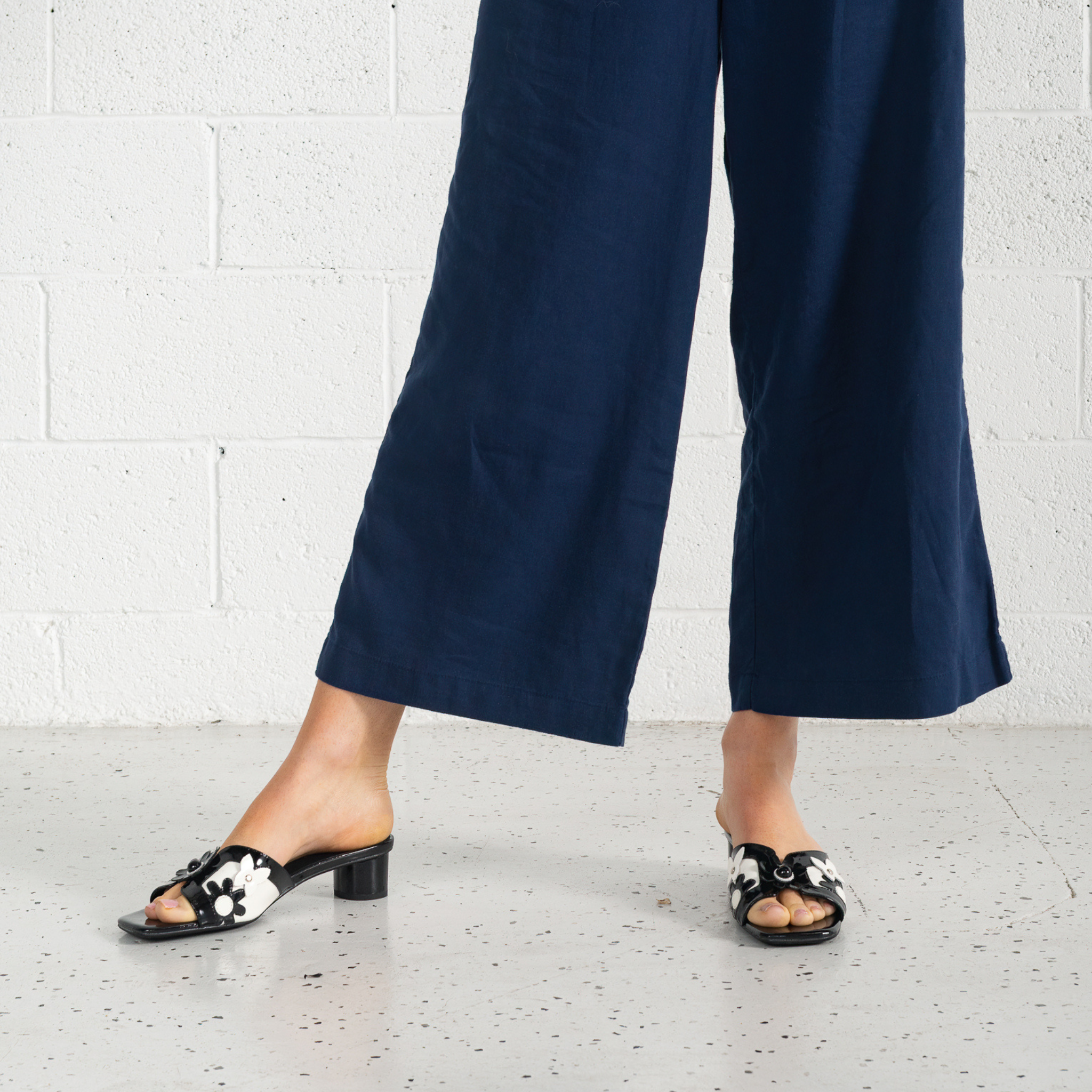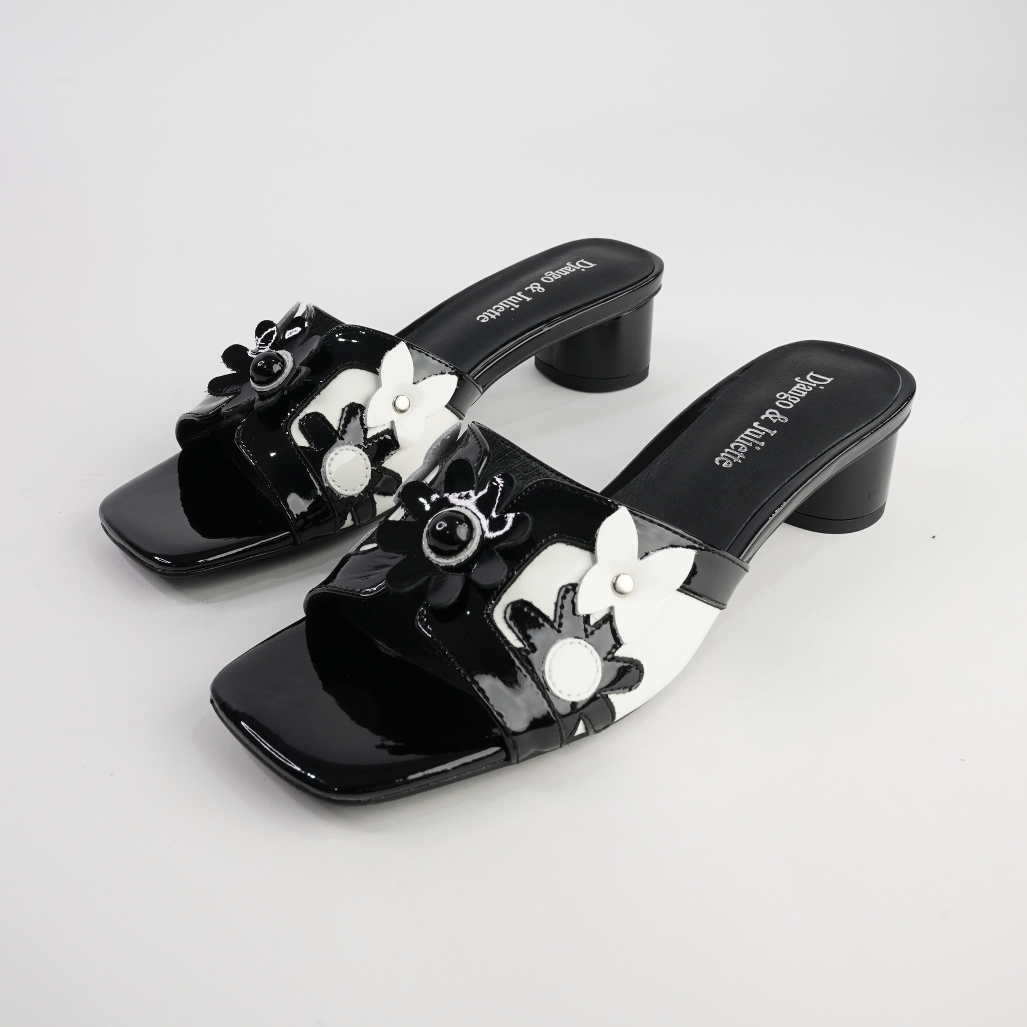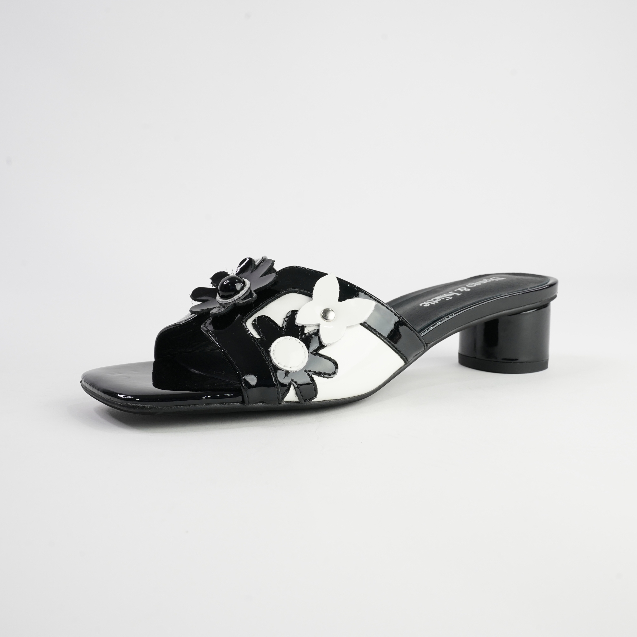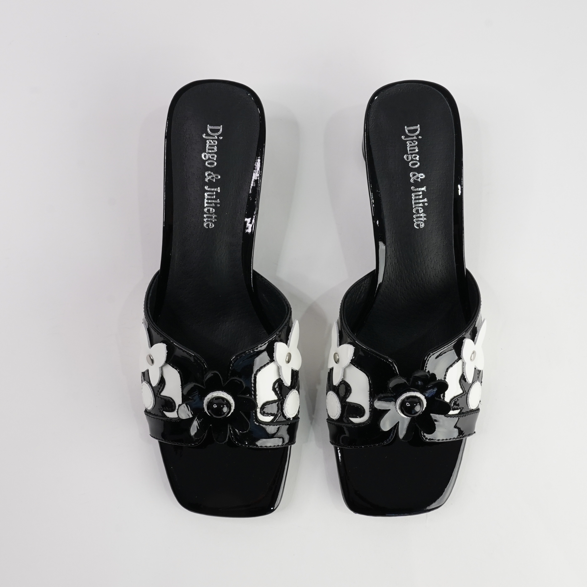 Classic meets playful in the Hetti Black/White Patent Leather Heels by Django & Juliette. Designed in glossy black and white patent leather, these low block heels feature bold floral appliqué details for a chic yet fun twist. The slip-on mule design makes them effortless to wear, while the cushioned footbed ensures comfort all day or night.