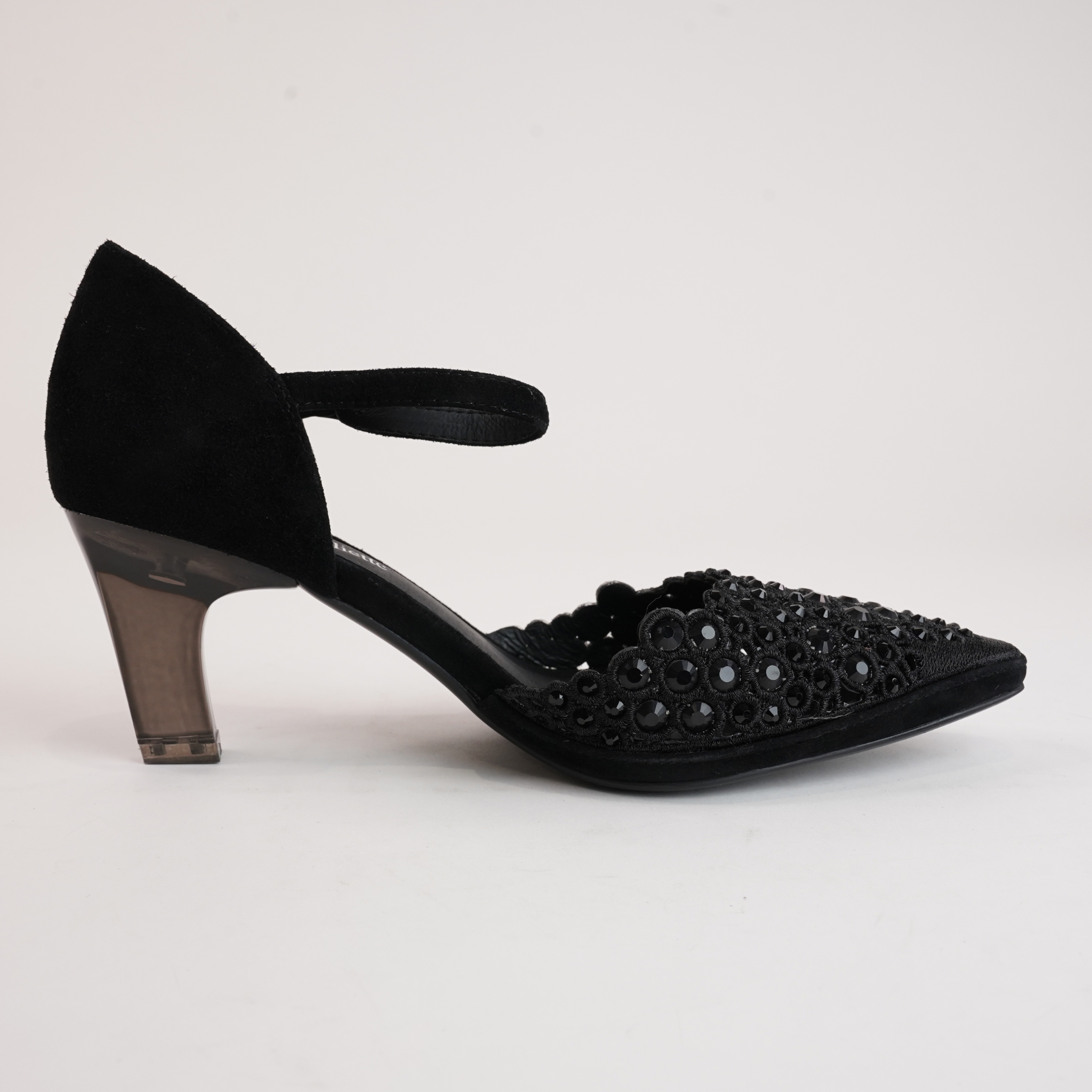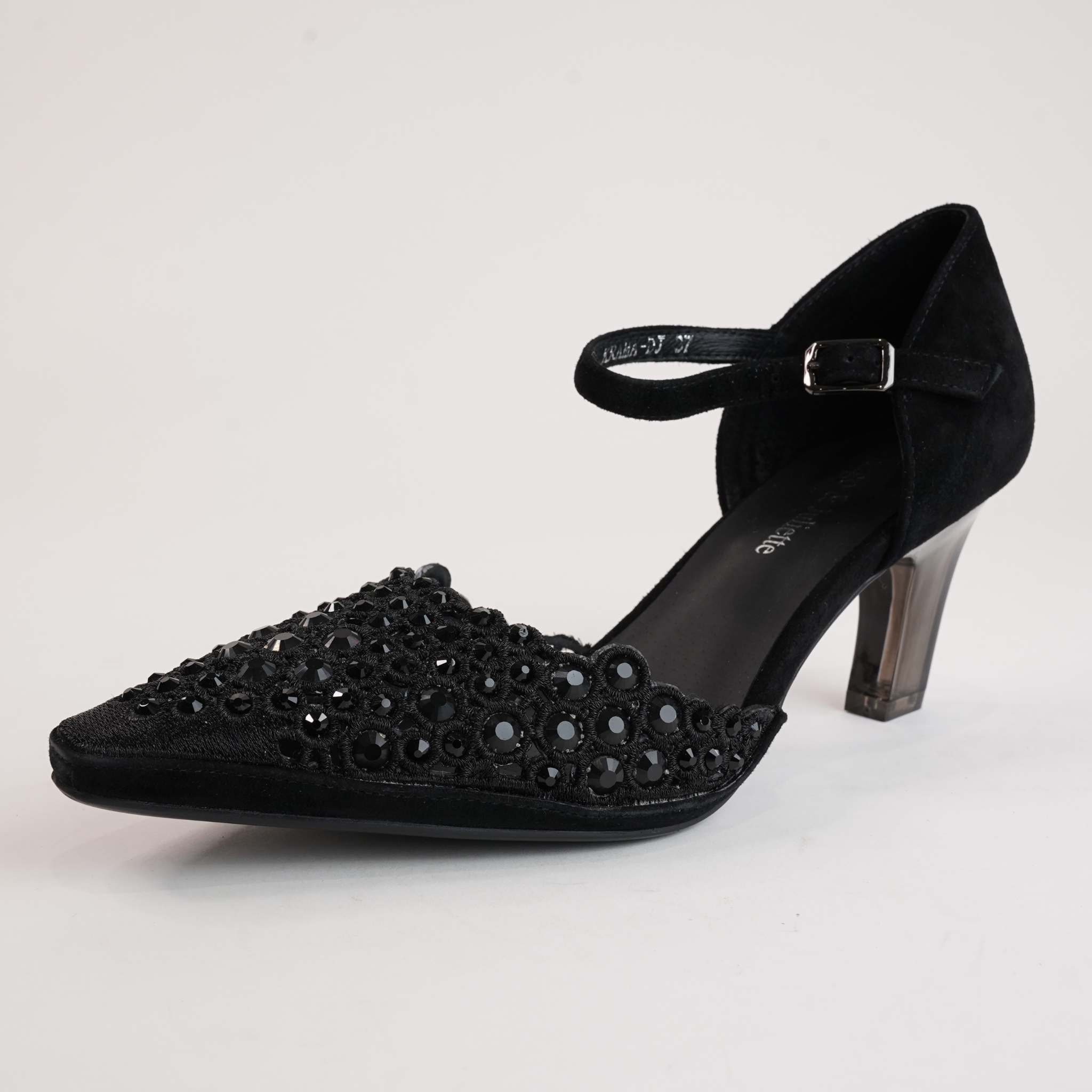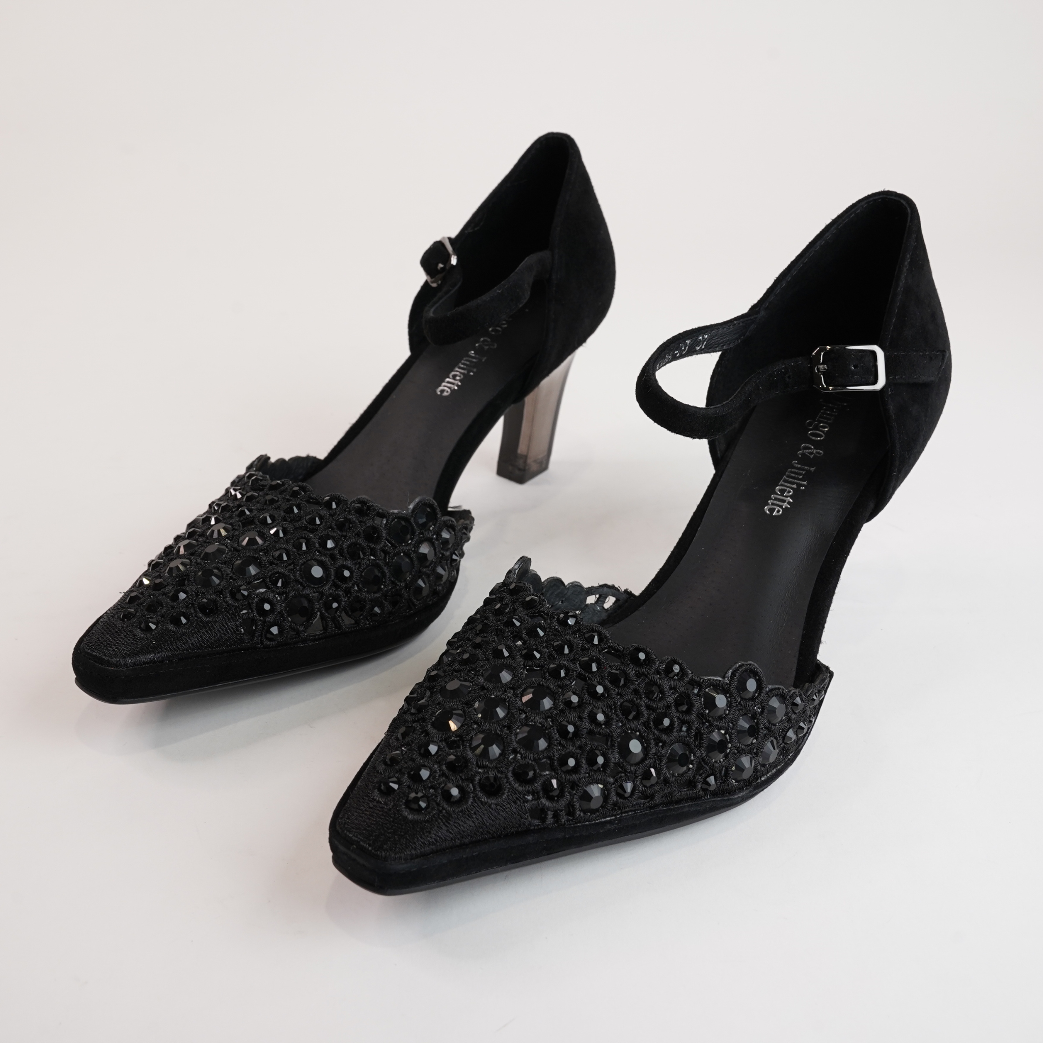 Perfect for weddings, parties, or a night out, the Krama Black Leather Heels by Django & Juliette combines timeless charm with modern sophistication. The crystal-adorned pointed toe and transparent block heel bring a touch of elegance, while the secure ankle strap keeps you comfortable and supported.