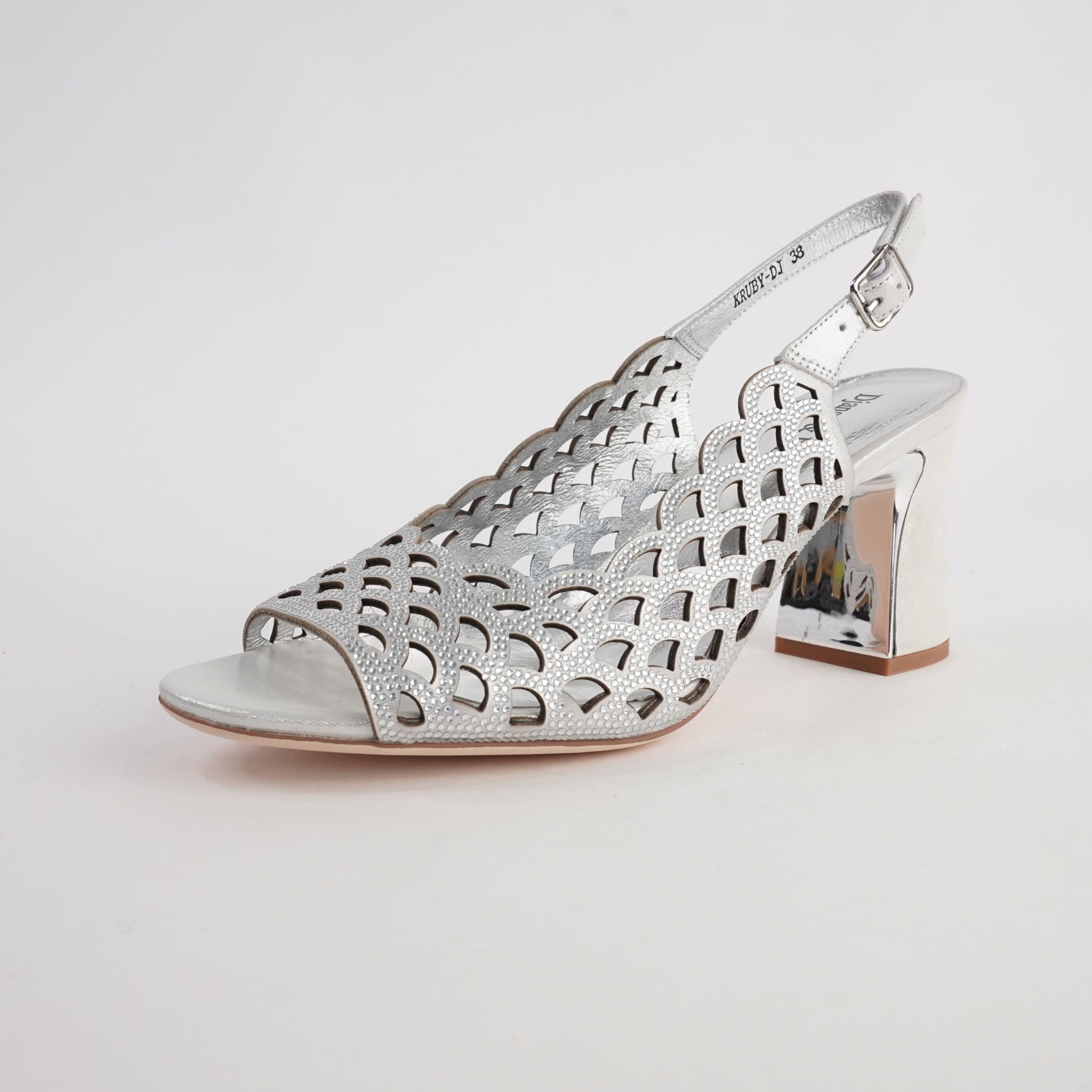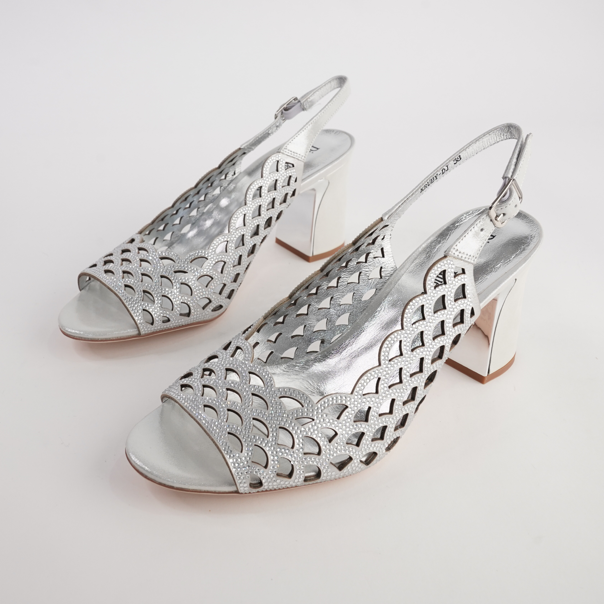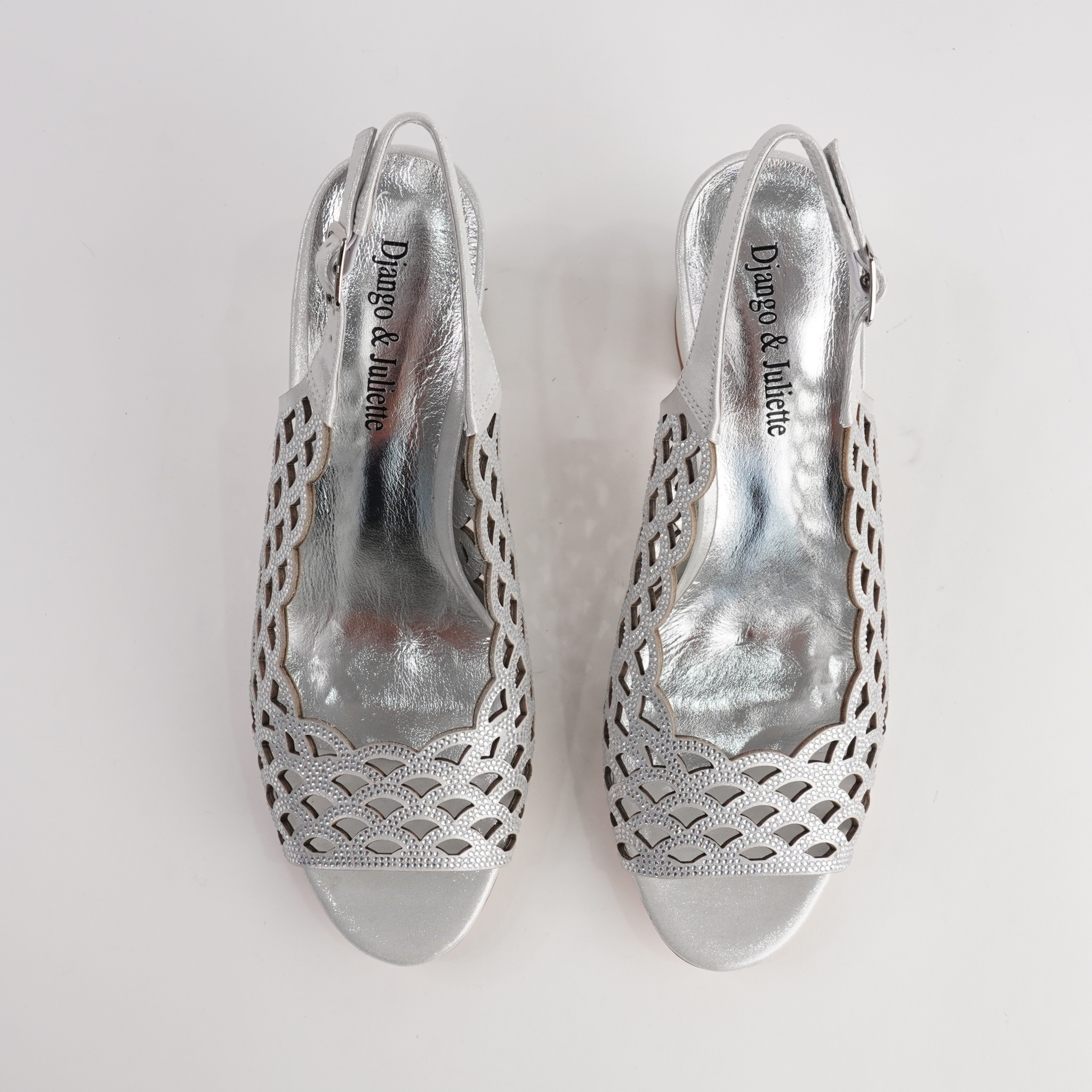 Bring a touch of sparkle to any occasion with the Kruby Heels by Django & Juliette. Crafted from premium silver shimmer leather, these heels feature a striking laser-cut design that creates a bold yet elegant look. The peep-toe silhouette and slingback strap add to the feminine appeal, while the sculpted block heel in a mirrored metallic finish delivers both glamour and stability. Perfect for weddings, evening events, or simply elevating your everyday style, Kruby is a statement shoe that doesn’t compromise on comfort.