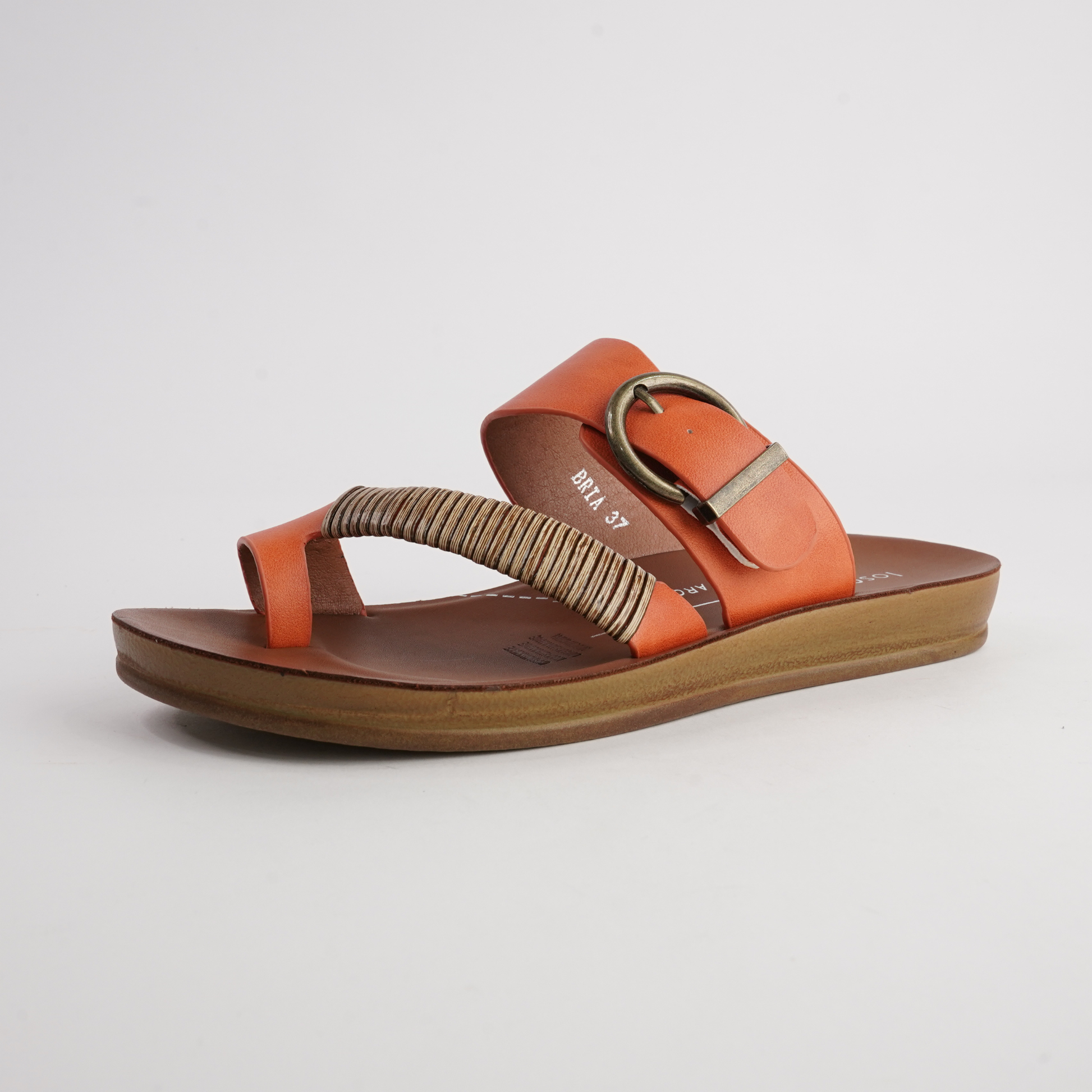 Bright, bold, and beautifully crafted the Bria Sandals by Los Cabos bring effortless summer style to every step. Designed in a vibrant tangerine hue, these sandals feature a toe loop and wide leather-look strap detailed with a woven accent and antique gold buckle. The soft footbed and flexible sole provide all-day comfort, while the minimal silhouette makes them perfect for casual days, warm evenings, or resort escapes.