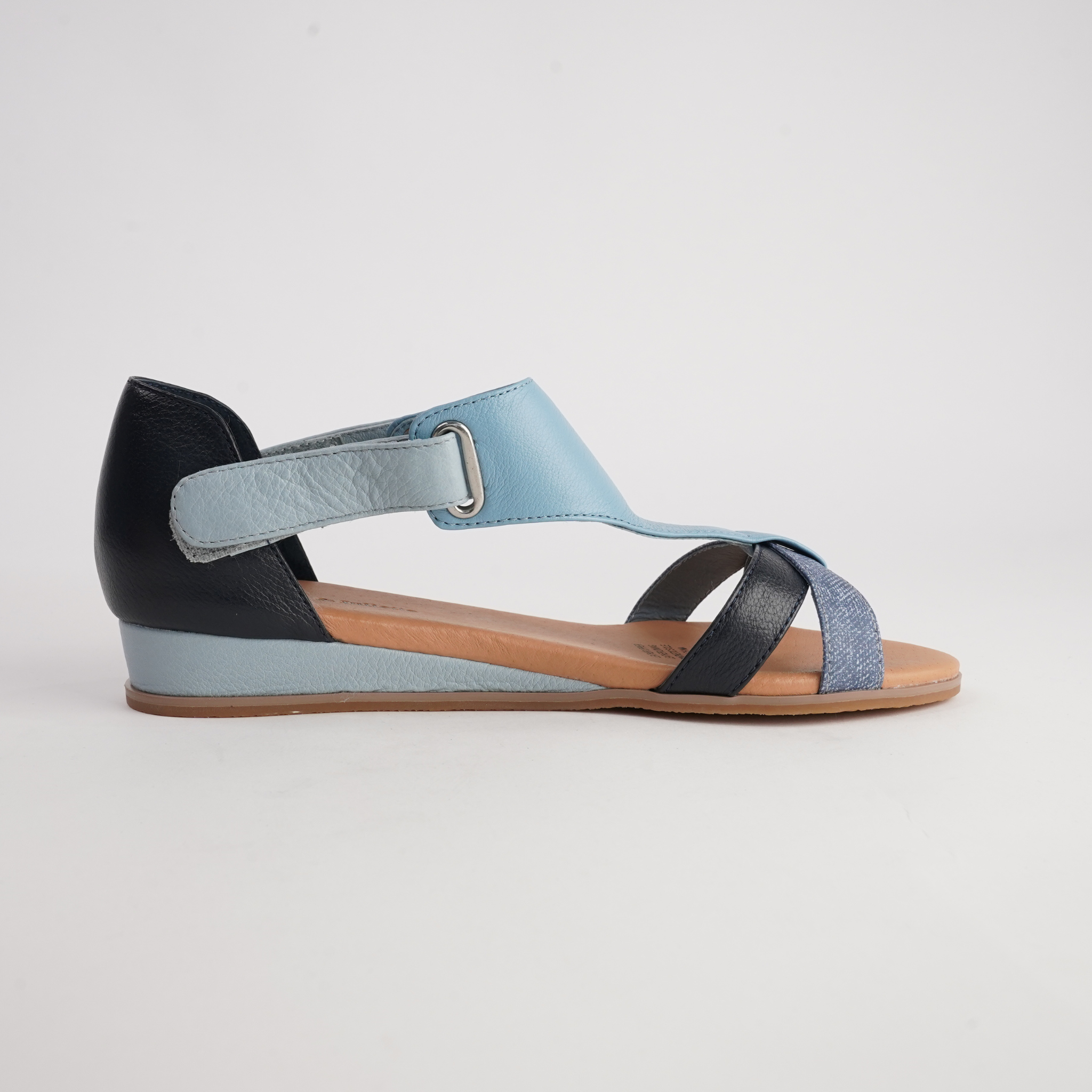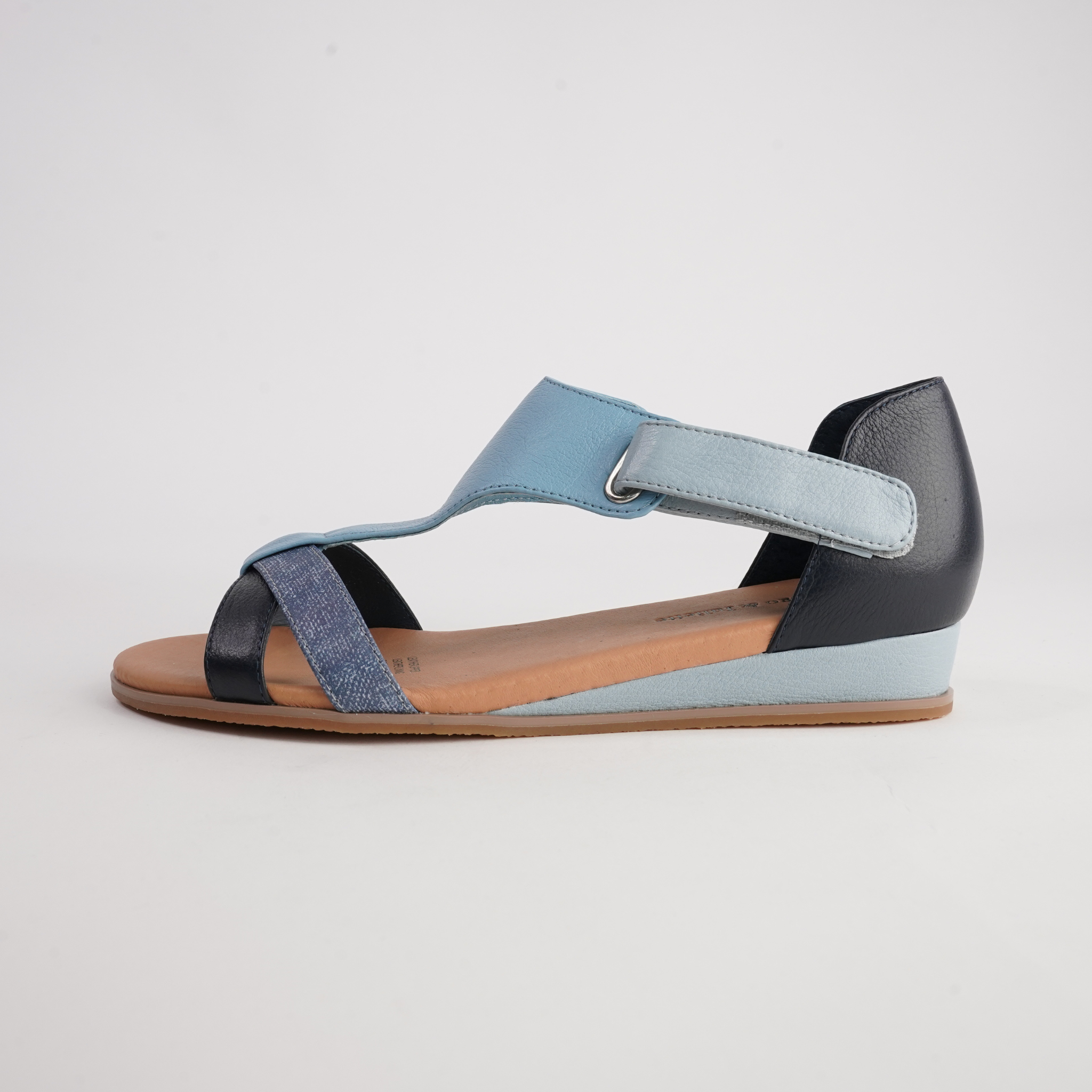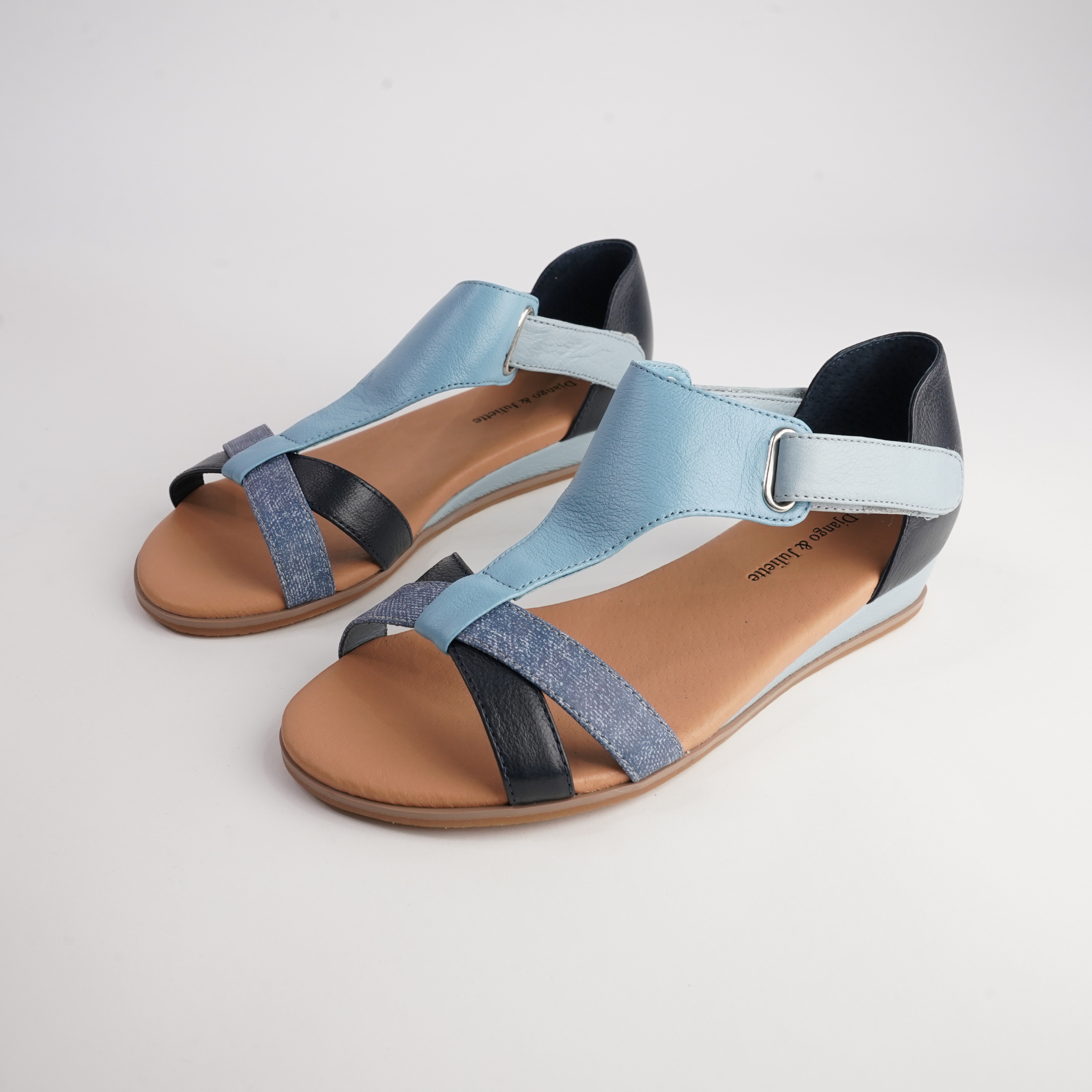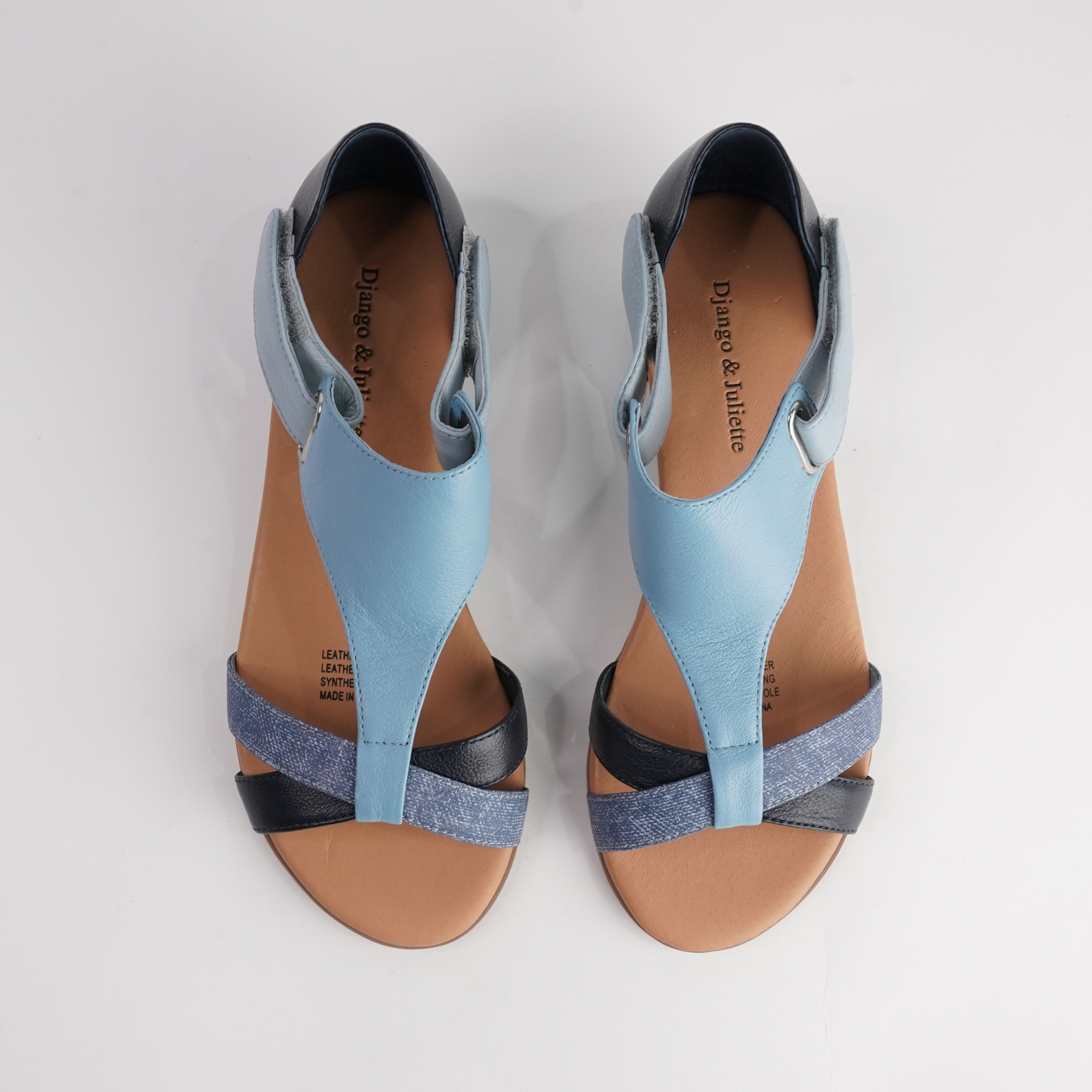 Add a splash of cool-toned colour to your summer wardrobe with the Hayzel Denim Multi Leather Sandals by Django & Juliette. Designed with a mix of denim blue, sky blue, and navy leather straps, these sandals strike the perfect balance between casual and chic. The velcro ankle strap ensures easy fastening, while the cushioned footbed and low wedge heel keep you comfortable all day.