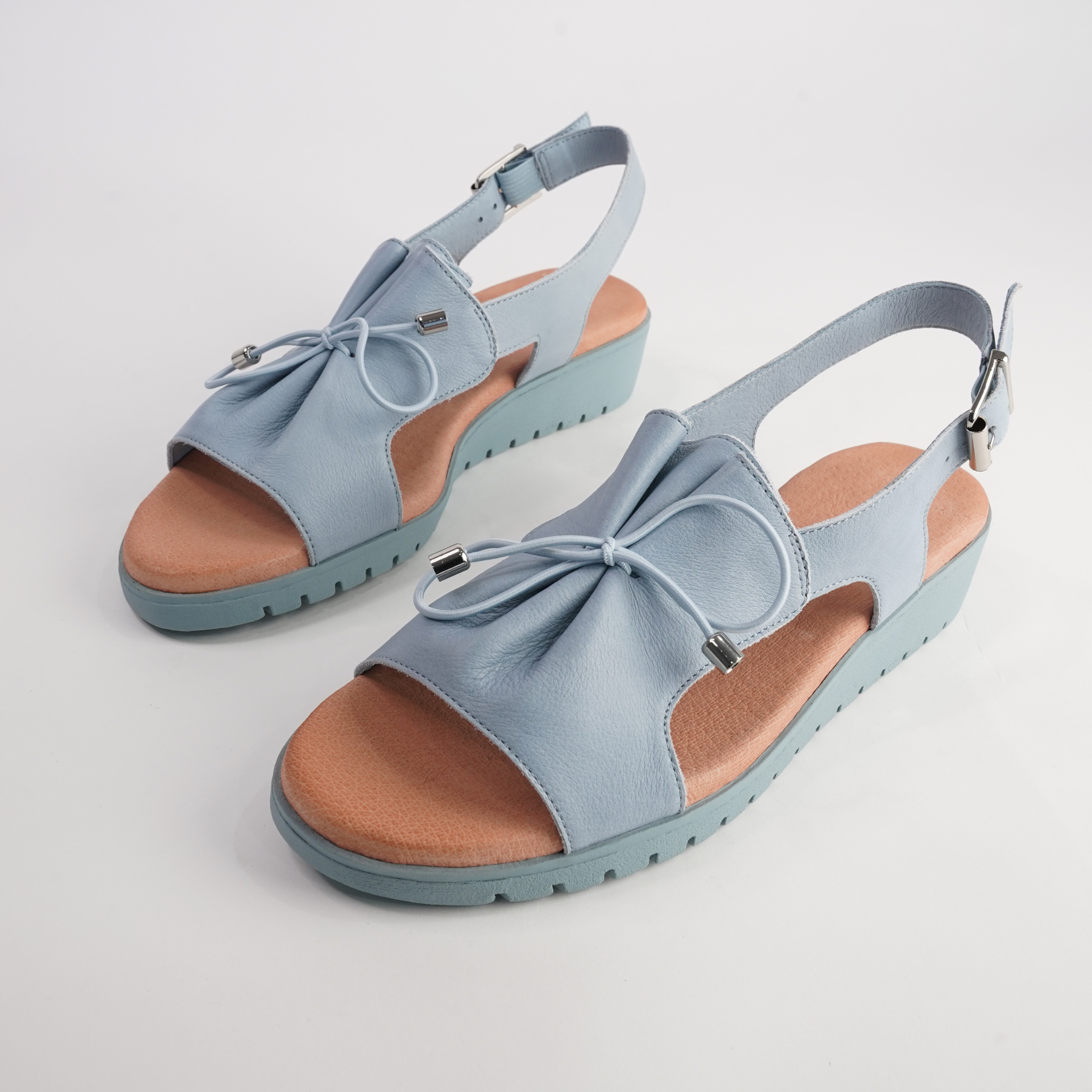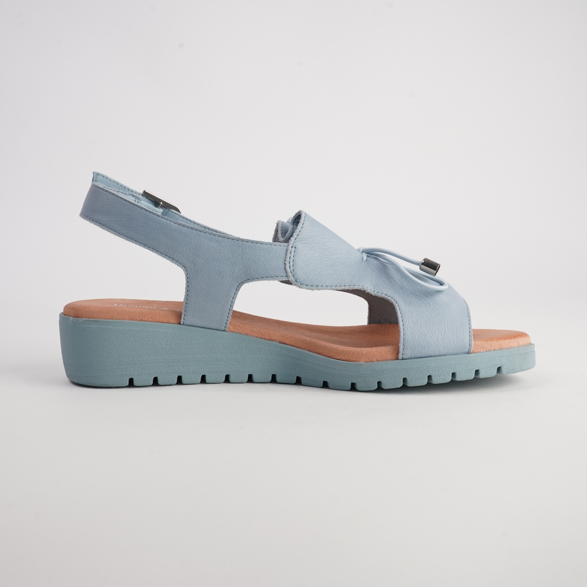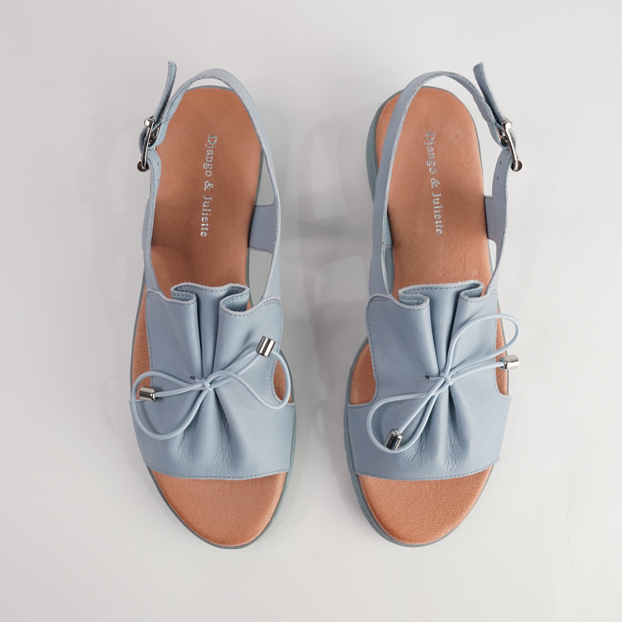 Embrace summer sophistication with the Malika Denim wedge sandal by Django & Juliette. This chic footwear effortlessly blends comfort and flair, featuring a 2cm denim-coloured wedge, a plush padded footbed, and an adjustable slingback strap for a secure fit. The sophisticated ruche tie-up upper adds a touch of allure to your ensemble. Embrace the summertime vibes by pairing these sandals with your favourite outfits.