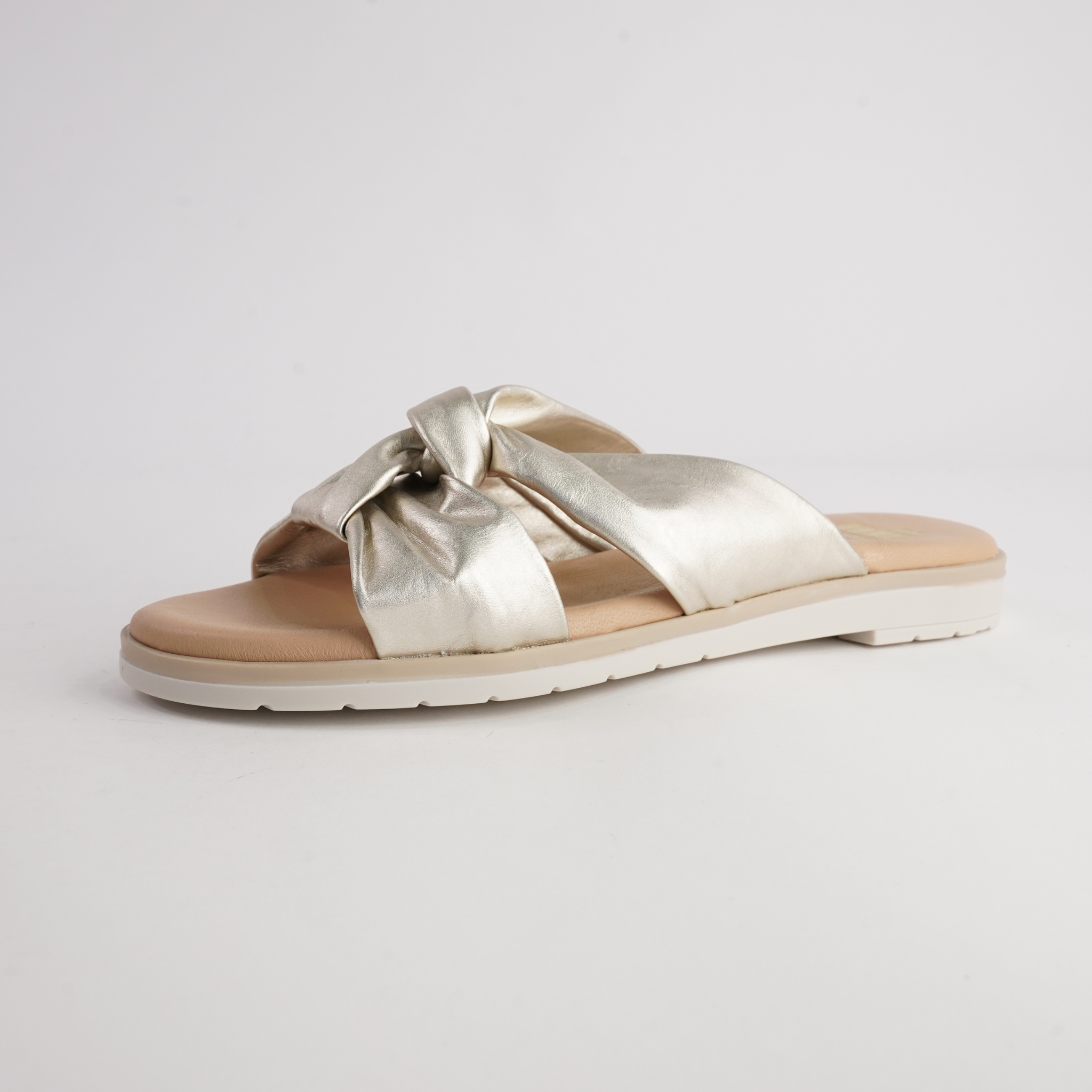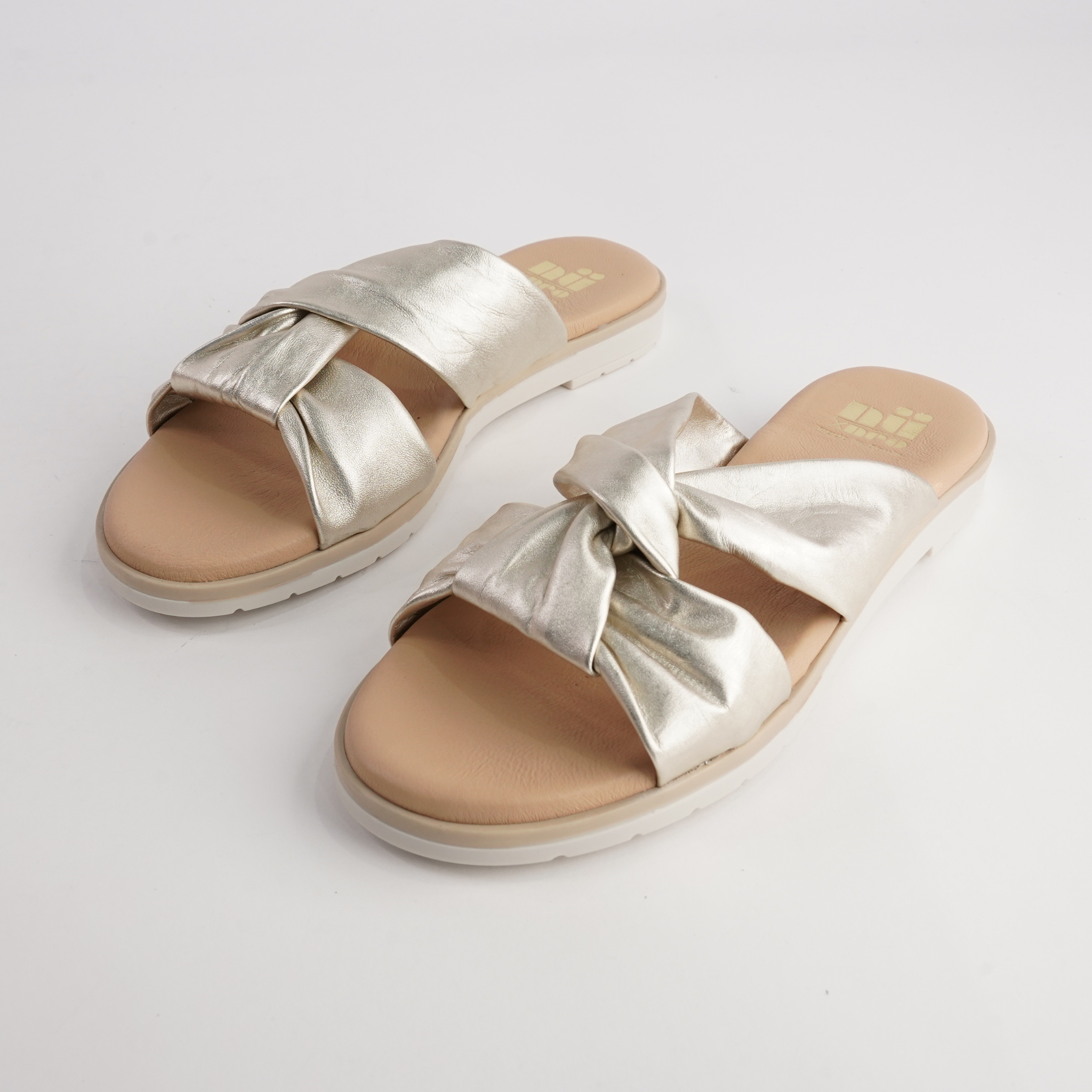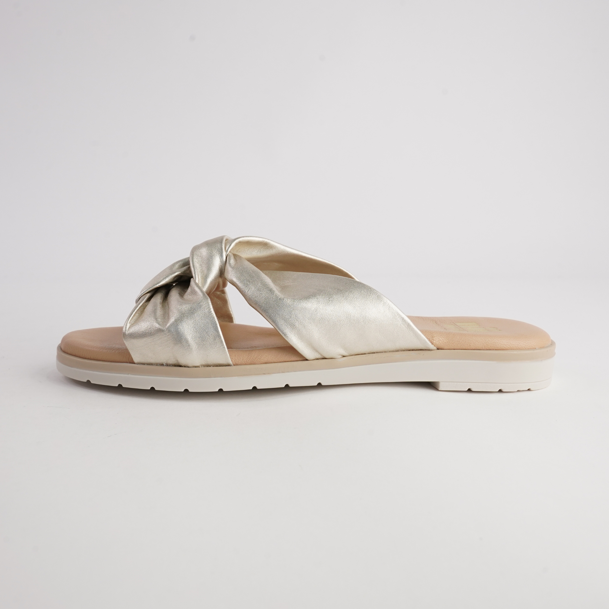 Effortlessly chic and endlessly wearable, the Winona Slides by Nu by Neo blend modern simplicity with soft sophistication. Crafted from platino leather, the twisted front straps add a sculptural touch while providing a comfortable, secure fit. Set on a lightweight, cushioned sole, these slides are perfect for relaxed days or elevated casual looks — the ideal companion for effortless summer style.