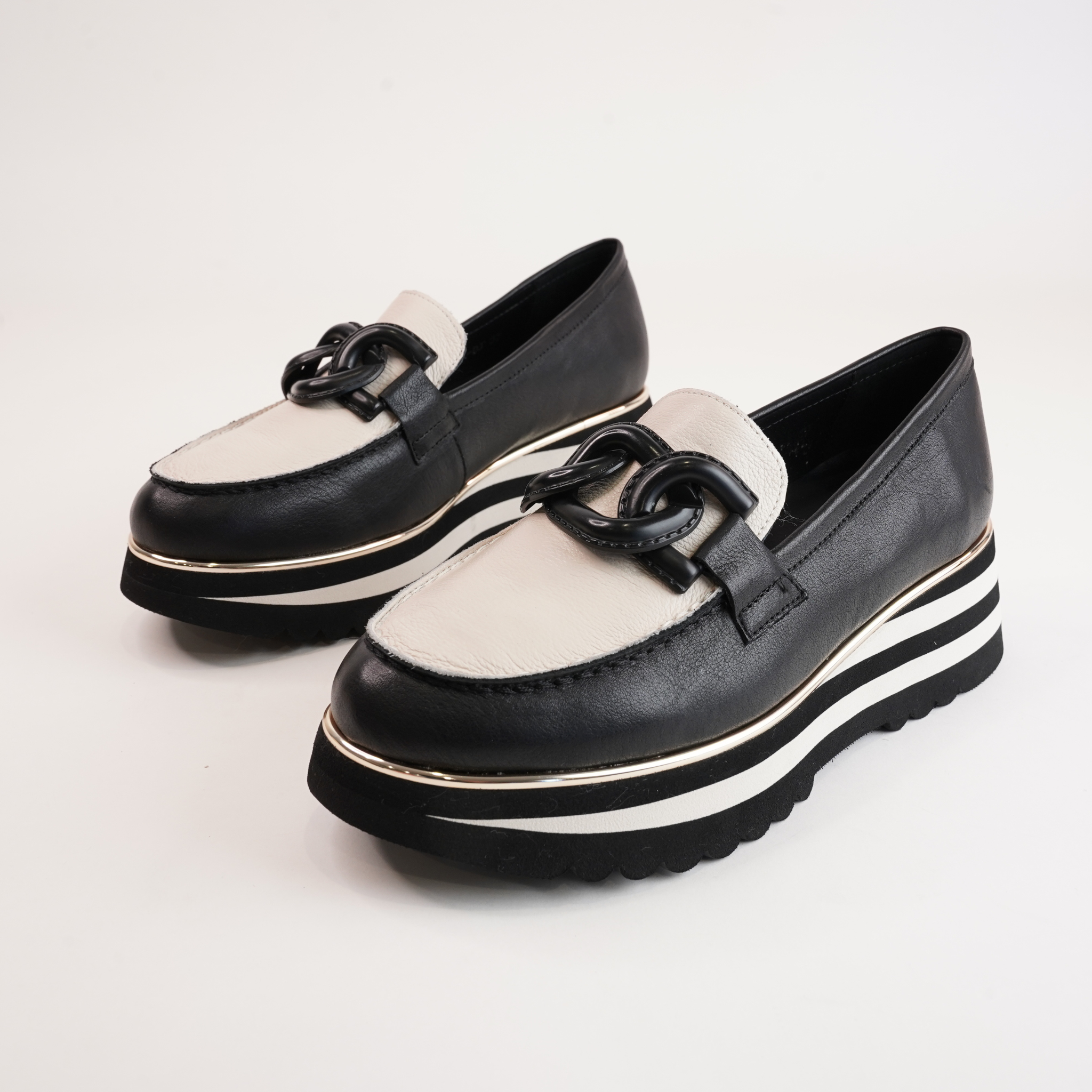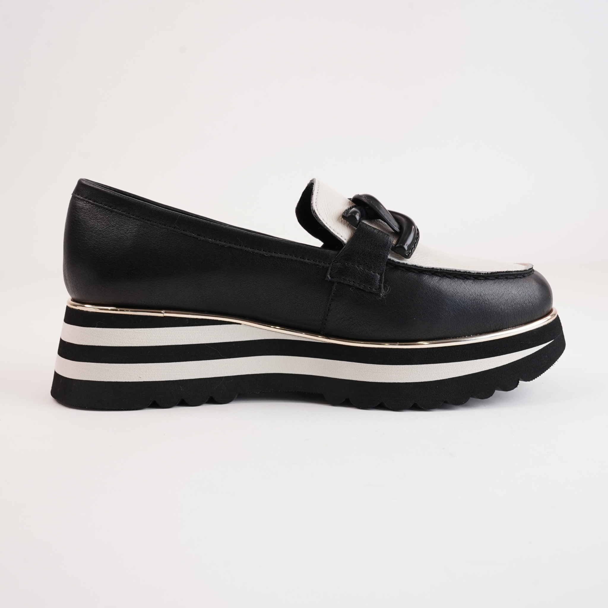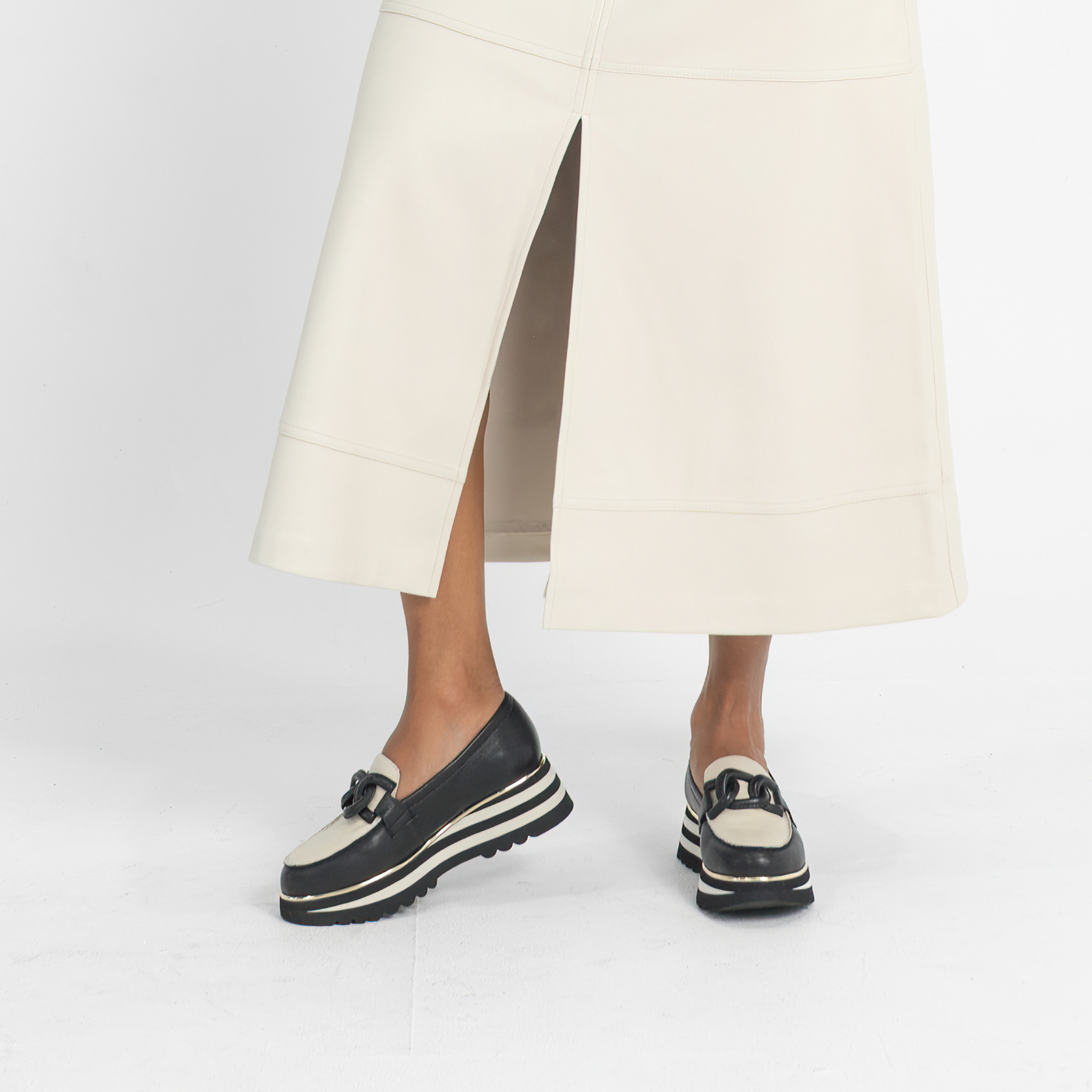 Add a bold finish to your everyday wardrobe with the Ealia loafers by Django & Juliette. Featuring a striking black and milk colourway, these statement shoes blend contemporary design with effortless comfort. The chunky striped platform sole gives you height without compromising on stability, while the oversized chain detail adds a fashion-forward edge. Perfect for work-to-weekend styling.