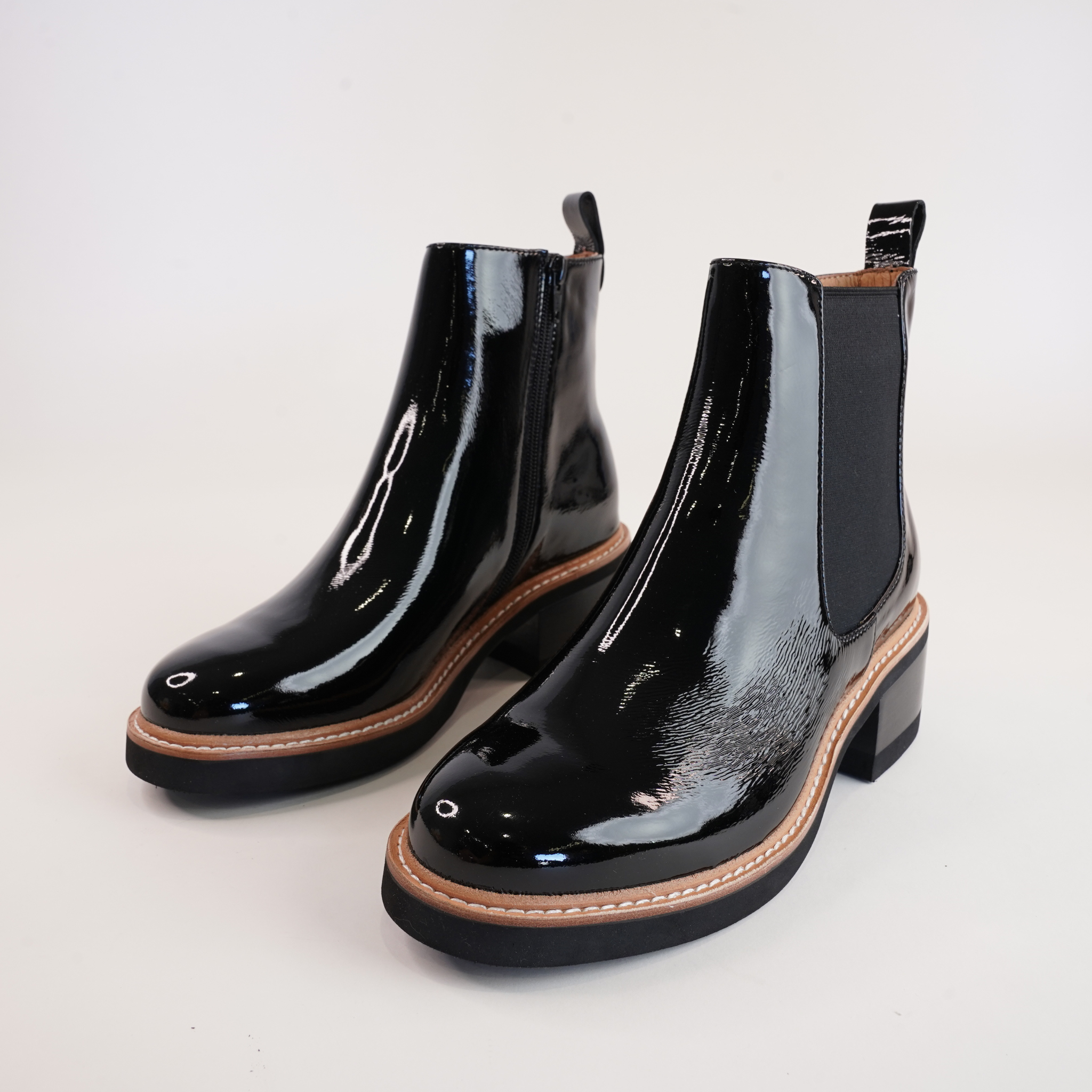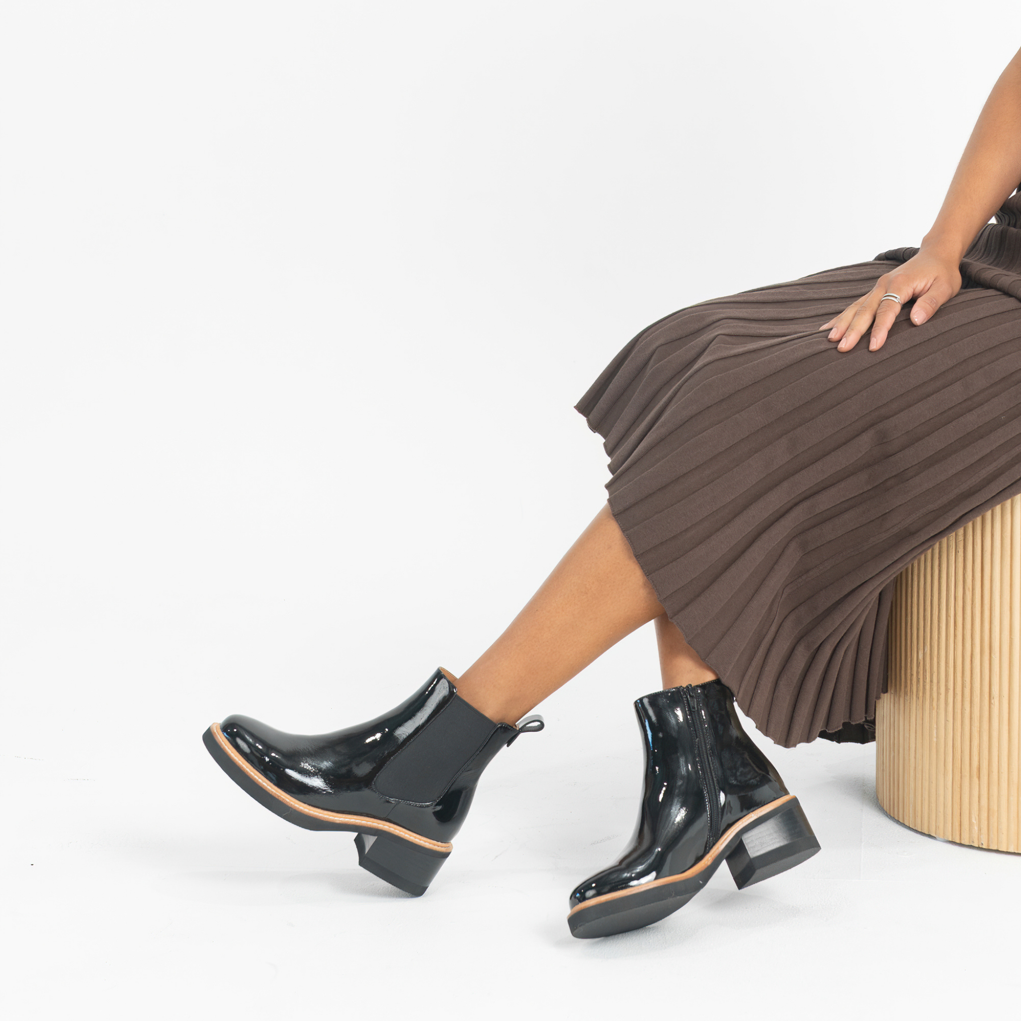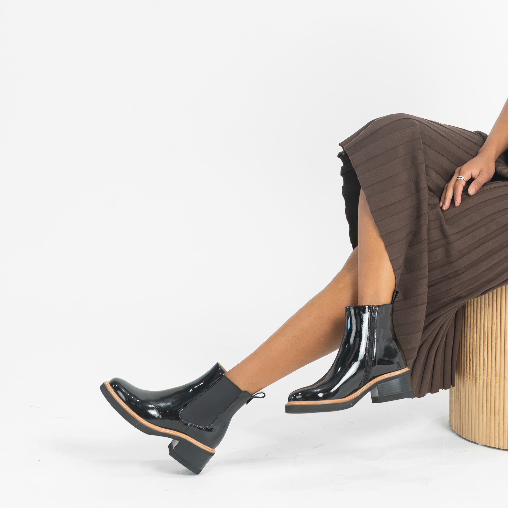 Sleek, chic, and effortlessly versatile – the Patrol Black Patent Leather Ankle Boots by Bresley bring a modern edge to a classic Chelsea boot. Their glossy patent leather upper, pull-on design, and supportive block heel make them the perfect choice for polished everyday wear.