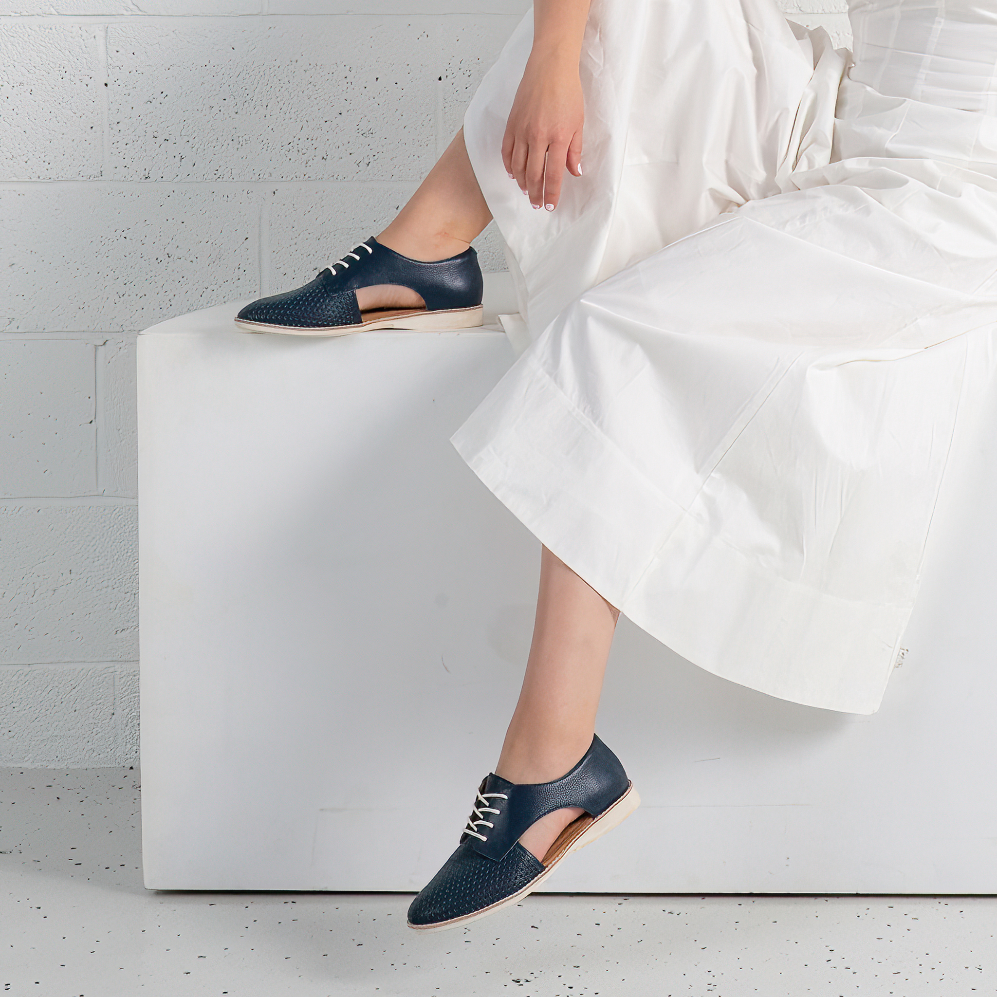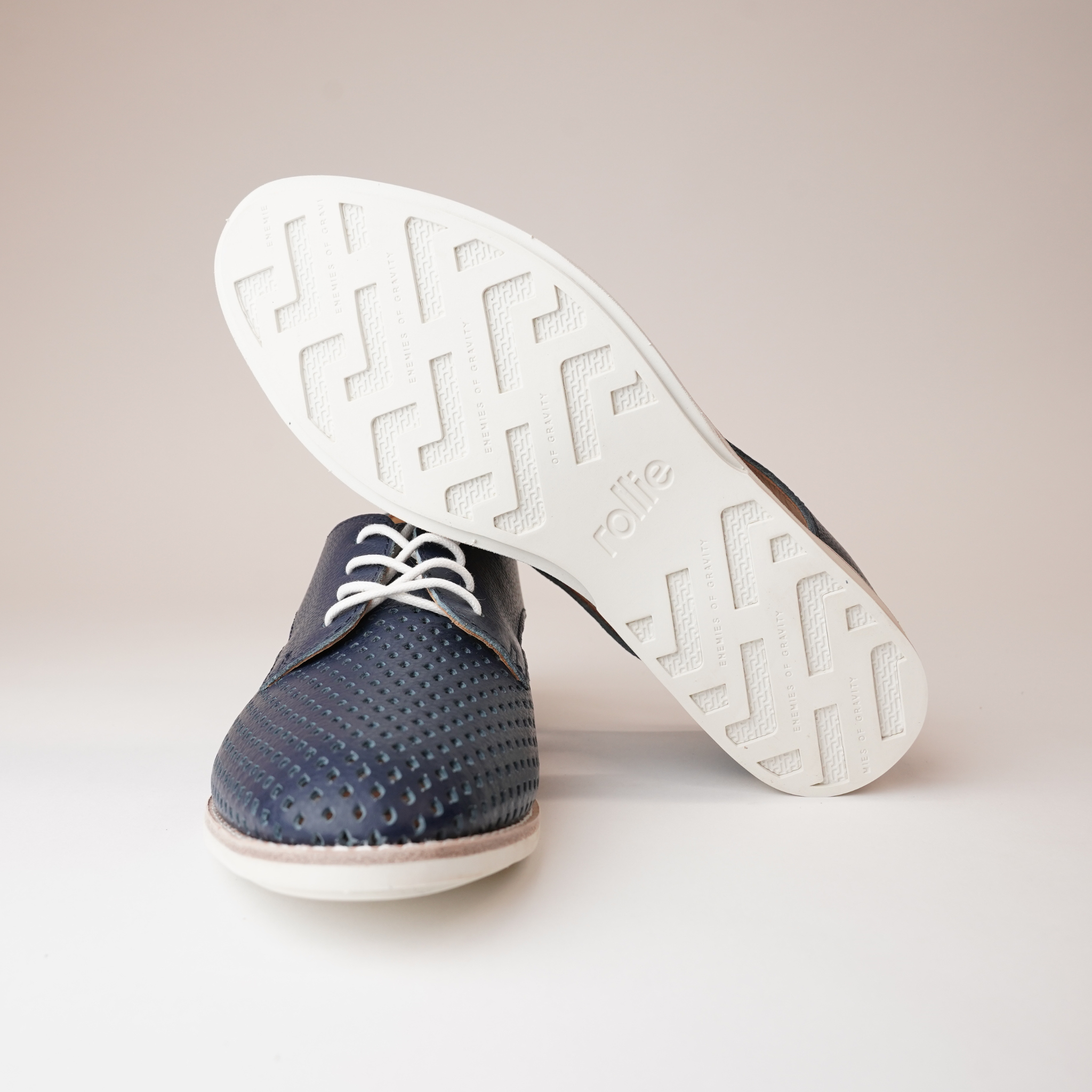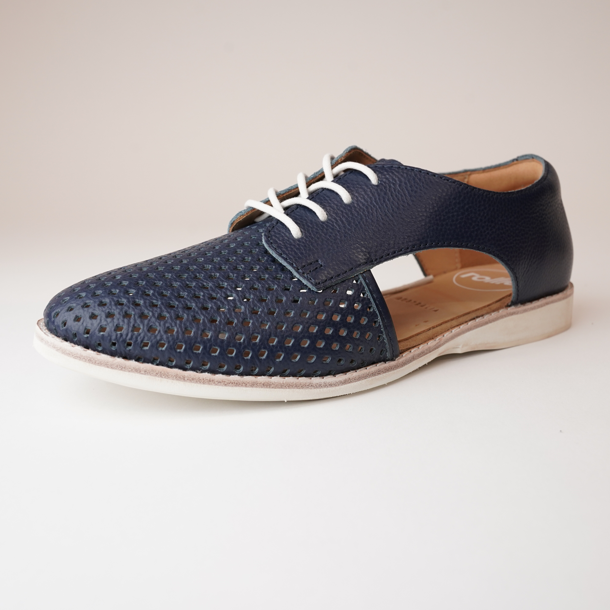 The Sidecut Punch Navy Tumble Lace Up Flats by Rollie offer breathable comfort with style. Featuring a perforated leather upper and side cutouts for airflow, they’re perfect for warm weather. With a cushioned footbed and lightweight sole, these flats ensure all-day comfort. The lace-up design provides a secure fit, making them ideal for both casual and semi-formal looks.