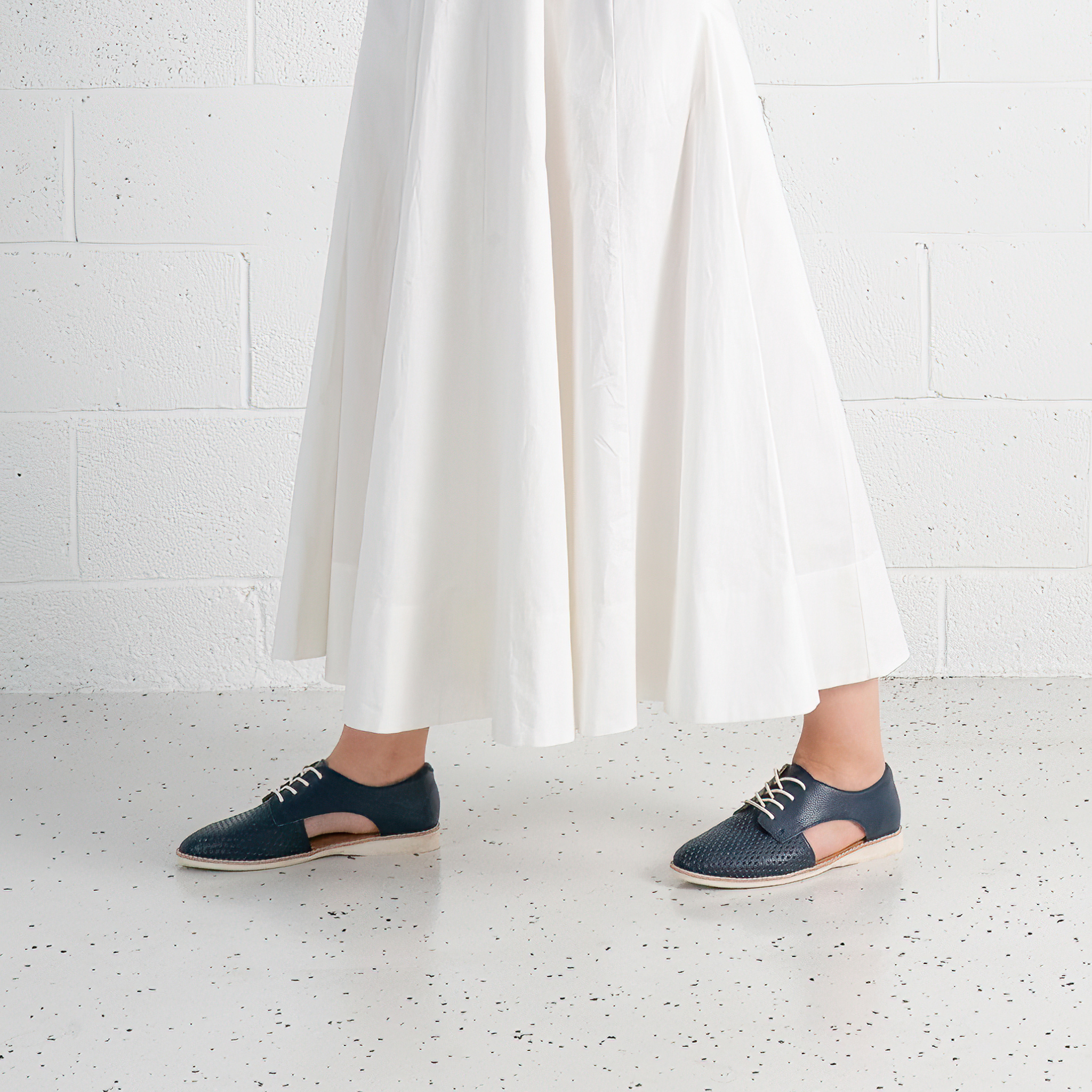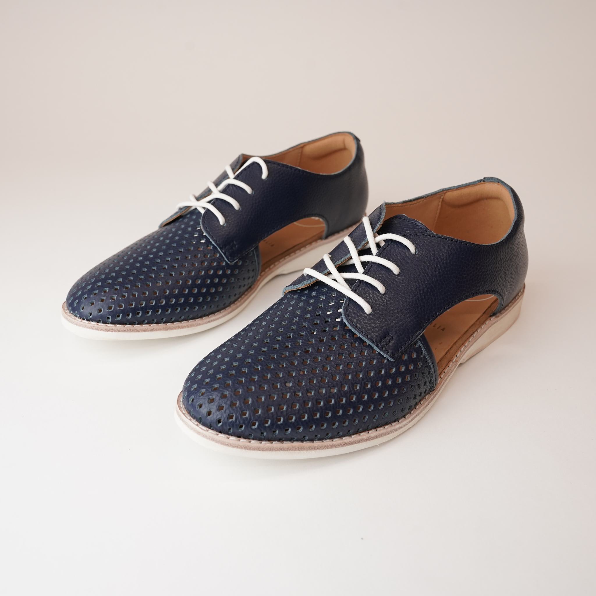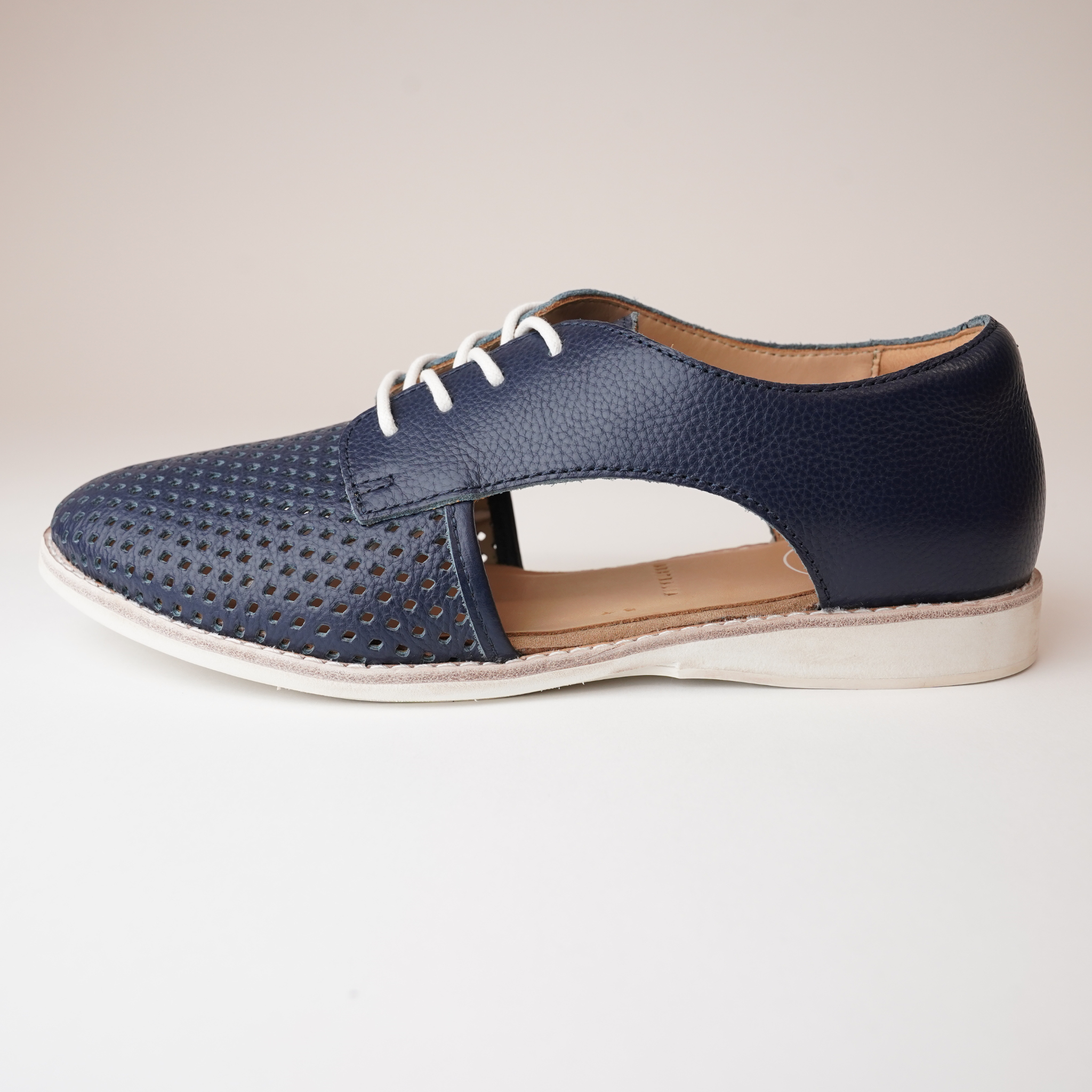 The Sidecut Punch Navy Tumble Lace Up Flats by Rollie offer breathable comfort with style. Featuring a perforated leather upper and side cutouts for airflow, they’re perfect for warm weather. With a cushioned footbed and lightweight sole, these flats ensure all-day comfort. The lace-up design provides a secure fit, making them ideal for both casual and semi-formal looks.