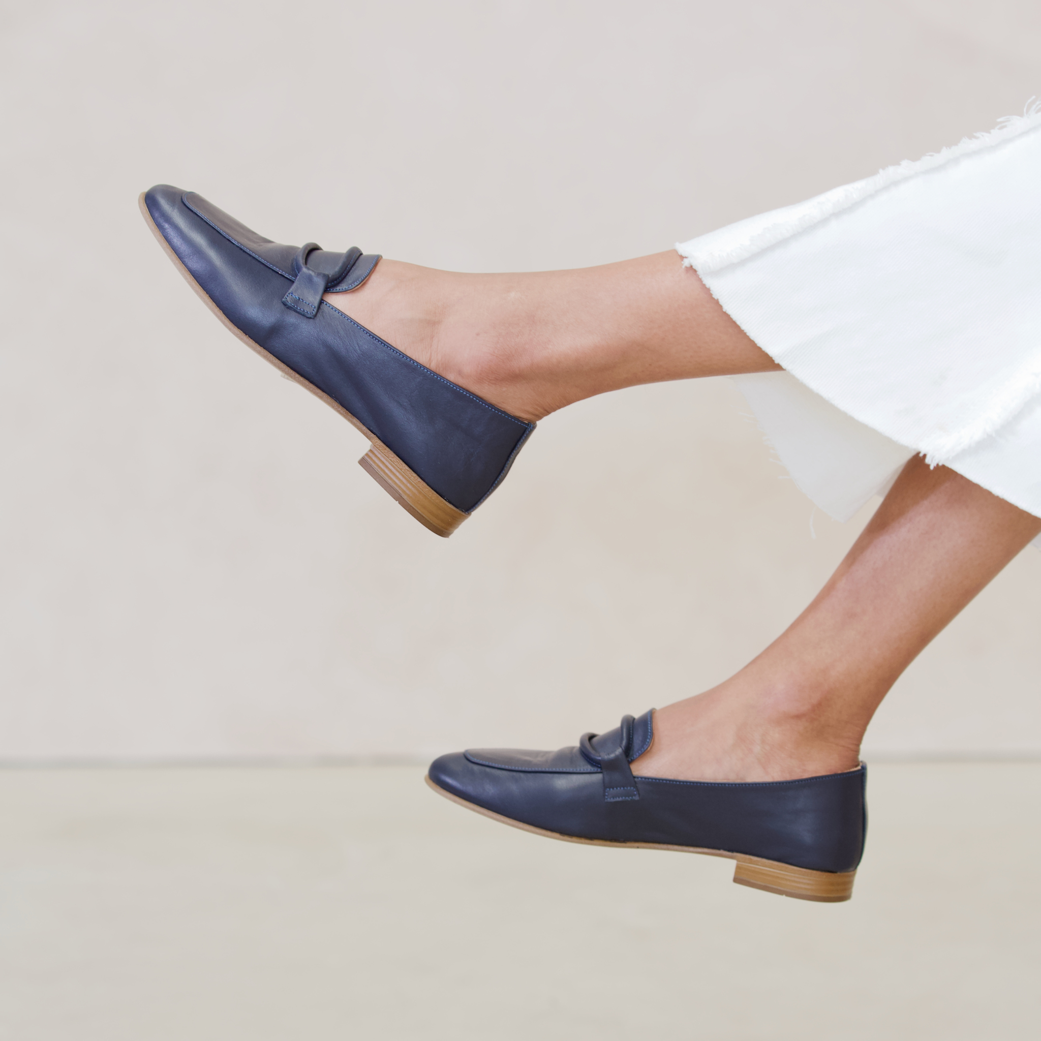 The Joanne Navy loafers by Sala are the work wardrobe upgrade you've been looking for. These leather loafers will be perfect for an earthy or neutral-heavy wardrobe. They'll go beautifully with cream tones, beige, brown and deep reds, oranges and greens.
