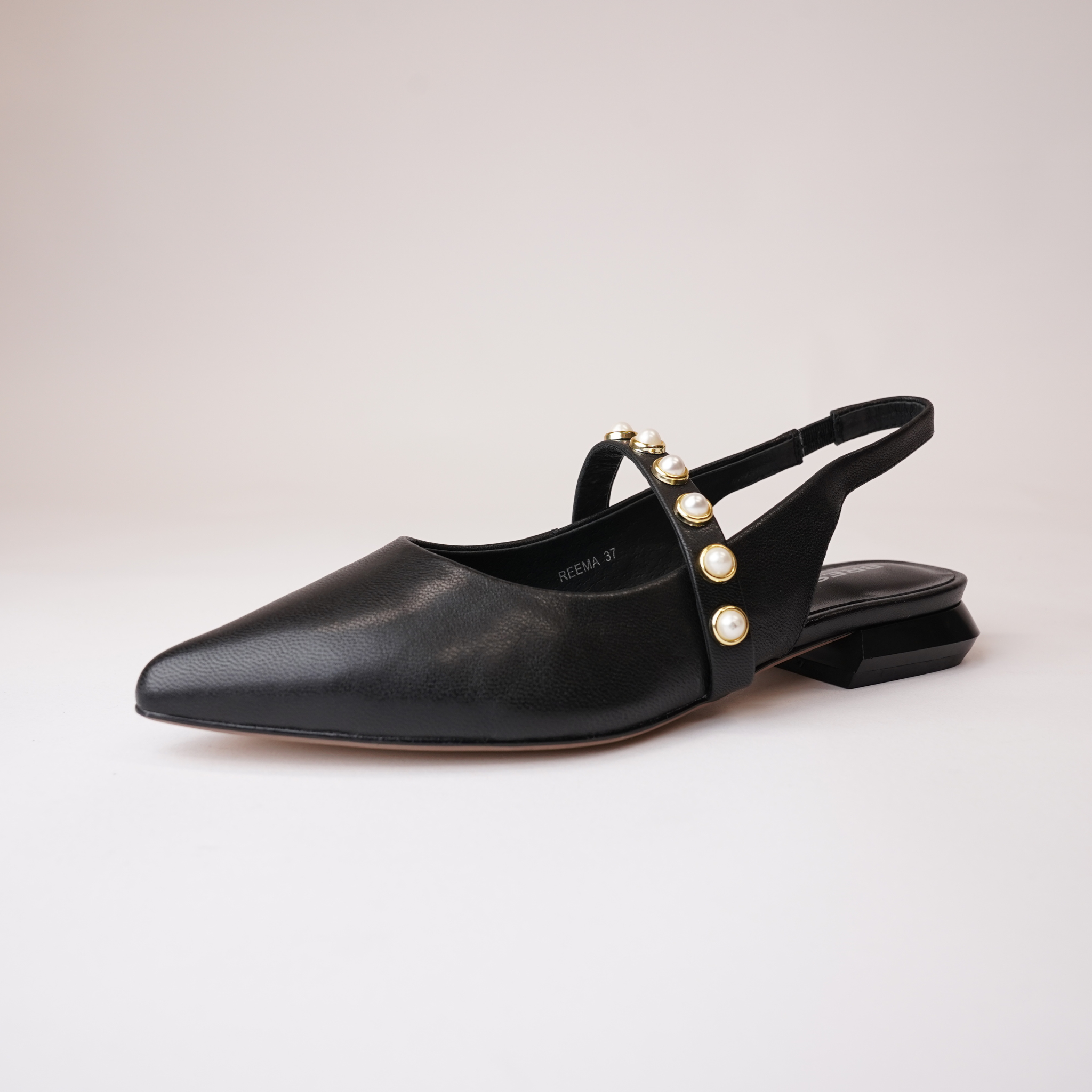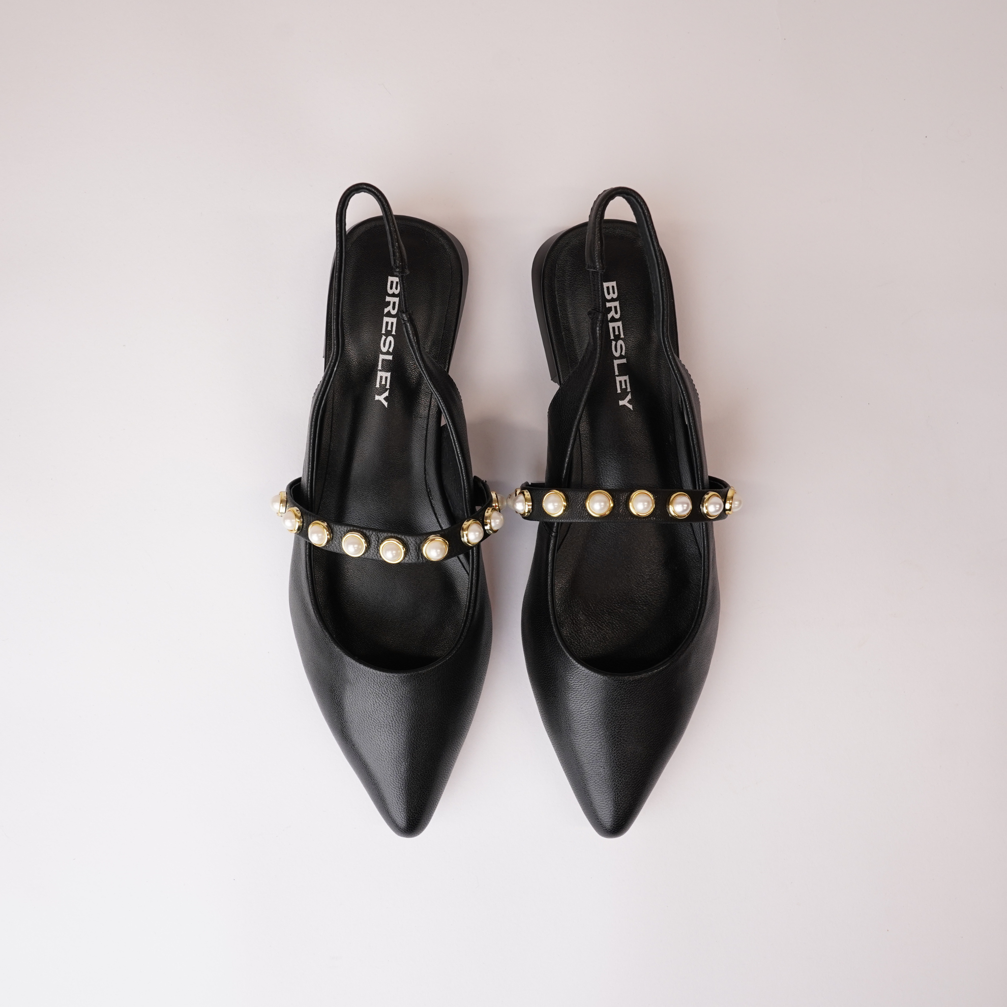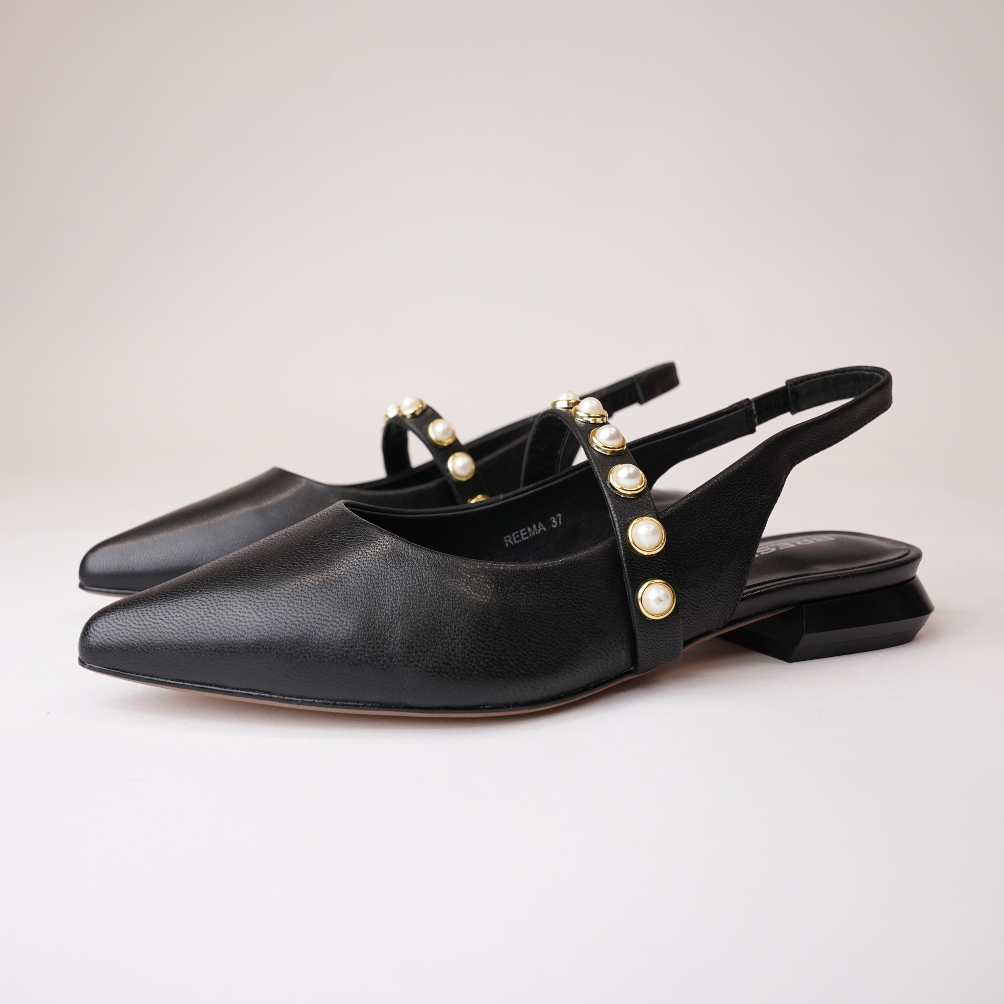 Add some charm to your outfit with the Reema Black Leather Flats by Bresley! These dress flats feature a sleek leather upper, comfortable leather lining, and a versatile 2.5cm heel. The pearl trim on the instep adds a touch of elegance to these must-have shoes.