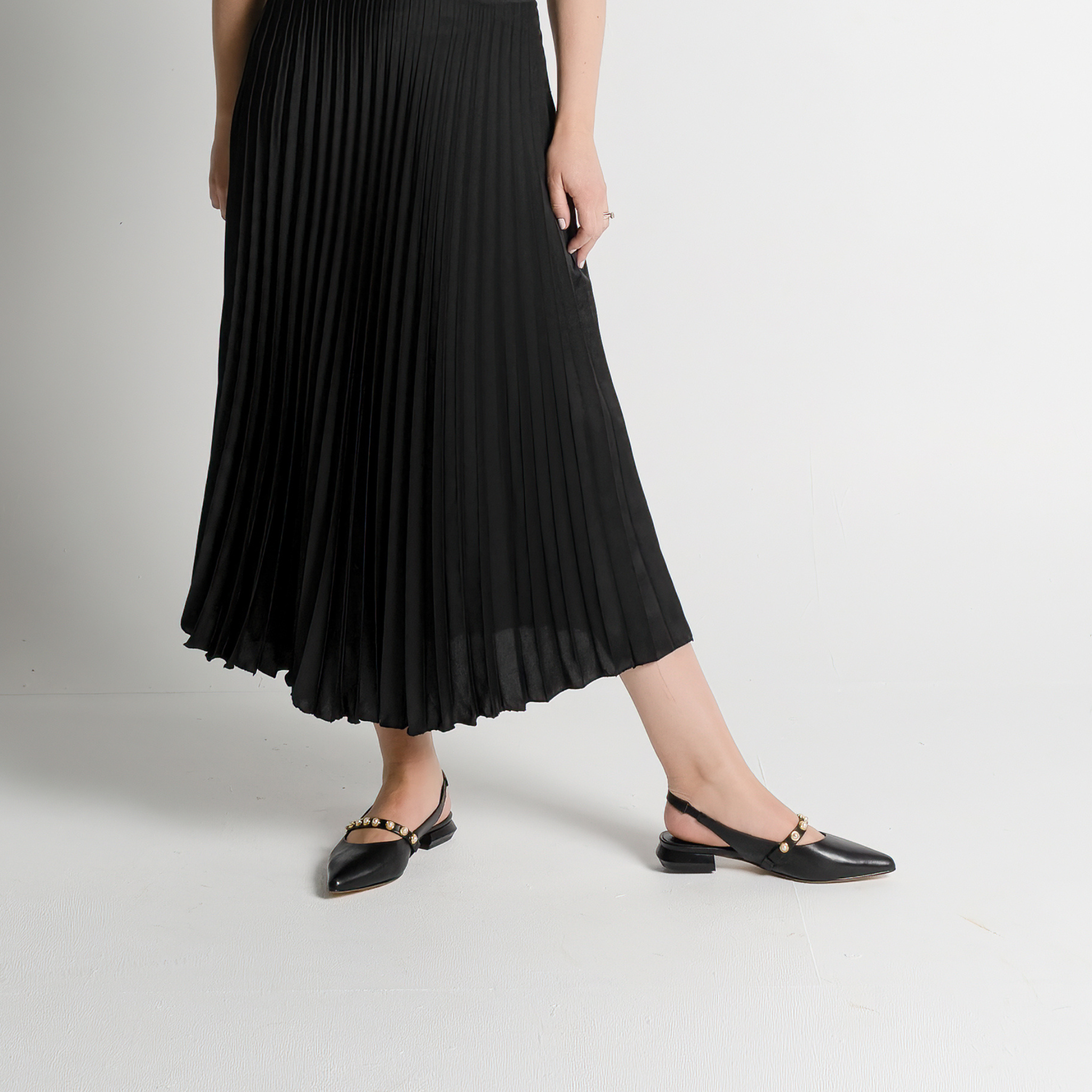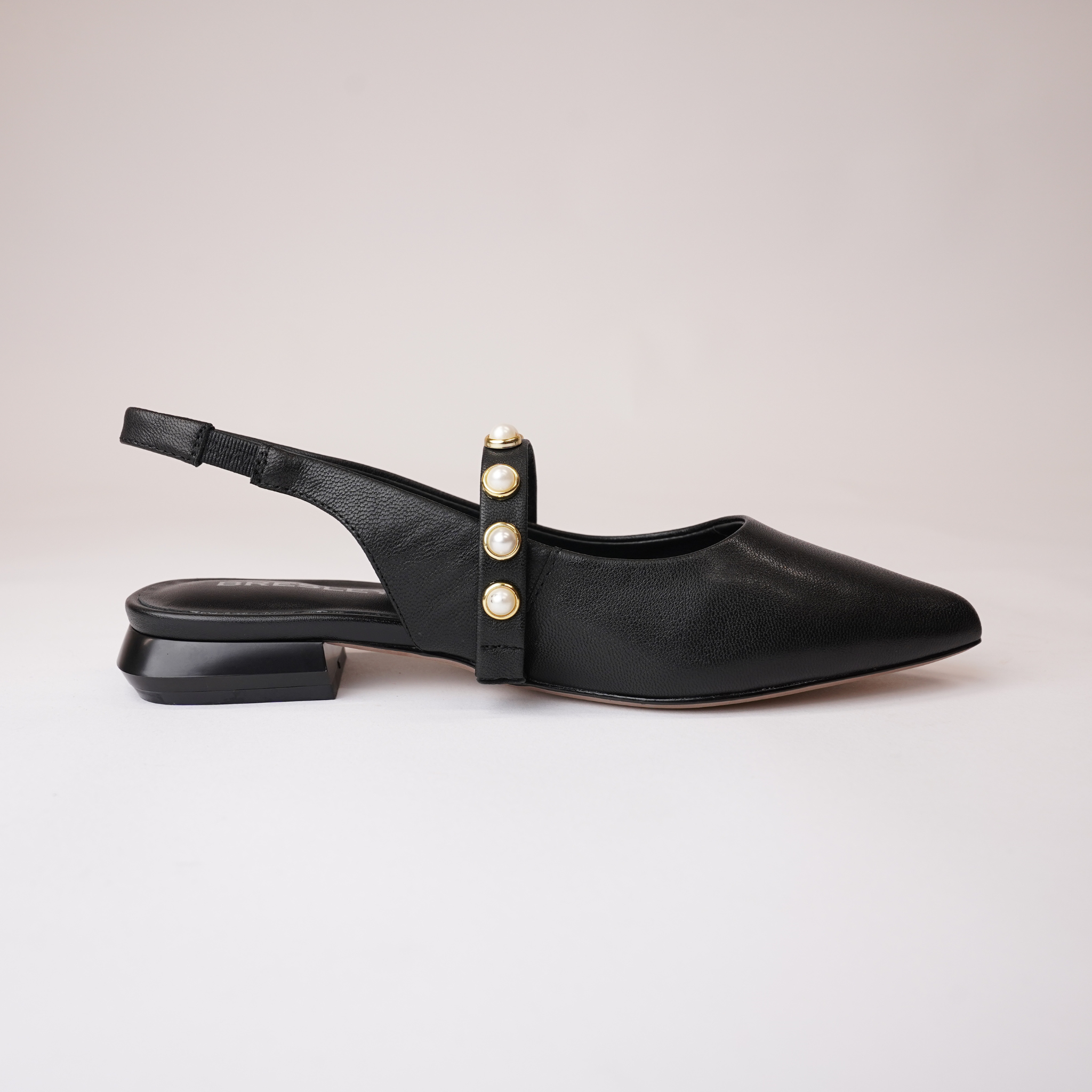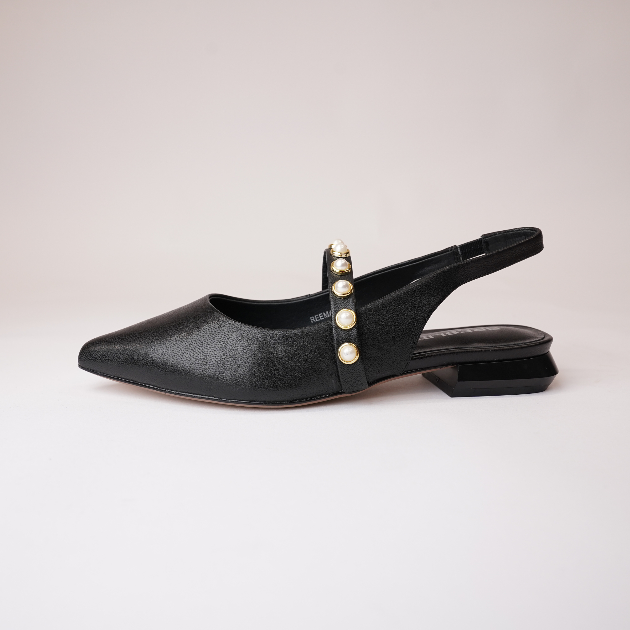 Add some charm to your outfit with the Reema Black Leather Flats by Bresley! These dress flats feature a sleek leather upper, comfortable leather lining, and a versatile 2.5cm heel. The pearl trim on the instep adds a touch of elegance to these must-have shoes.