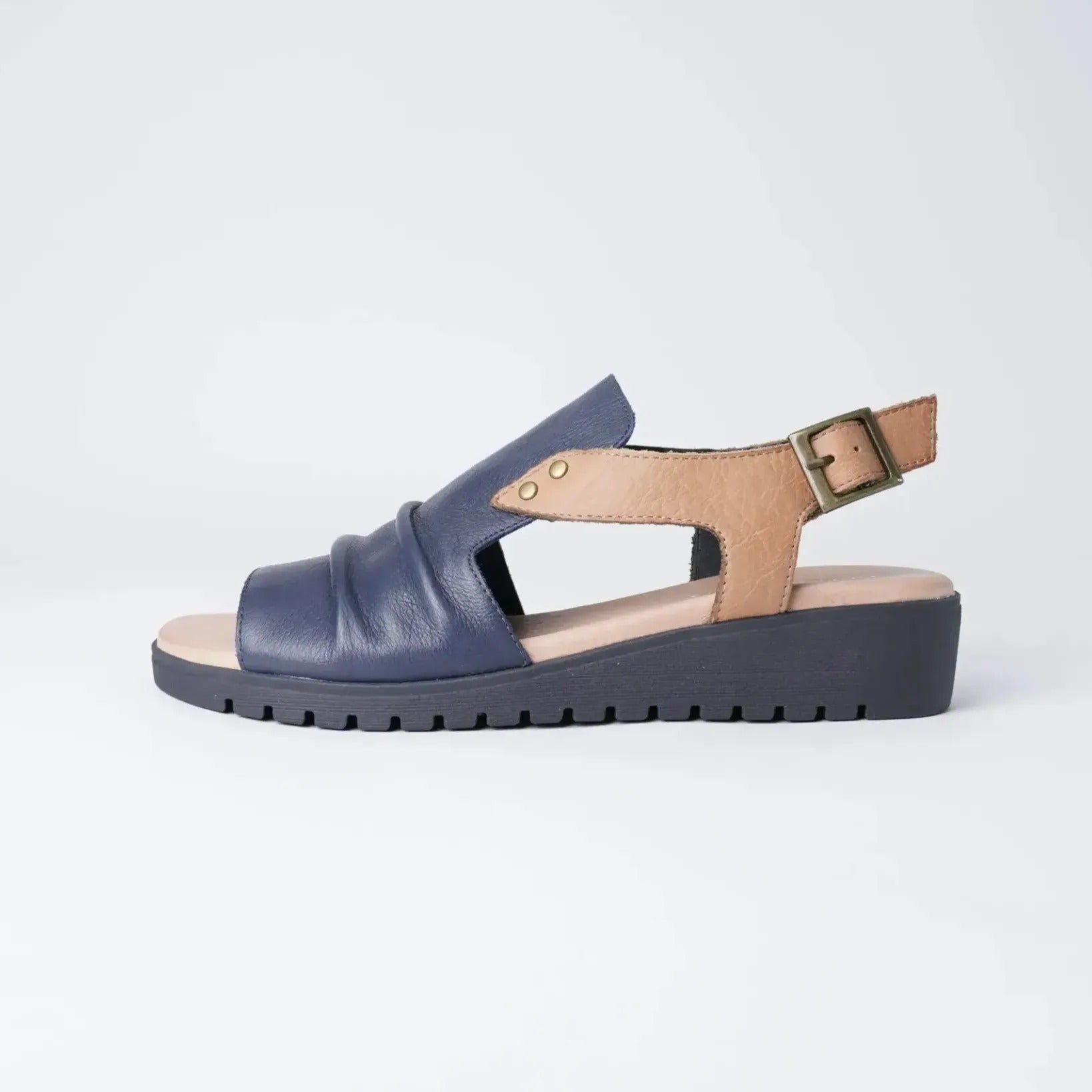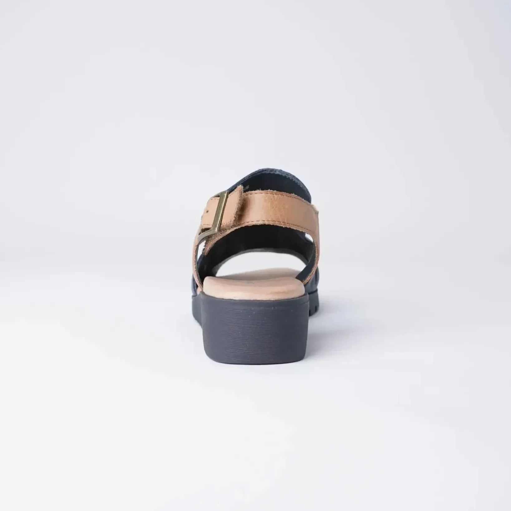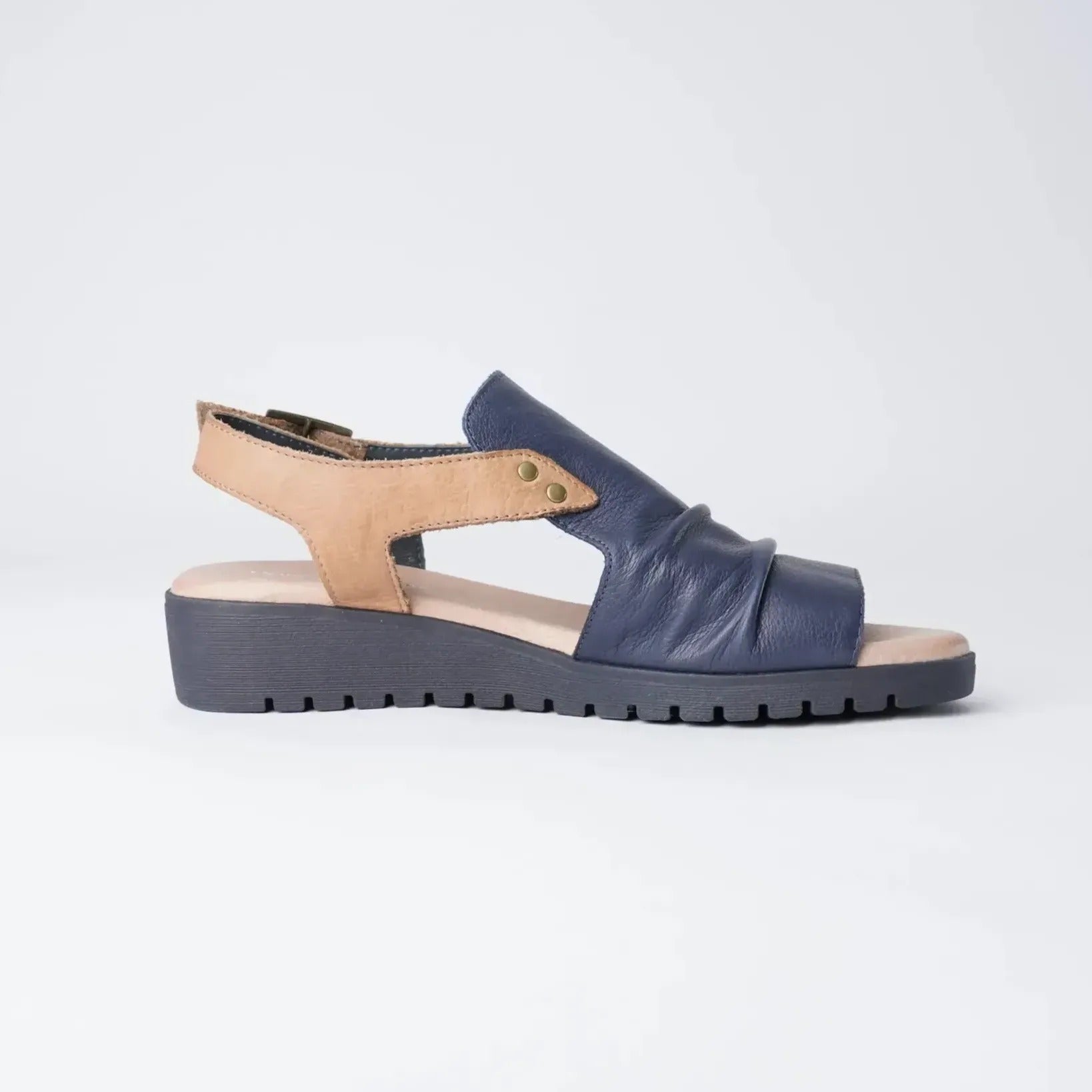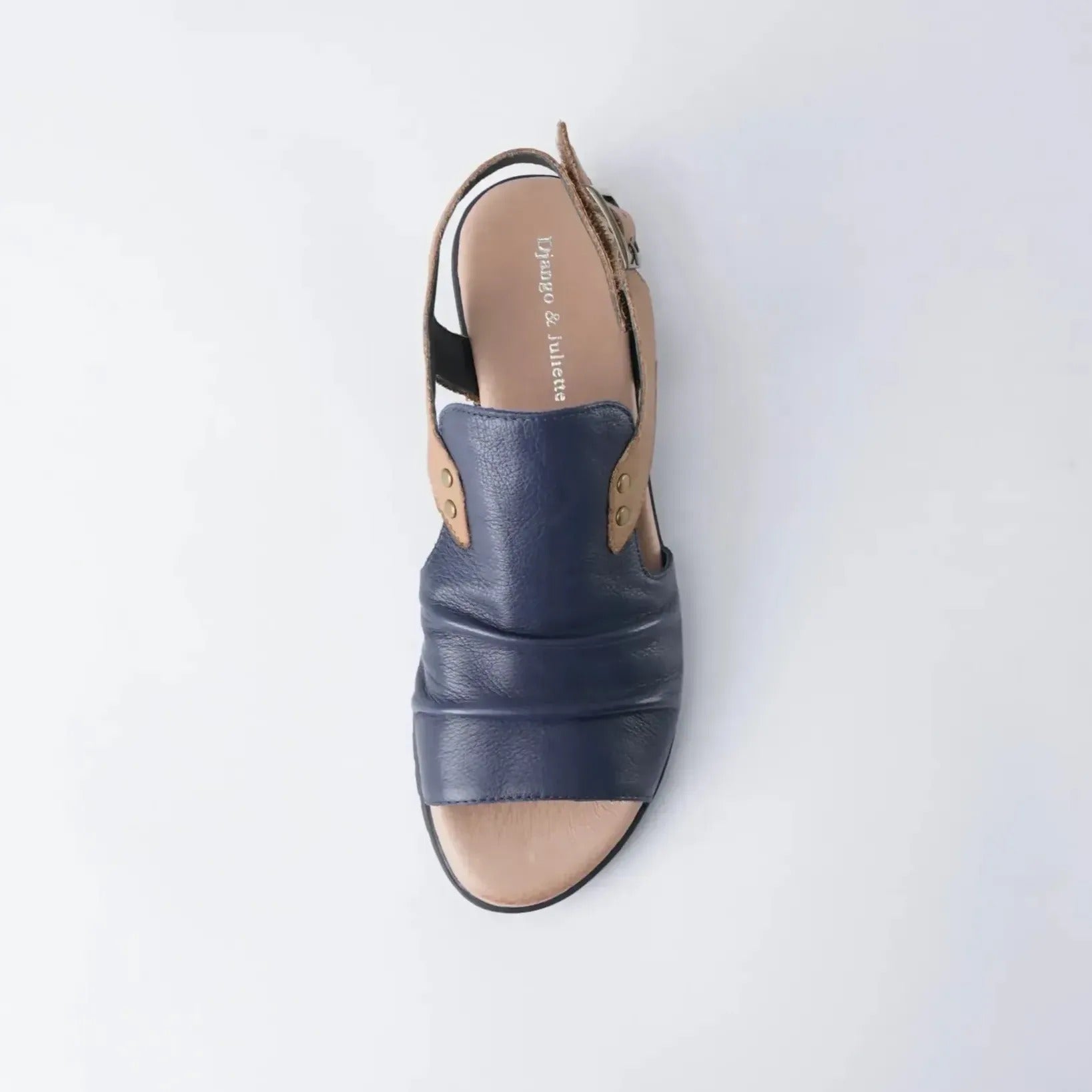 The Madis Navy/Tan sandals by Django & Juliette sit on a low 3.5cm wedge heel and support the foot with a padded insole. These low-heeled sandals feature a dark navy upper with tan accents on the straps. These casual sandals are perfect for pairing with everything from jeans to dresses.