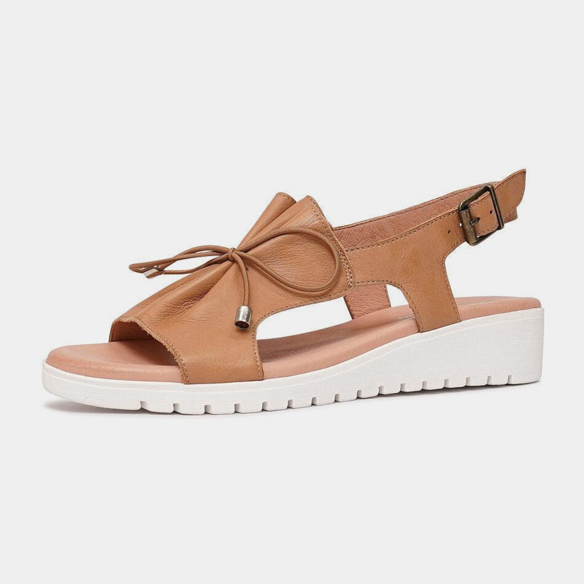 Malika in Dark Tan is a gorgeous wedge sandal that will quickly become a favourite in your summer wardrobe. This Django & Juliette shoe has a 2cm wedge, rubber sole and a padded footbed. Malika has a gorgeous upper with a ruche tie-up upper, and a slingback adjustable strap.