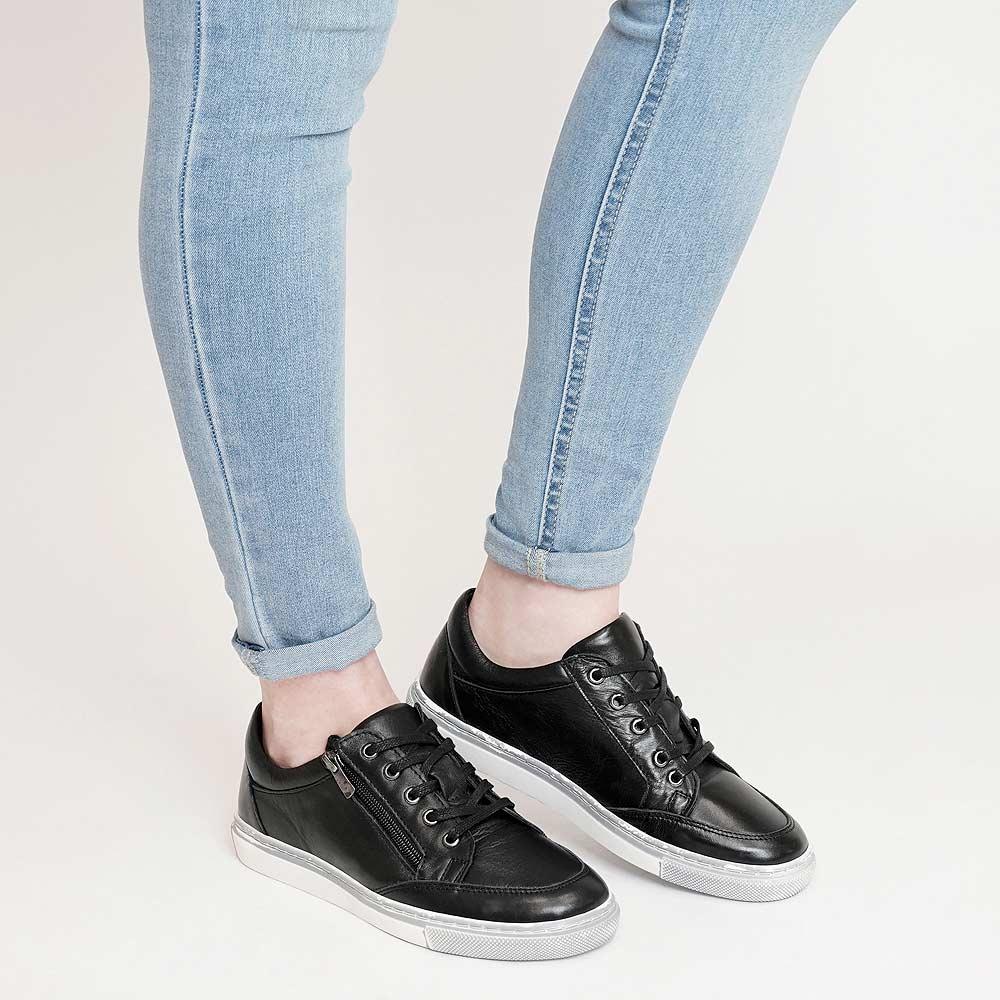 Ronnie Black by Sala is a smart casual sneaker. Wear your Ronnies as an everyday essential throughout all seasons. Ronnie has a lace-up front and also an easy access outer foot zipper. It features a padded footbed, super soft leather, a little bit of arch support and a treaded sole for grip. This sneaker also has a wide rounded toe leaving room for those broader across the width. This fashion-forward shoe mixes comfort, ease and style into the modern athleisure look.