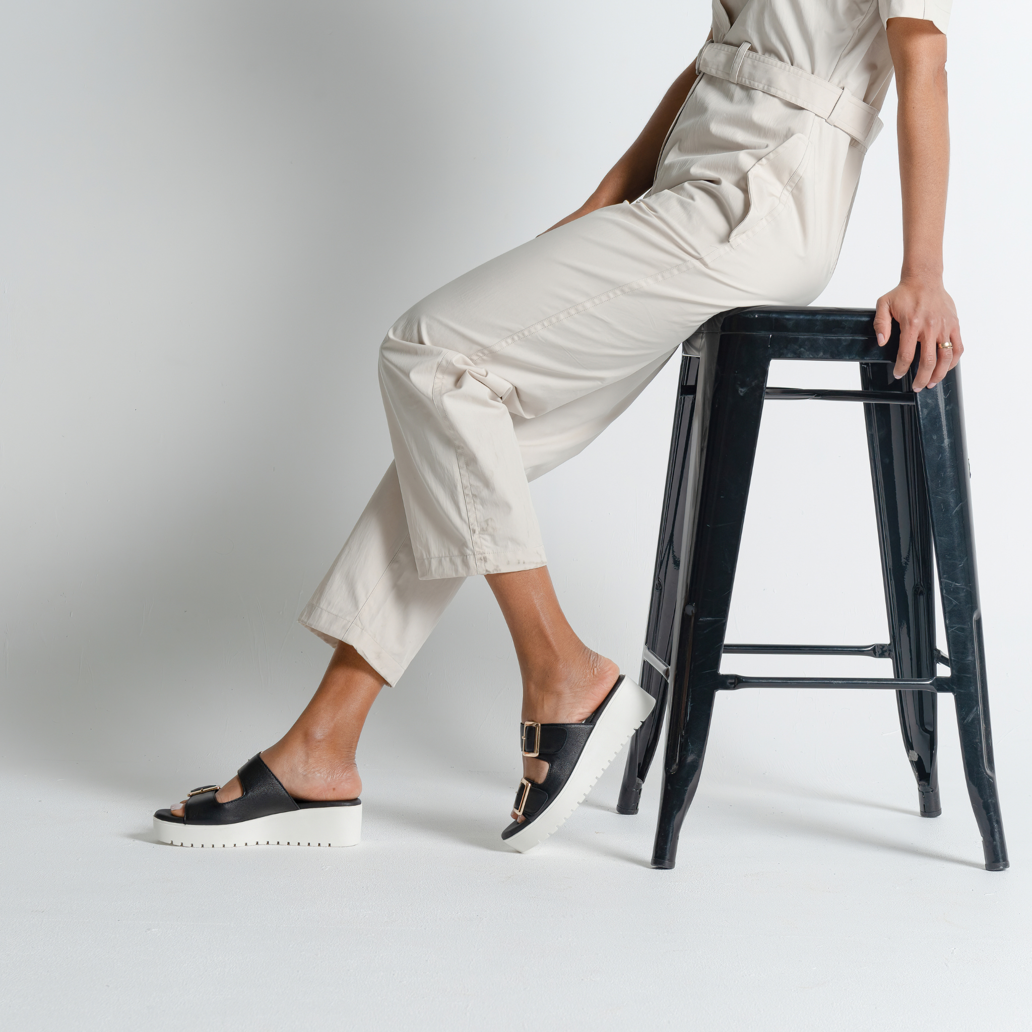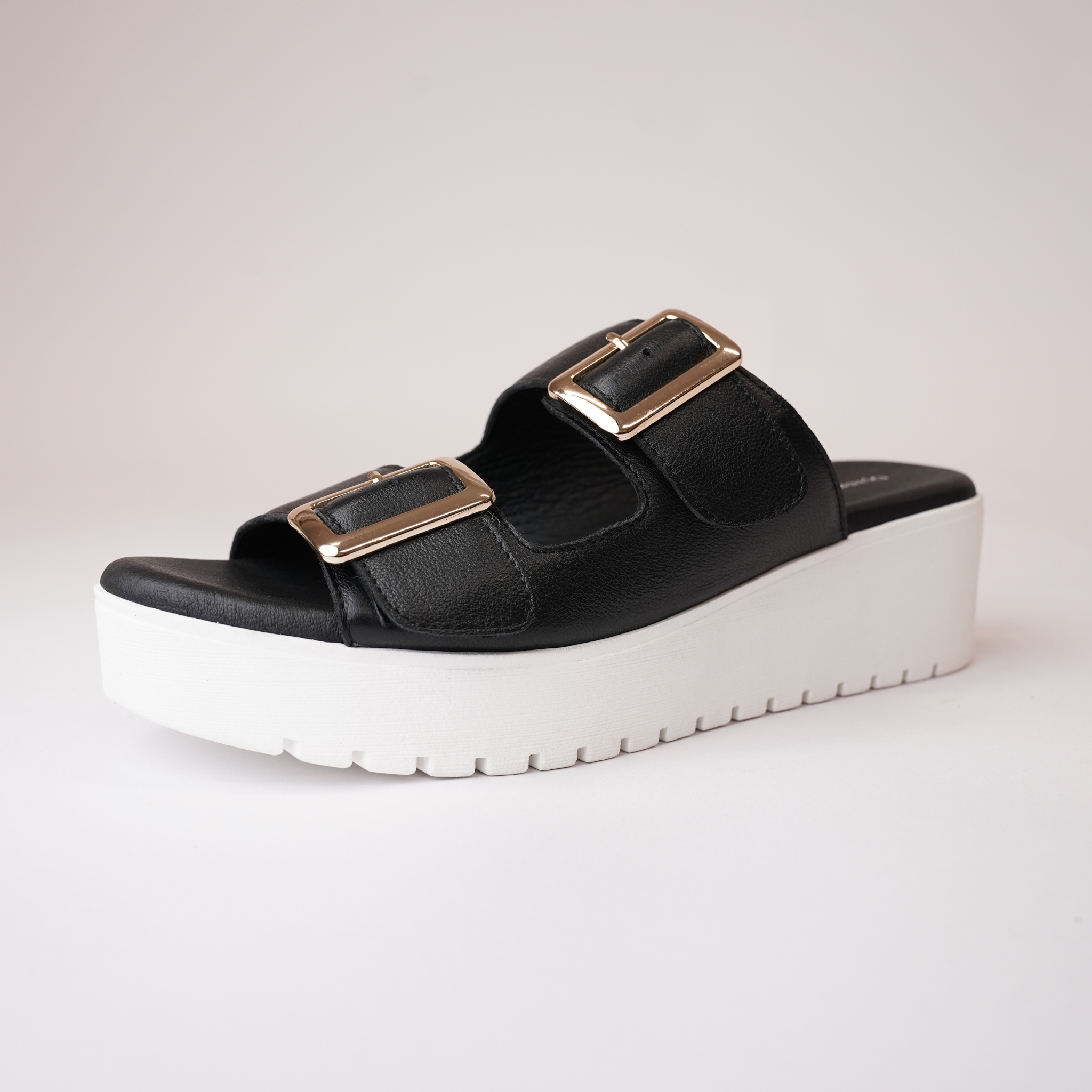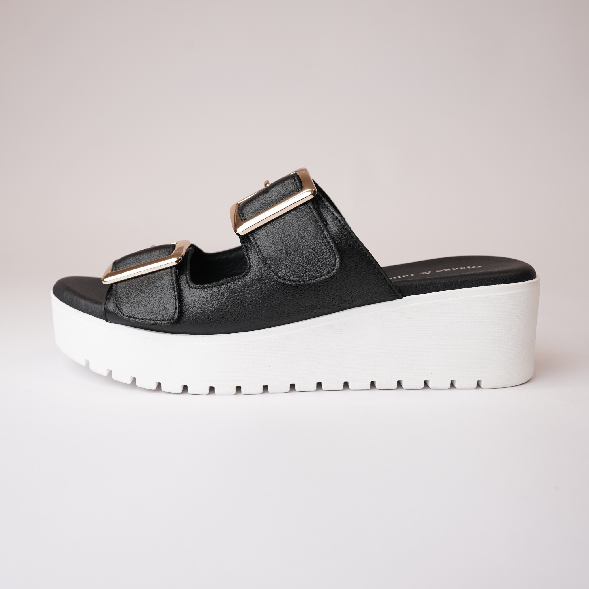 Transform your look with the Oaxel Black/ White Sole Leather Slides by Django & Juliette. Made with a leather upper and lining, these slides are not only stylish, but also durable. The man-made outsole provides traction while the cleated platform wedge and 4.7cm heel add a touch of elegance. Securely fasten the slides with the buckle straps. Elevate your style with these unique and chic slides!