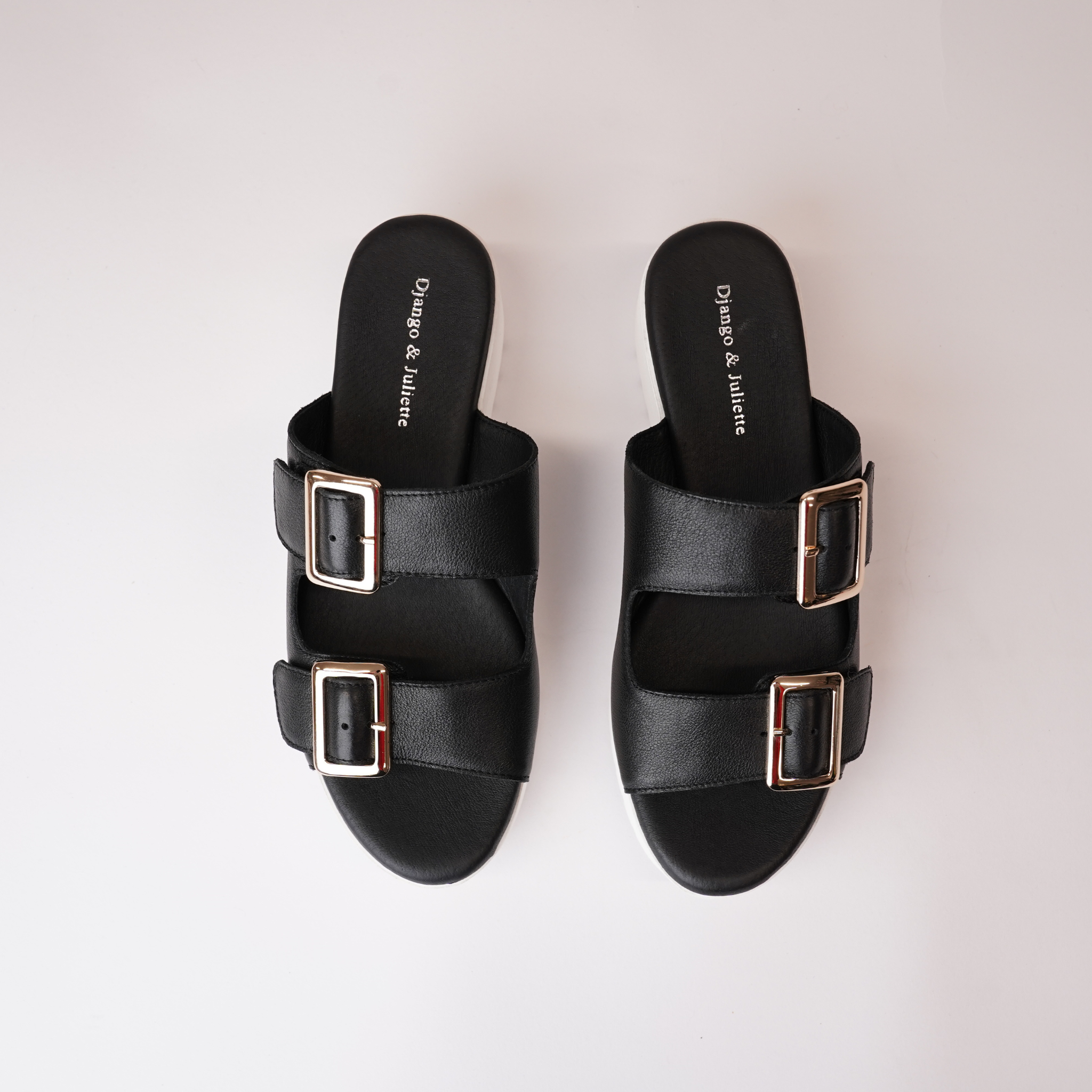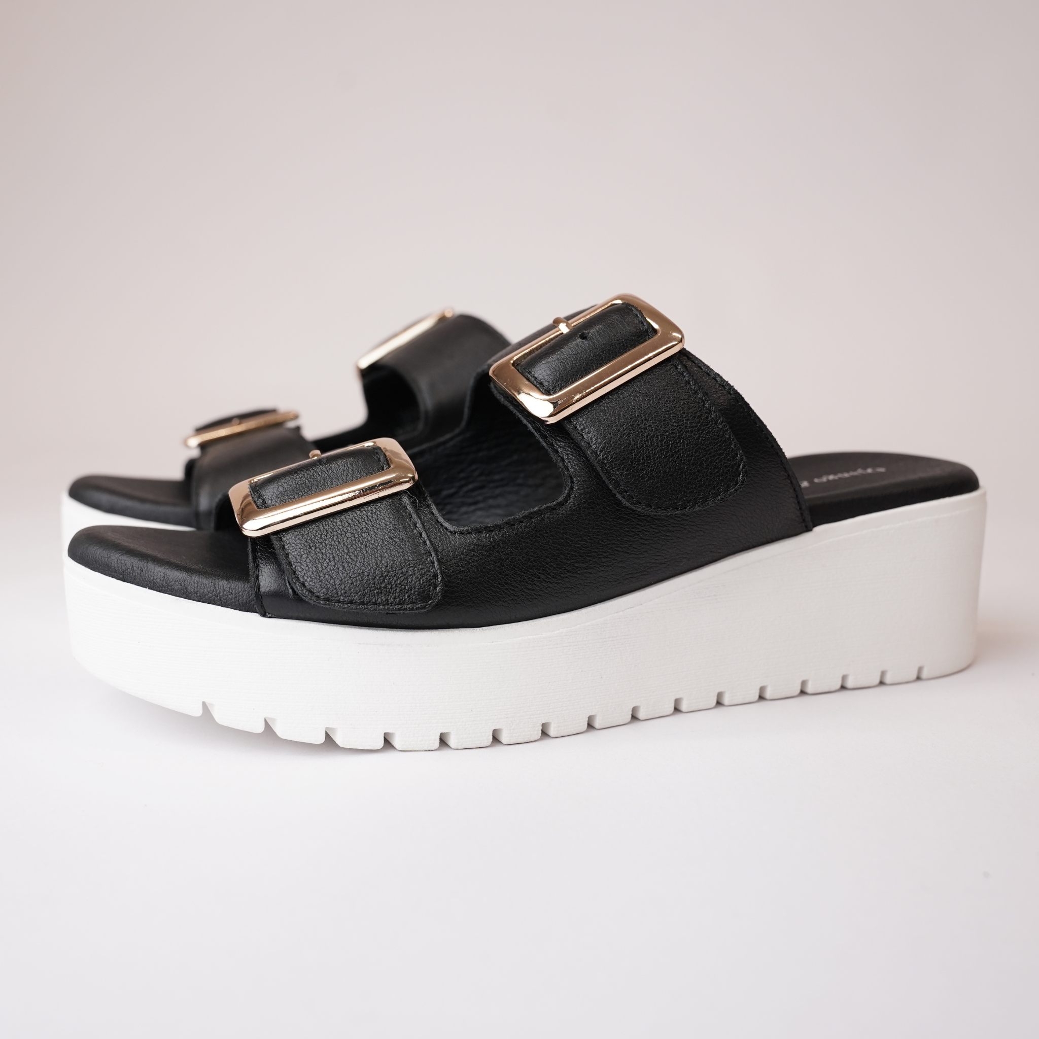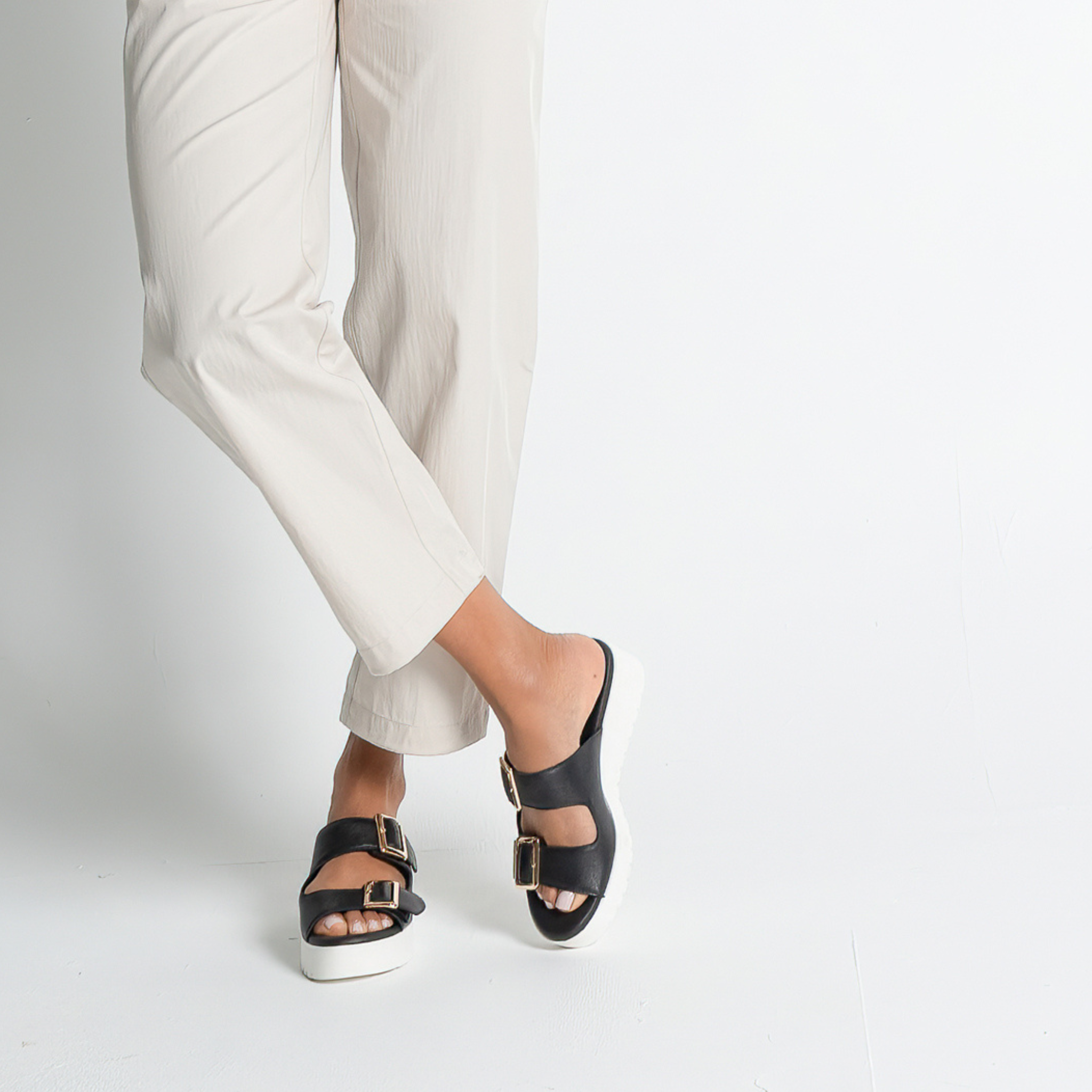 Transform your look with the Oaxel Black/ White Sole Leather Slides by Django & Juliette. Made with a leather upper and lining, these slides are not only stylish, but also durable. The man-made outsole provides traction while the cleated platform wedge and 4.7cm heel add a touch of elegance. Securely fasten the slides with the buckle straps. Elevate your style with these unique and chic slides!