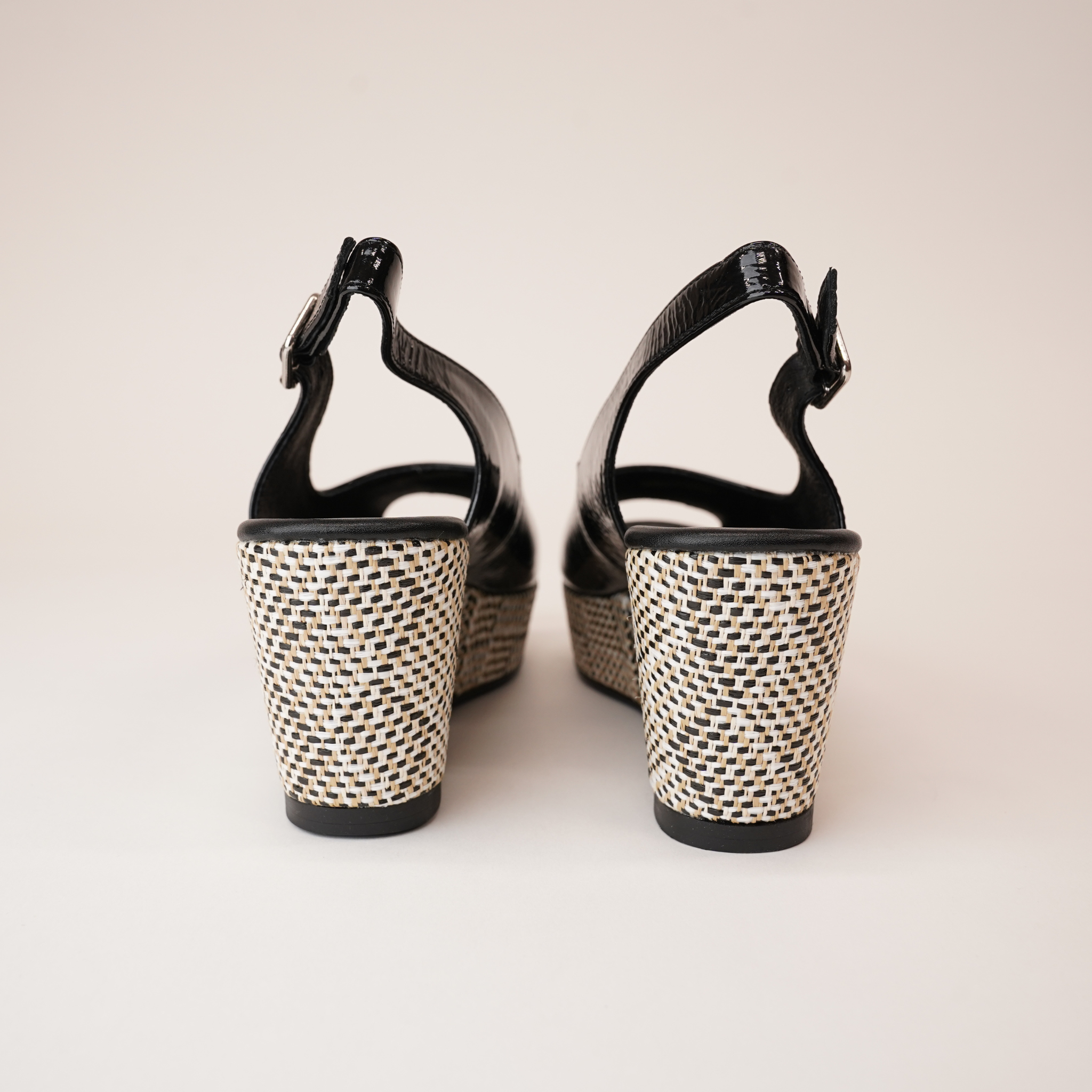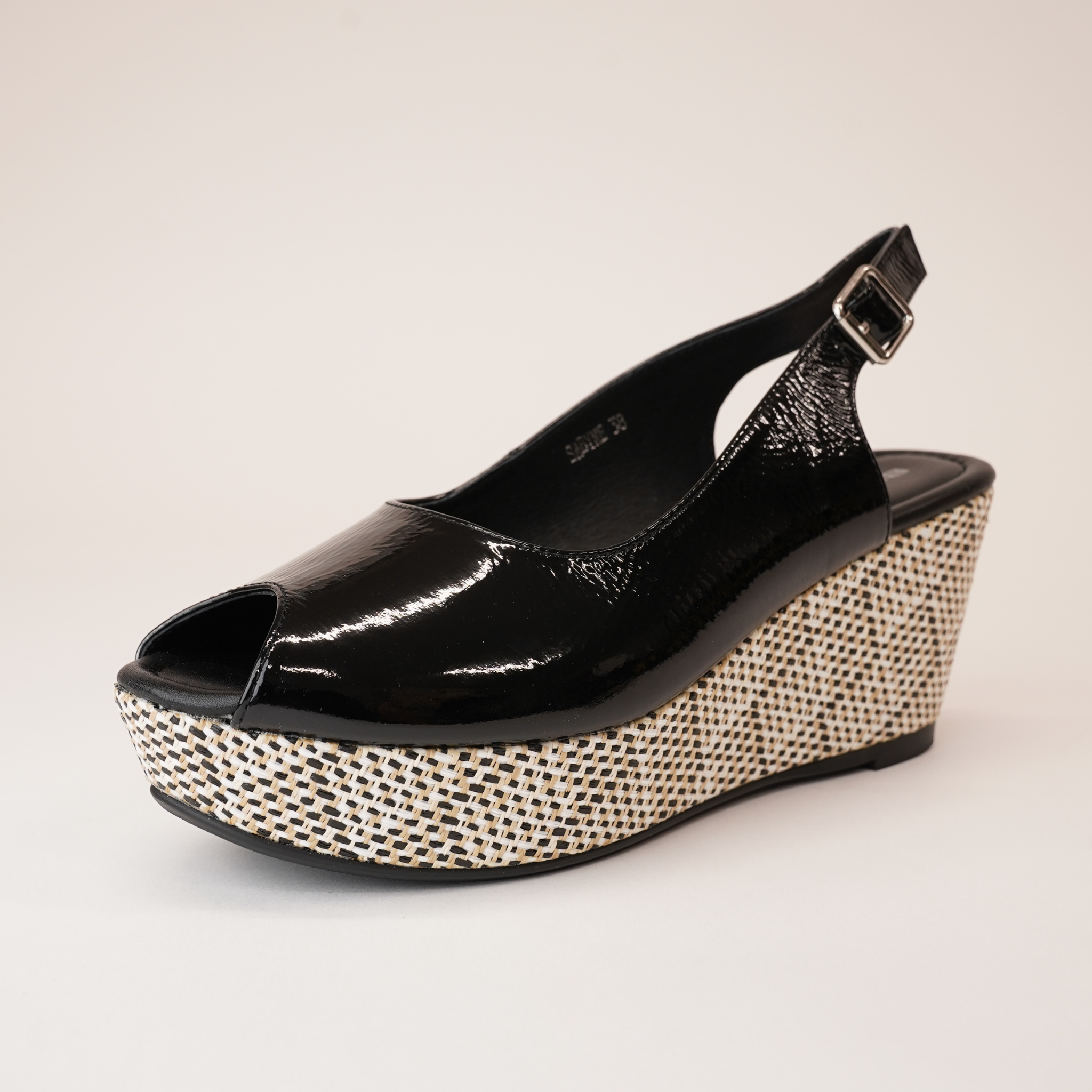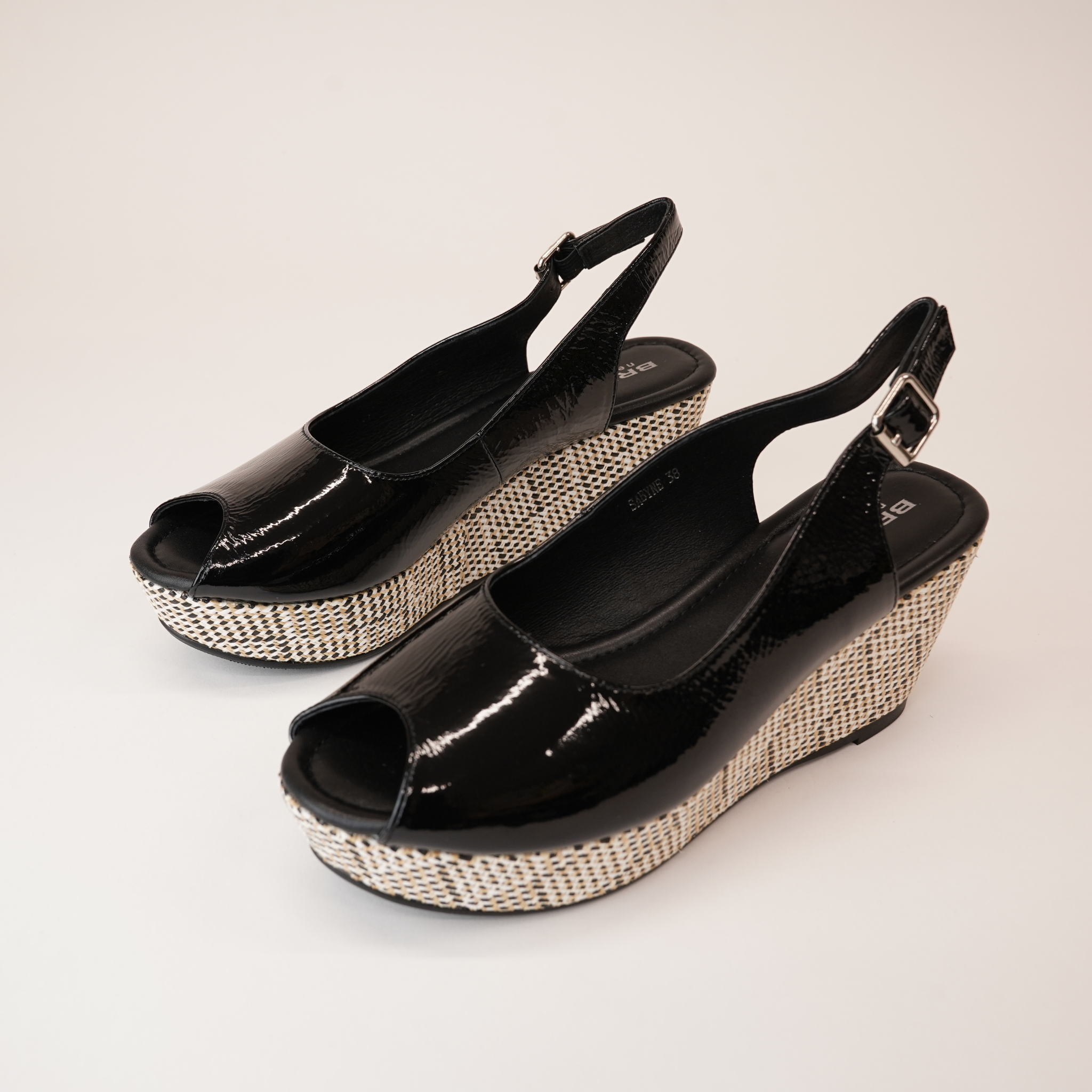Add a bold touch to your wardrobe with the Sabyne Black Patent Wedges by Bresley. These statement wedges feature a high-shine patent upper that exudes sophistication, perfectly paired with an eye-catching woven platform for a hint of texture. The slingback strap with an adjustable buckle offers a secure fit, while the open-toe design provides breathability and style. With their elevated height and comfortable wedge structure, the Sabyne wedges are ideal for stepping up your casual looks or adding flair to evening wear.
