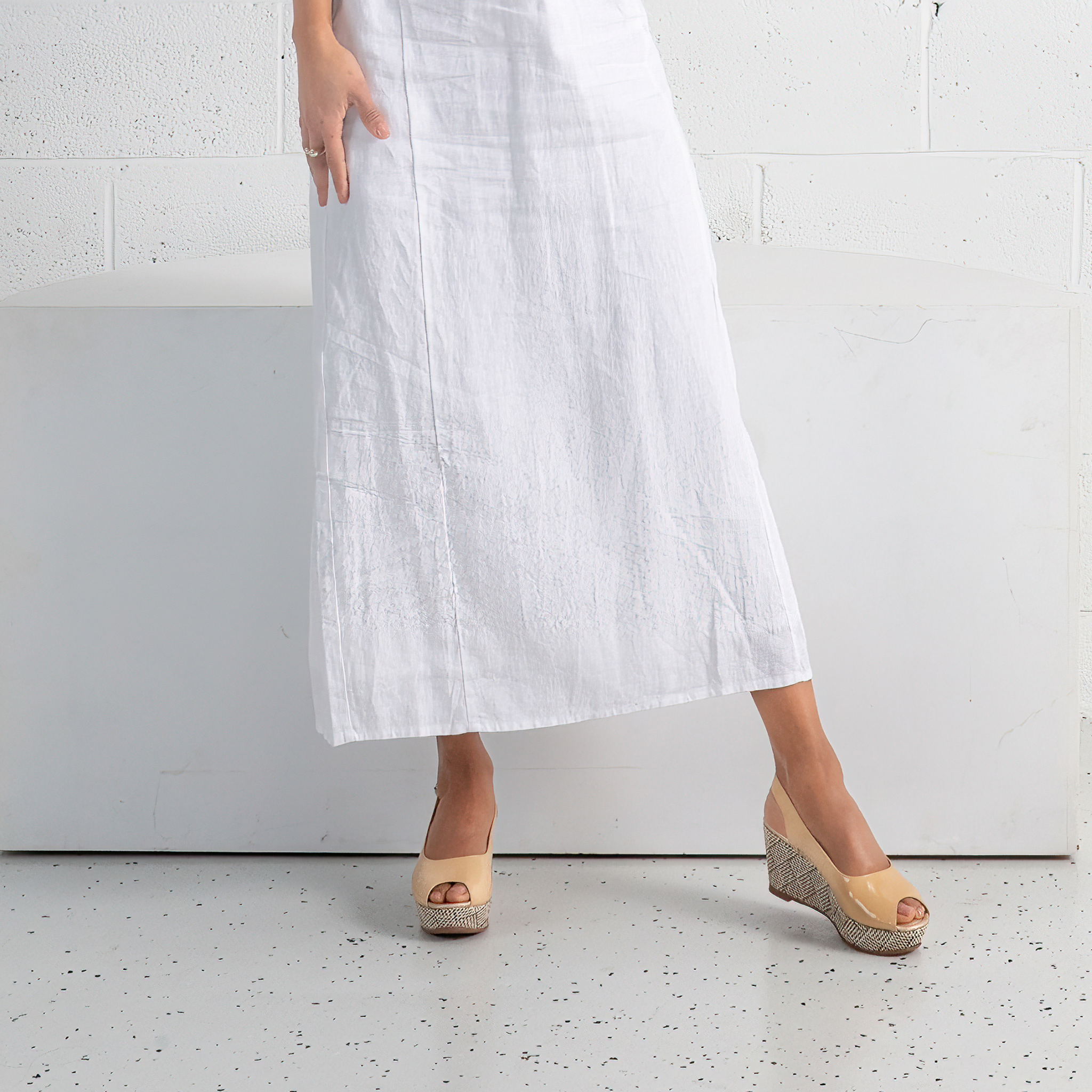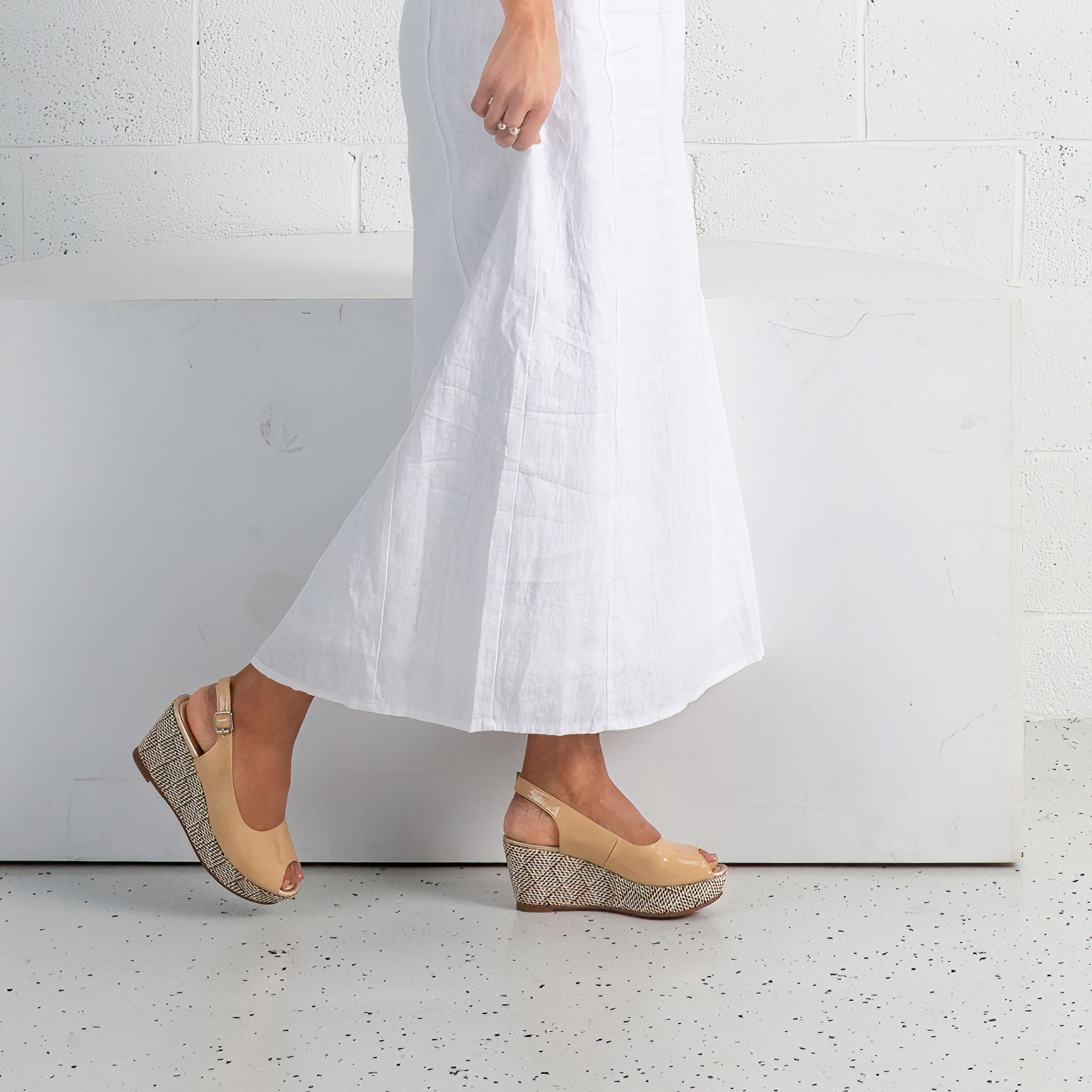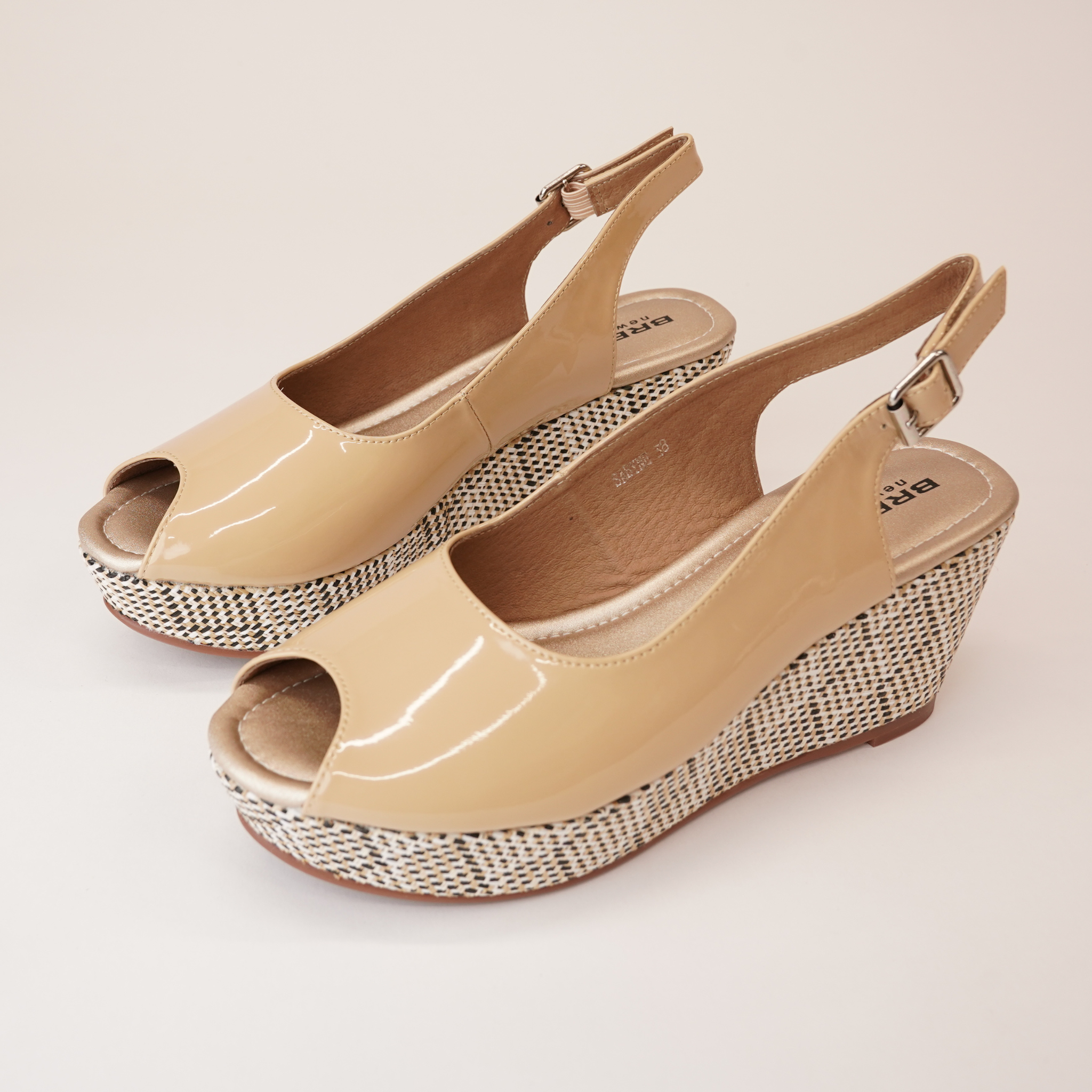 Add a bold touch to your wardrobe with the Sabyne Nude Patent Wedges by Bresley. These statement wedges feature a high-shine patent upper that exudes sophistication, perfectly paired with an eye-catching woven platform for a hint of texture. The slingback strap with an adjustable buckle offers a secure fit, while the open-toe design provides breathability and style. With their elevated height and comfortable wedge structure, the Sabyne wedges are ideal for stepping up your casual looks or adding flair to evening wear.