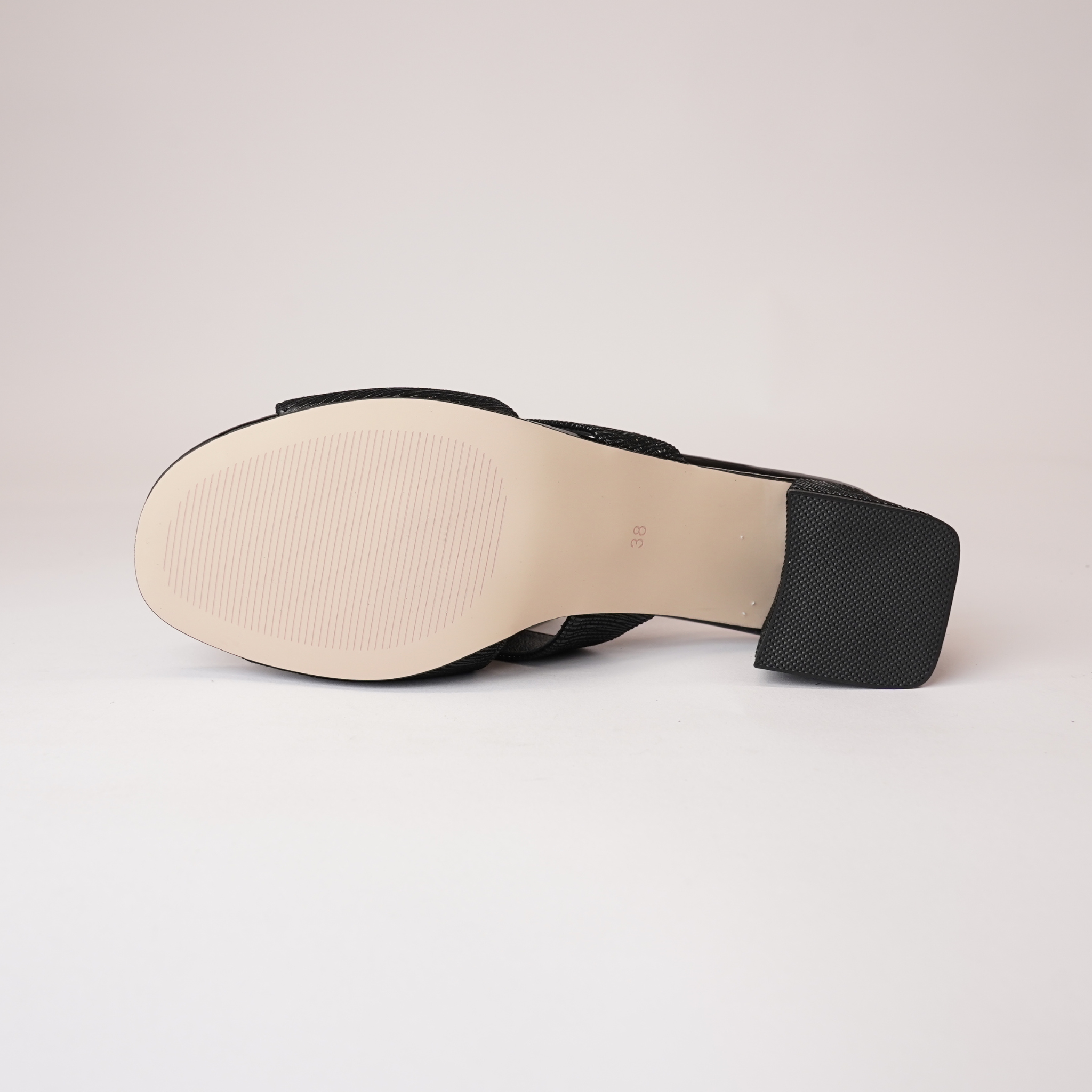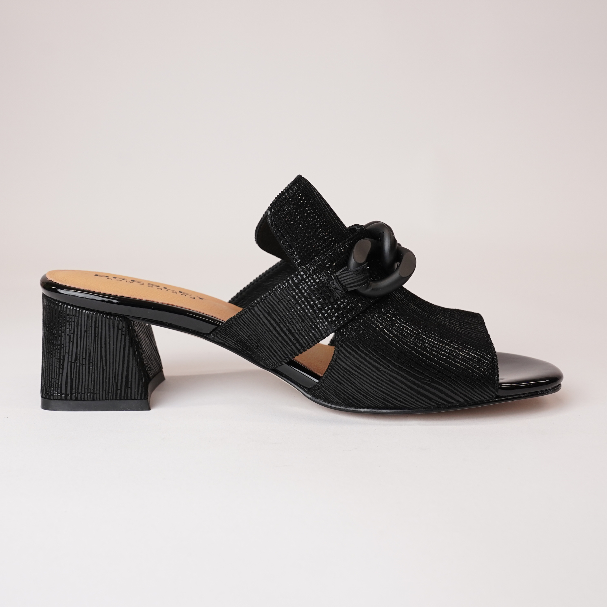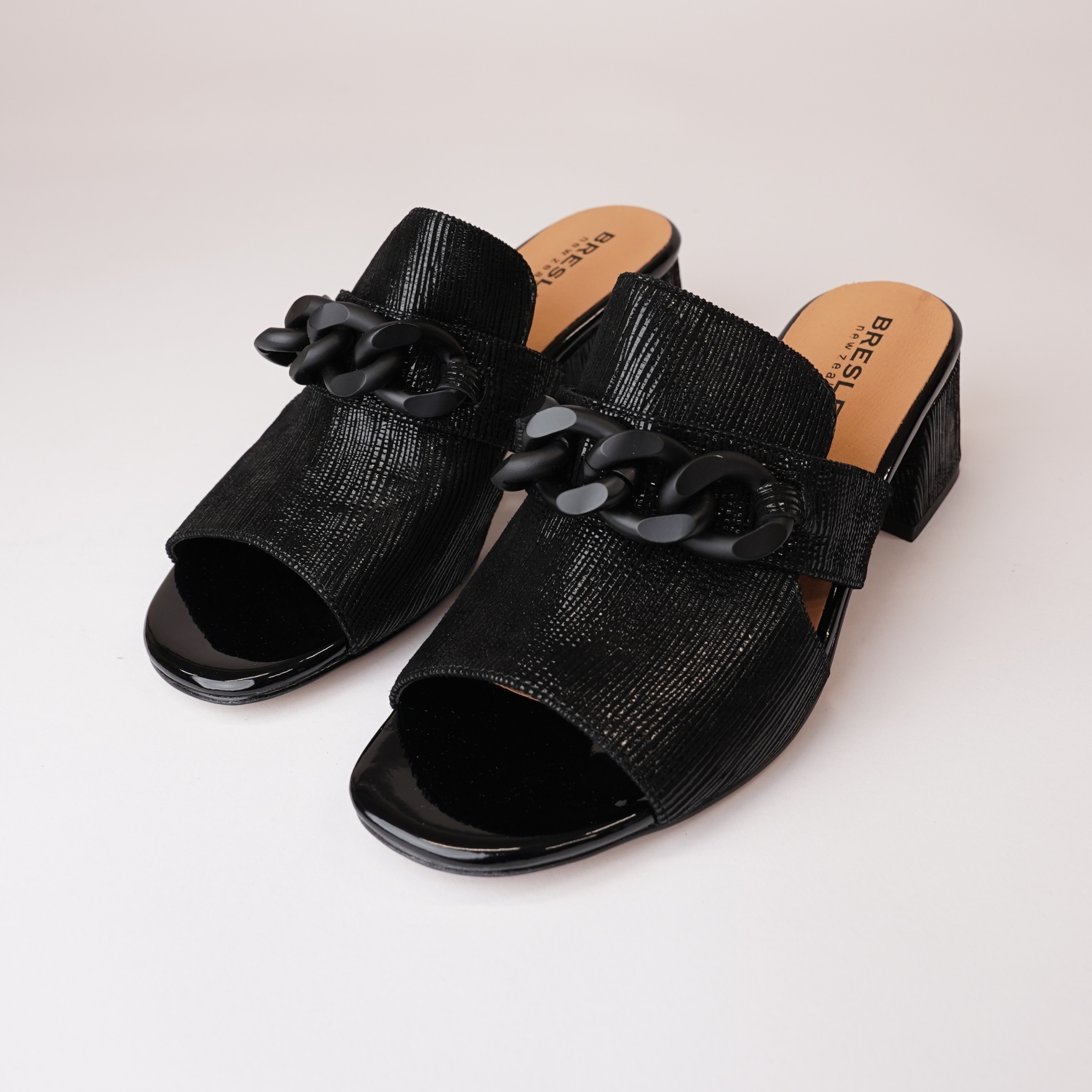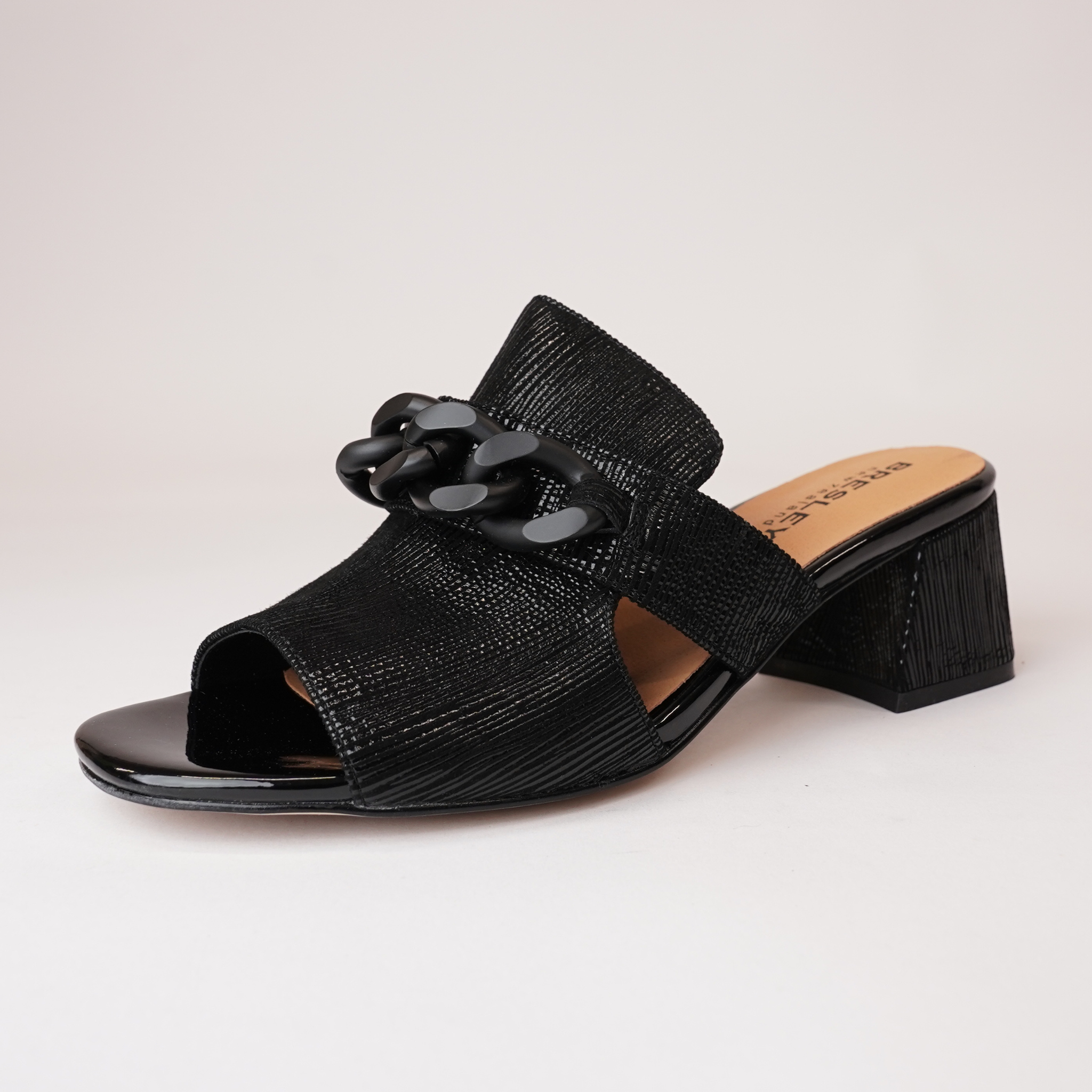 Add elegance to your wardrobe with the Adder Black Shimmer Leather Heels by Bresley. Featuring a sleek black leather upper with a shimmer finish and bold chain detail, these heels offer both style and comfort. The block heel, open-toe design, and slip-on style make them versatile for day or evening wear, adding a chic touch to any outfit.
