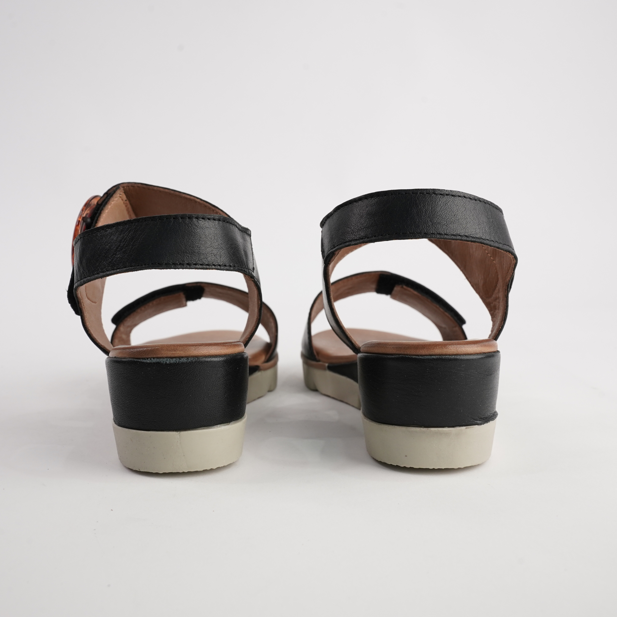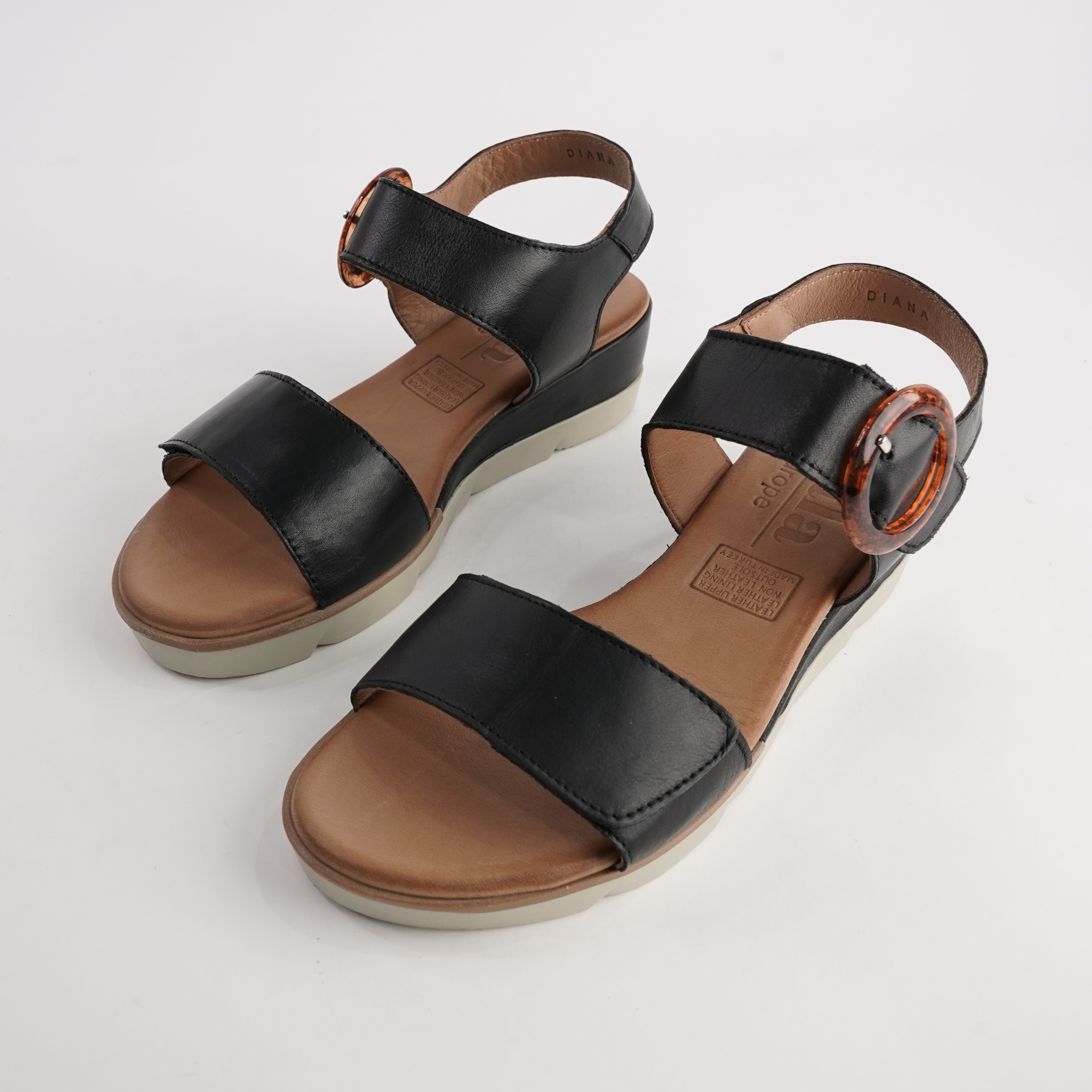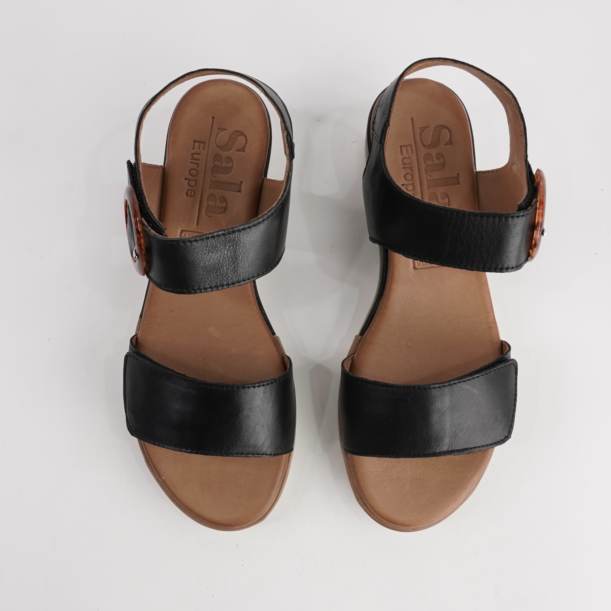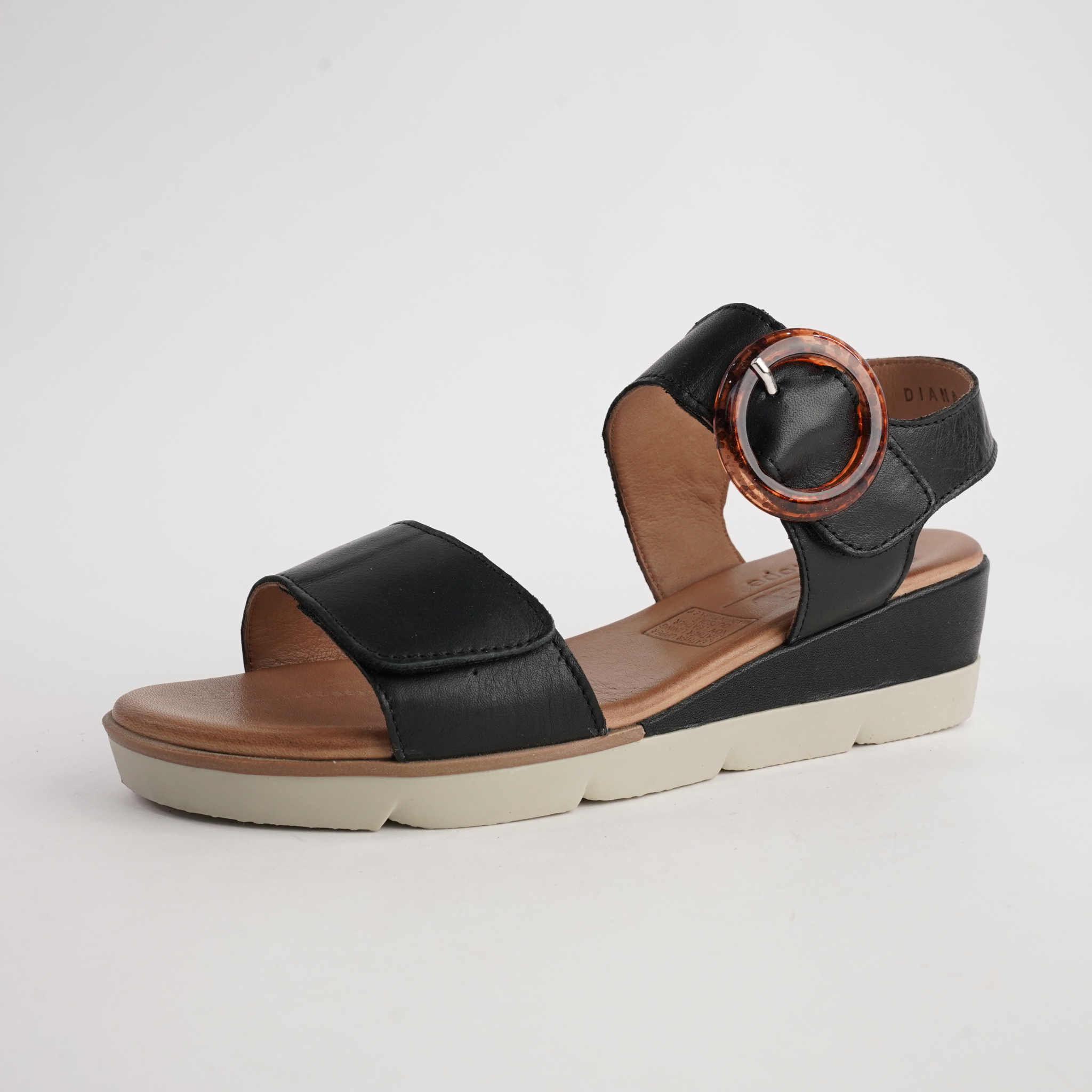 Step into effortless elegance with the Diana Sandals by Sala. Crafted from smooth black-toned leather, this style combines modern simplicity with everyday comfort. The wide front strap and cushioned insole provide secure wear, while the ankle strap features a statement tortoiseshell buckle that adds a chic finishing touch. Set on a lightweight wedge sole, the Diana Sandals offer subtle height and stability perfect for pairing with summer dresses, linen pants, or cropped jeans.