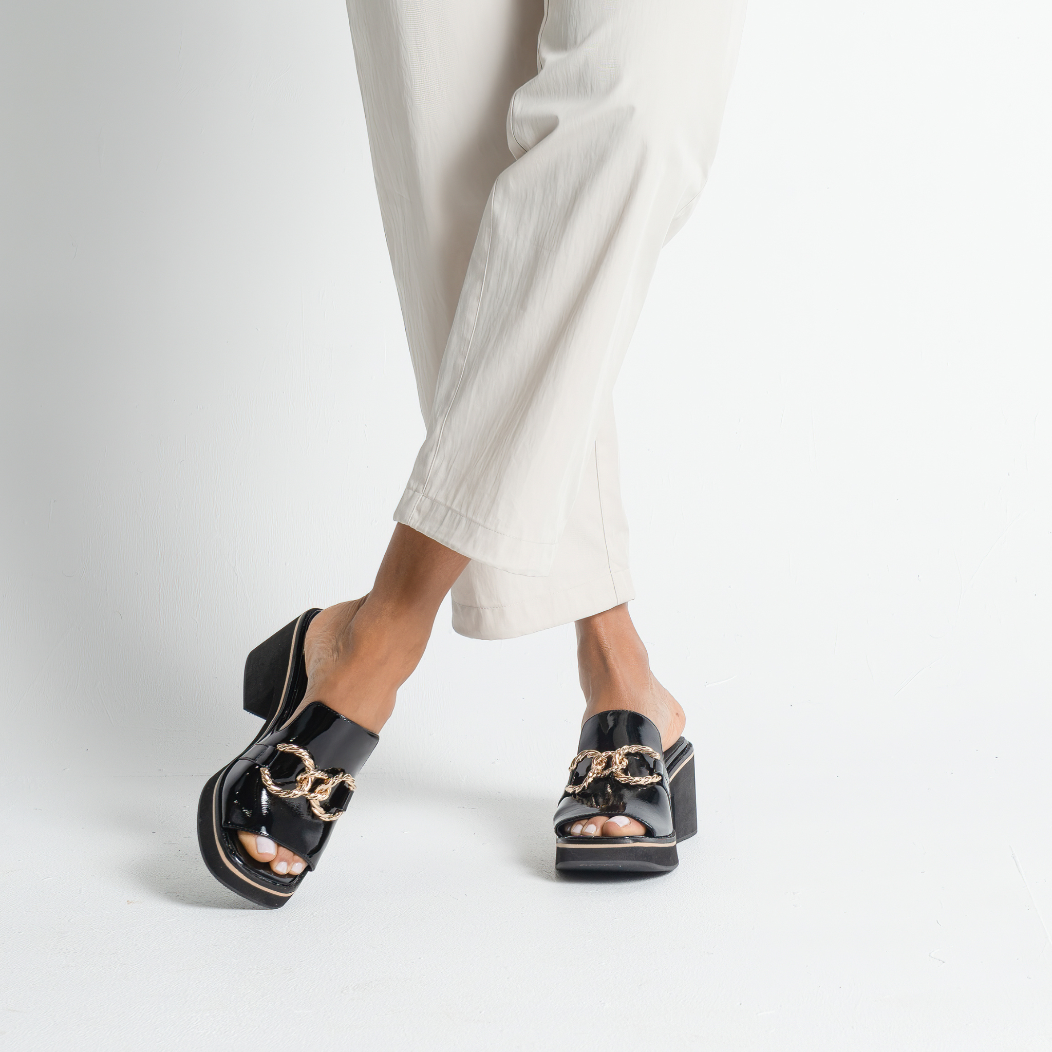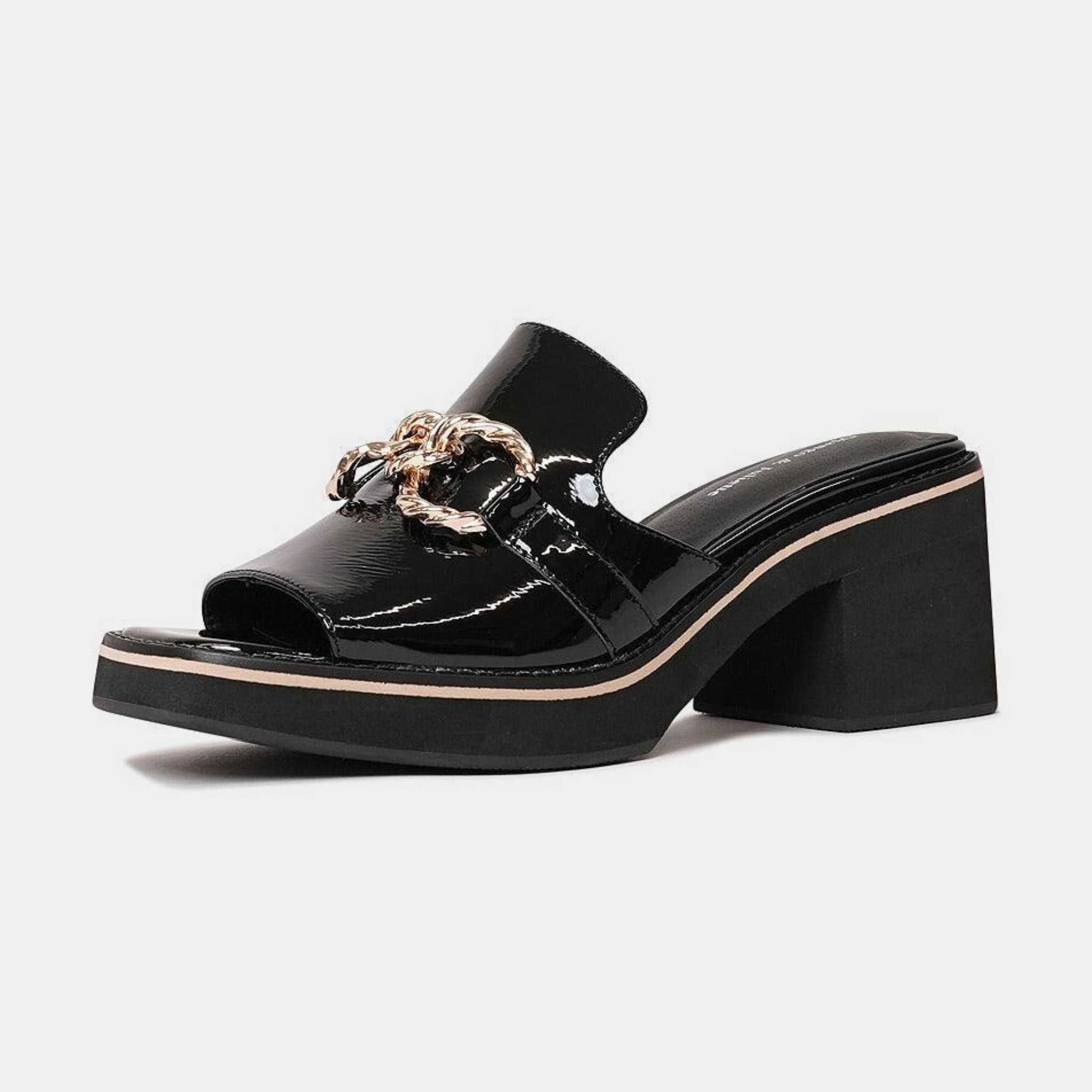 The Jamms Black Patent heeled mules by Django & Juliette are set on a 7cm chunky heel that is still comfortable and practical for everyday wear. We love the 70s inspiration behind these heels and love styling them with bell pants and boho tops.