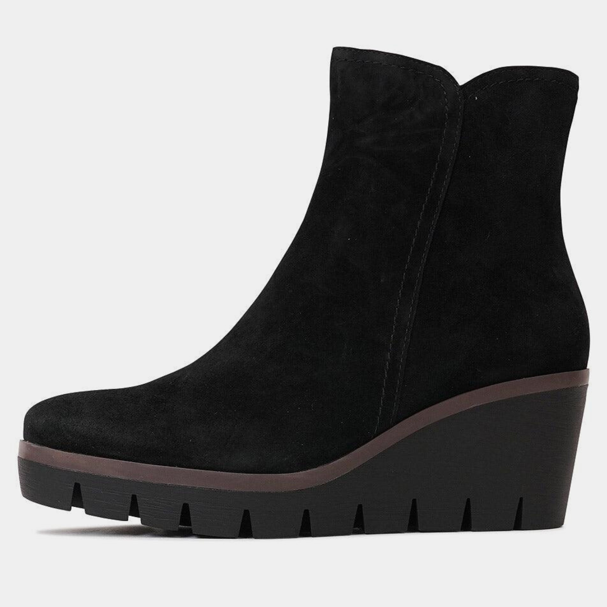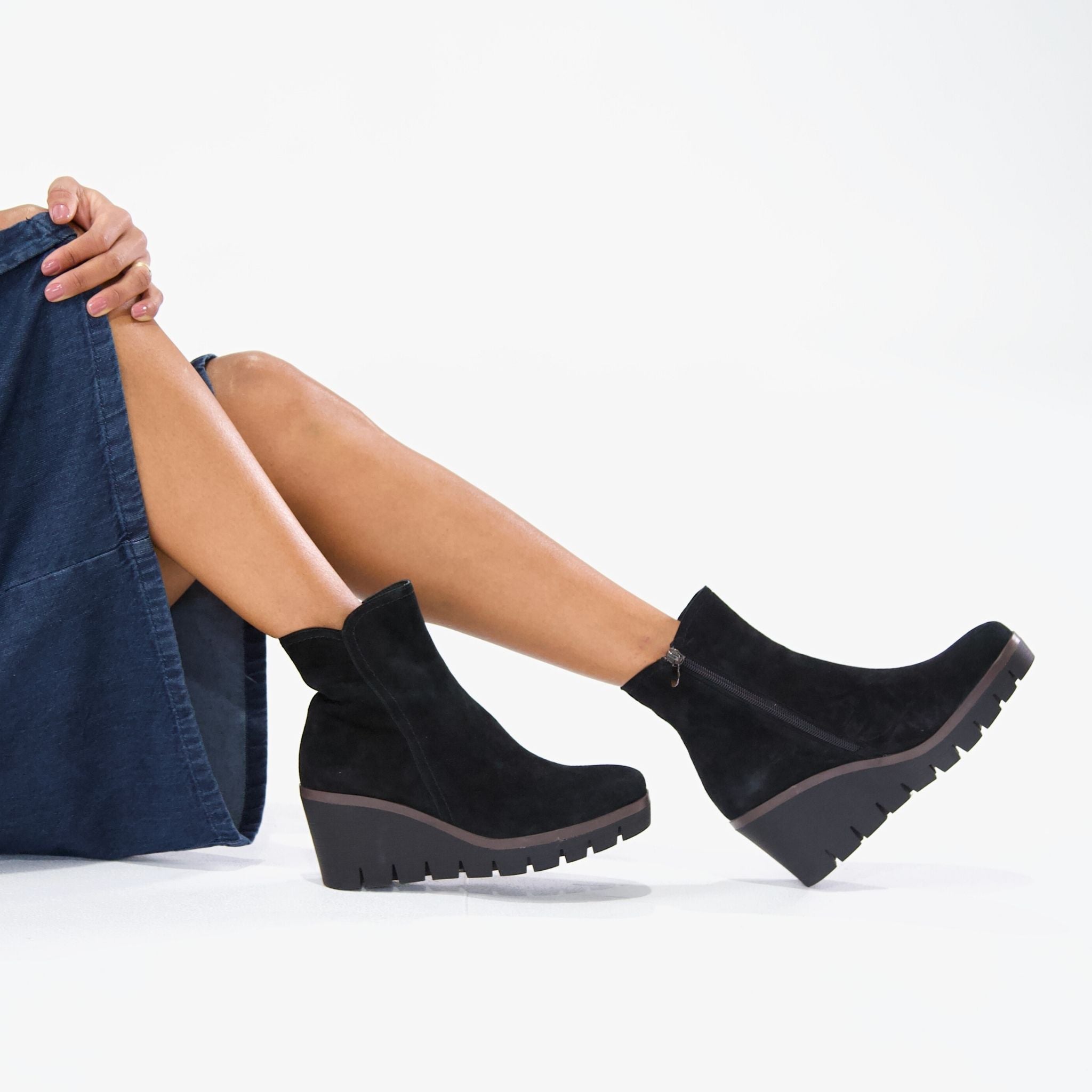 Experience fashion and comfort with Nerrie Black Suede Wedge Boots by Django & Juliette. The leather upper and lining provide luxurious, high-quality materials, while the 7cm wedge heel and inner side zip add practicality and convenience. Elevate any outfit with these stylish and versatile boots!