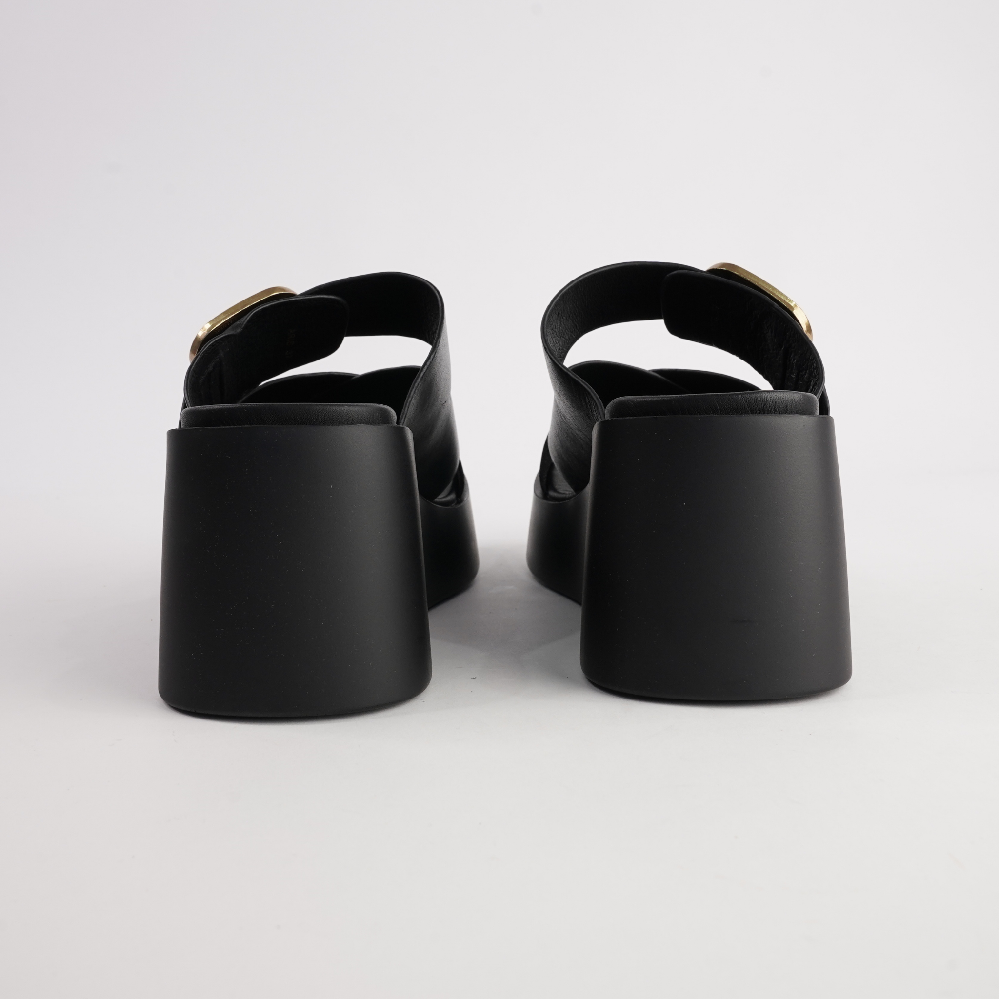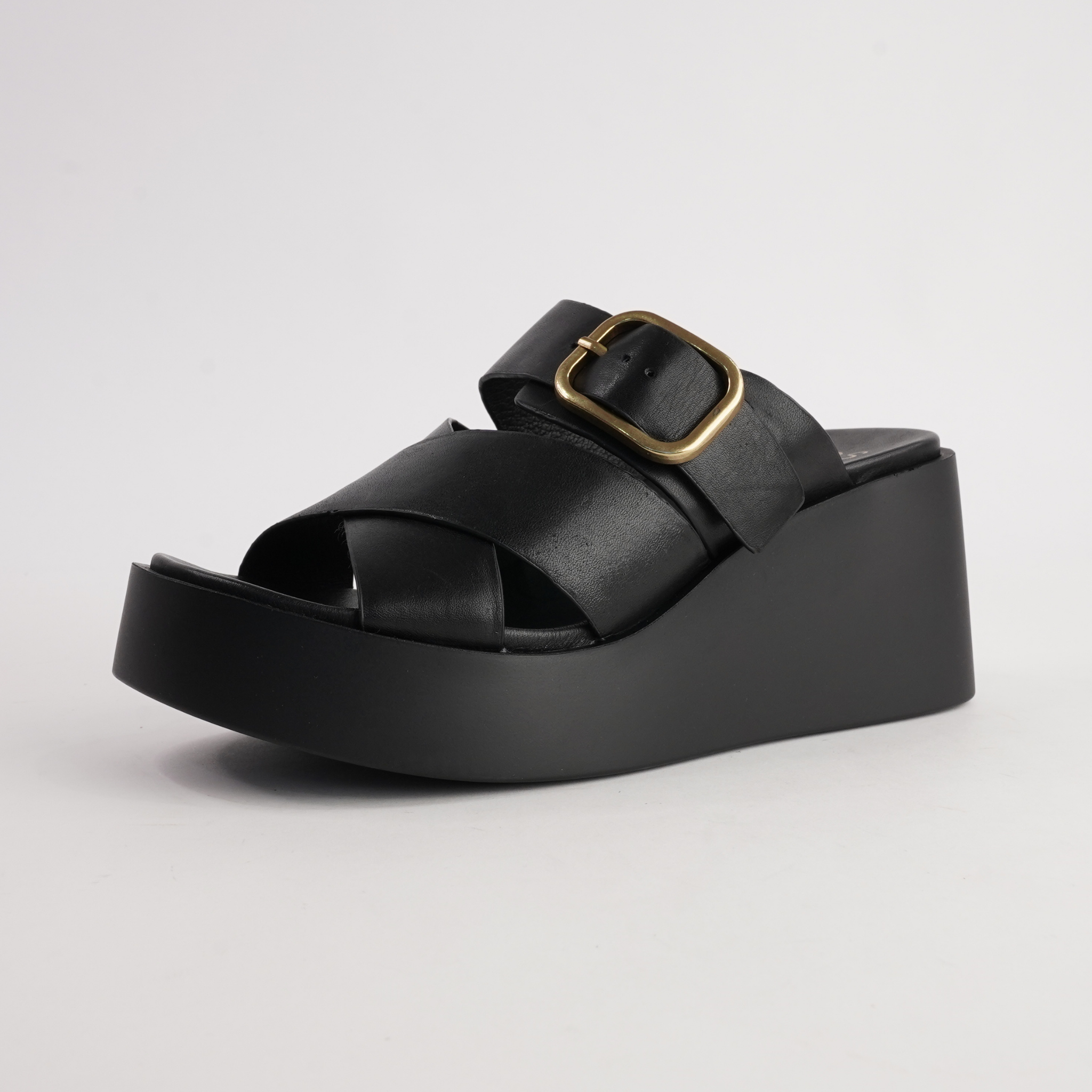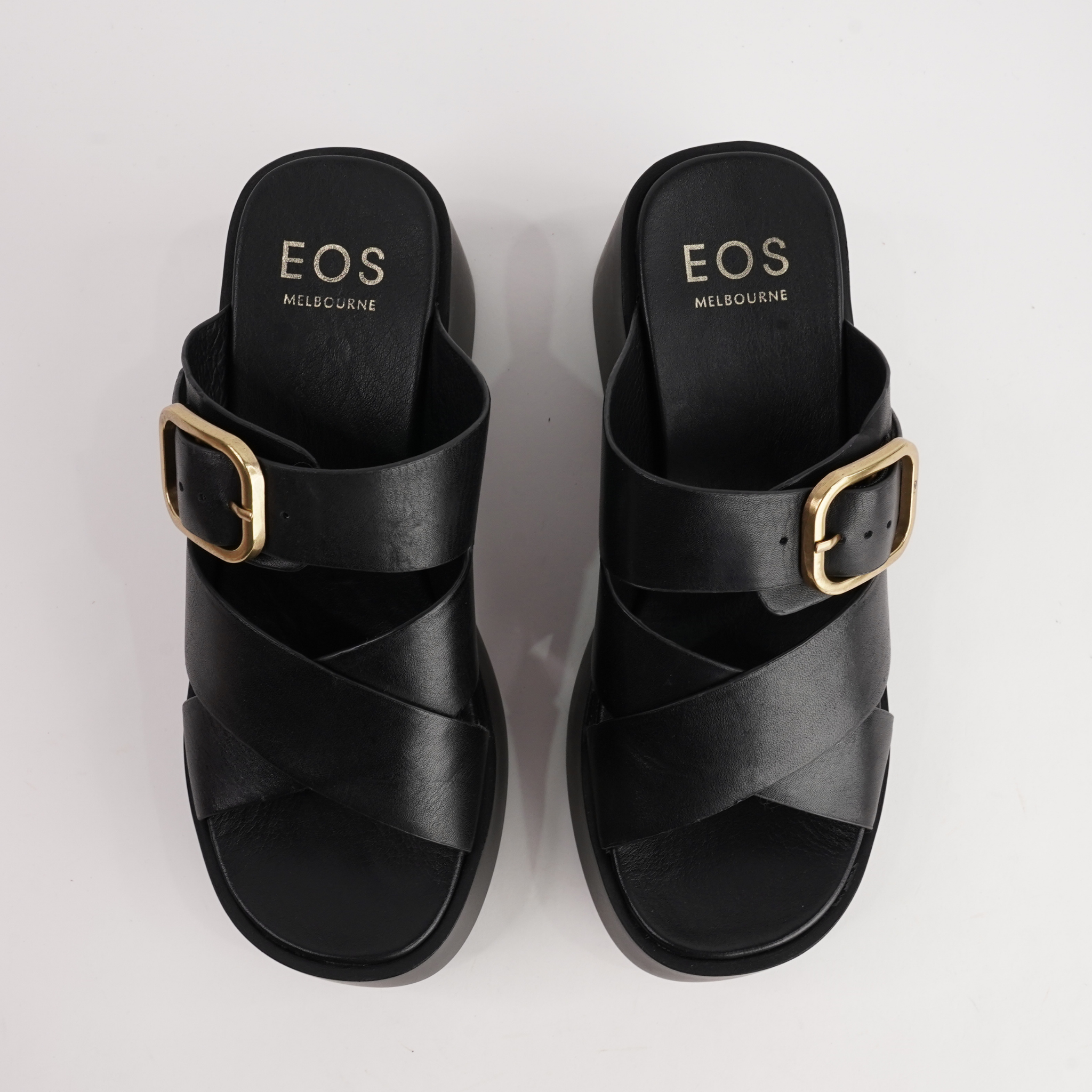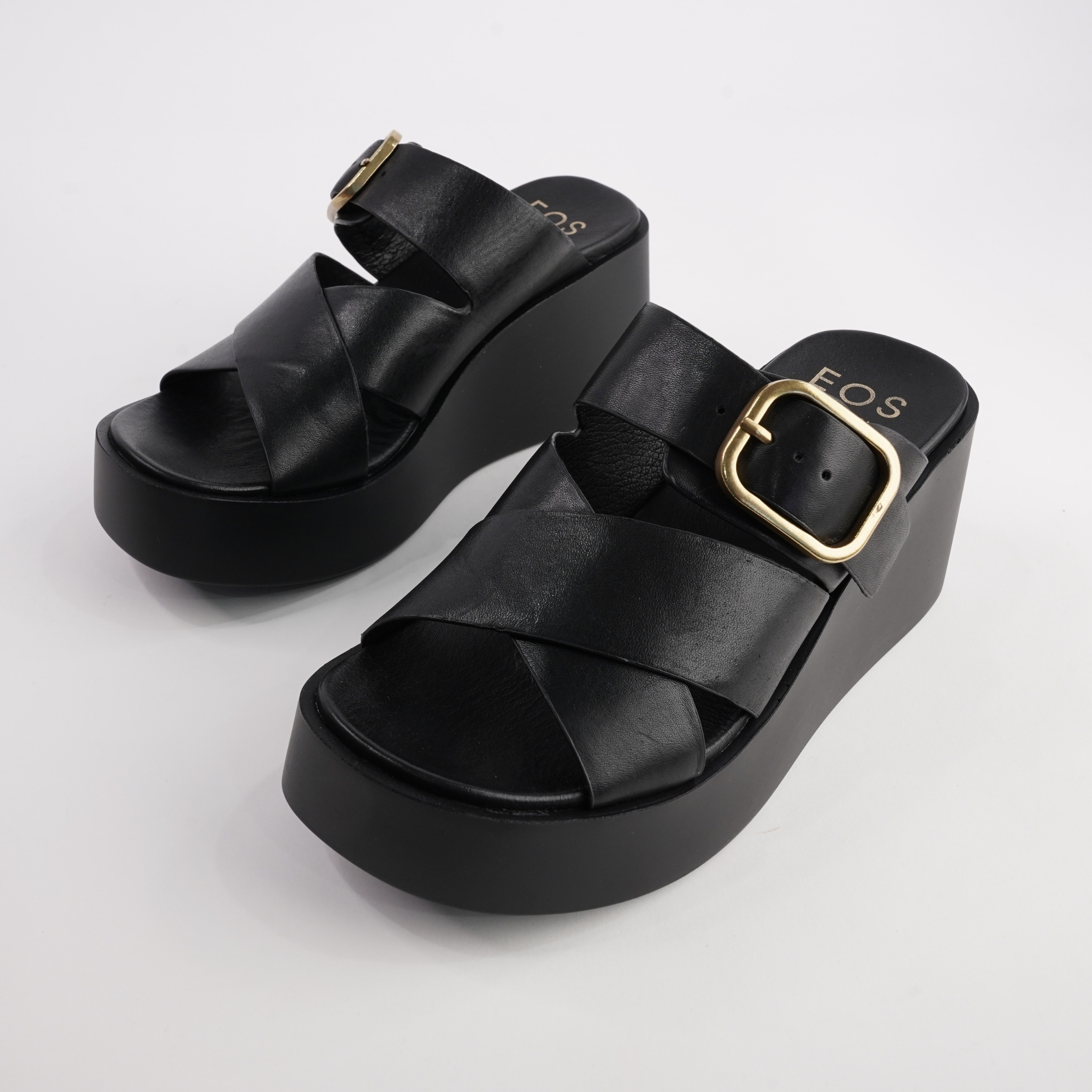 Chic and sculptural, the Aris Wedges by EOS Footwear redefine effortless height and comfort. Crafted from black leather, this modern mule features broad crossover straps and a statement gold buckle for a refined finish. Set on a bold platform wedge, Aris combines stability with striking style — perfect for dressing up everyday looks or complementing sleek evening ensembles.