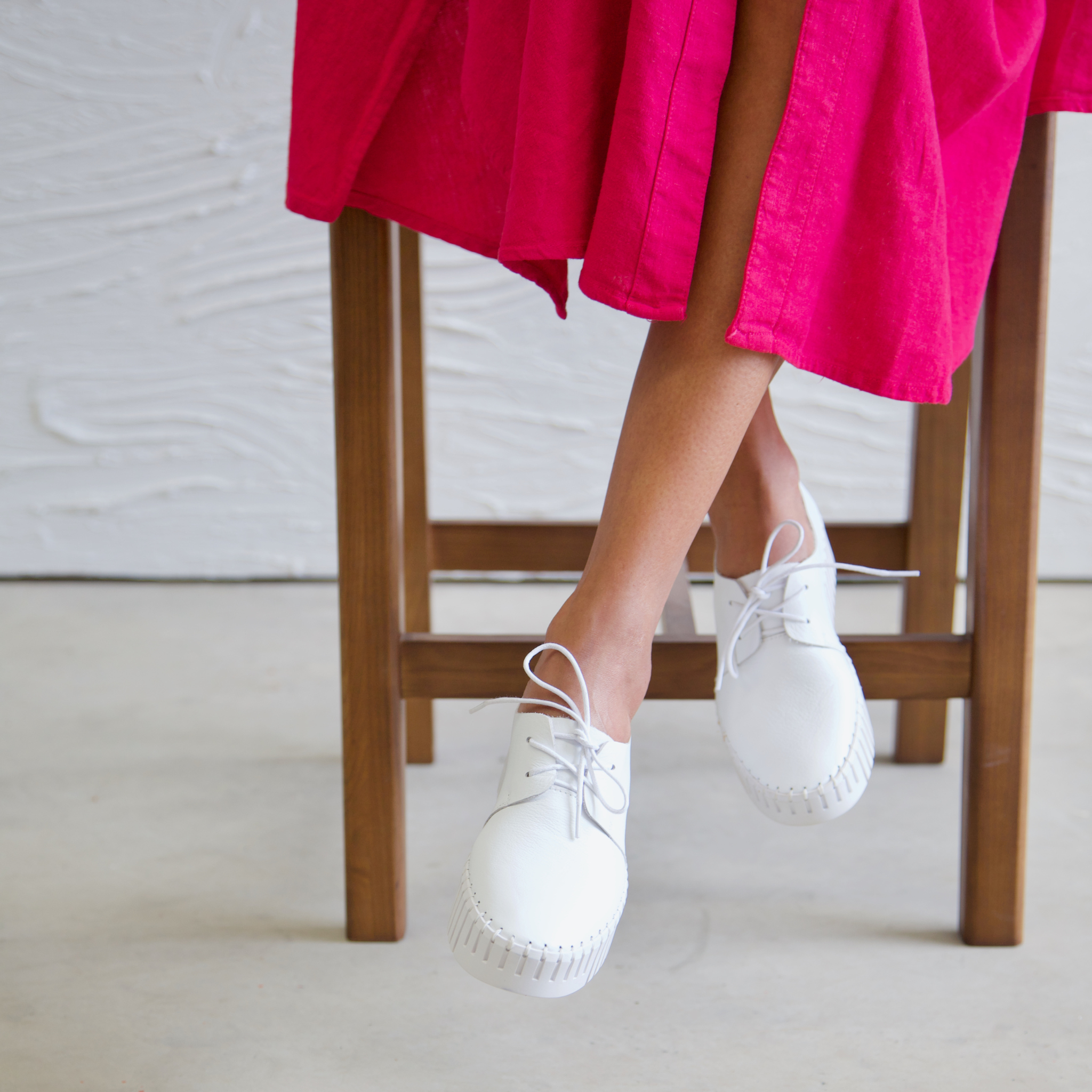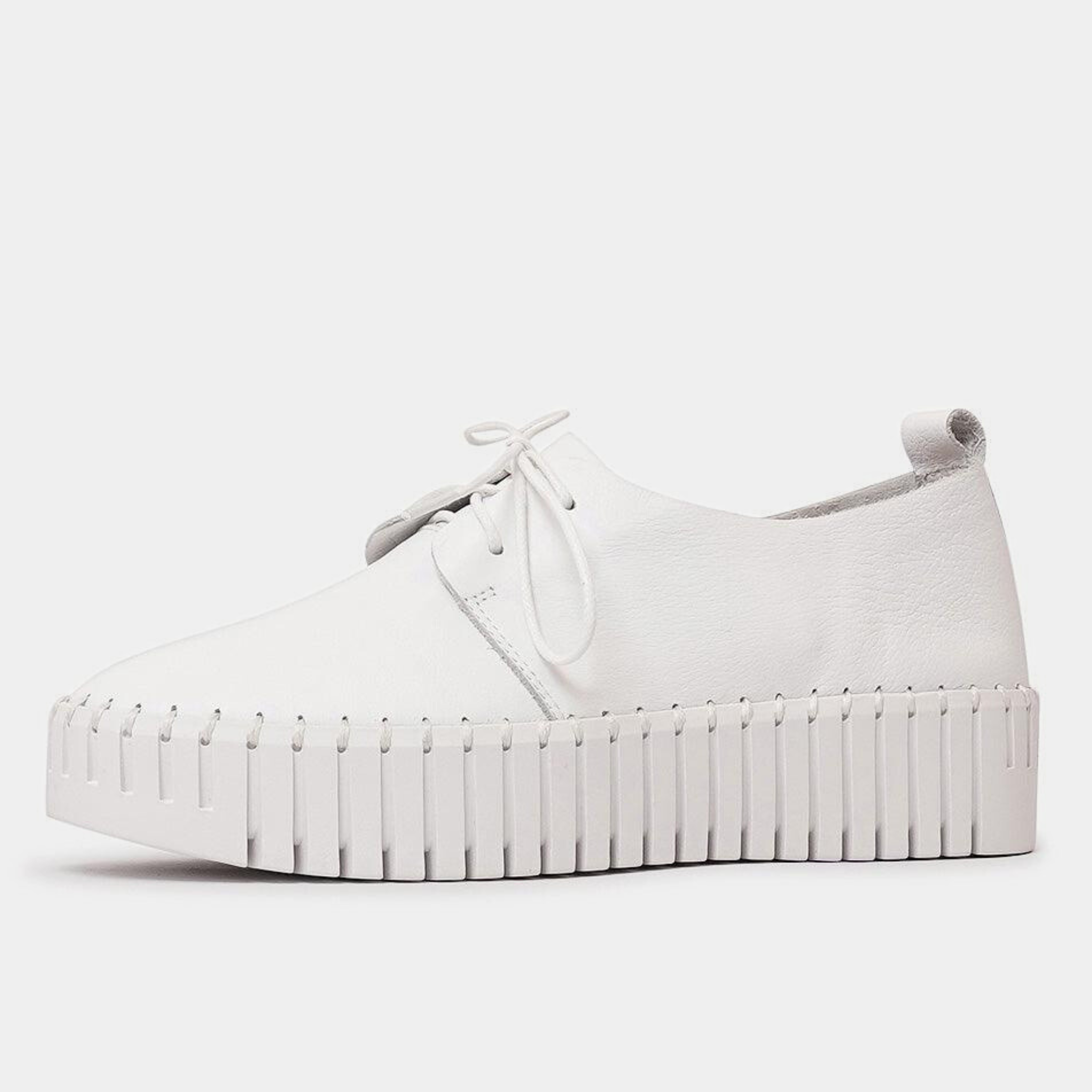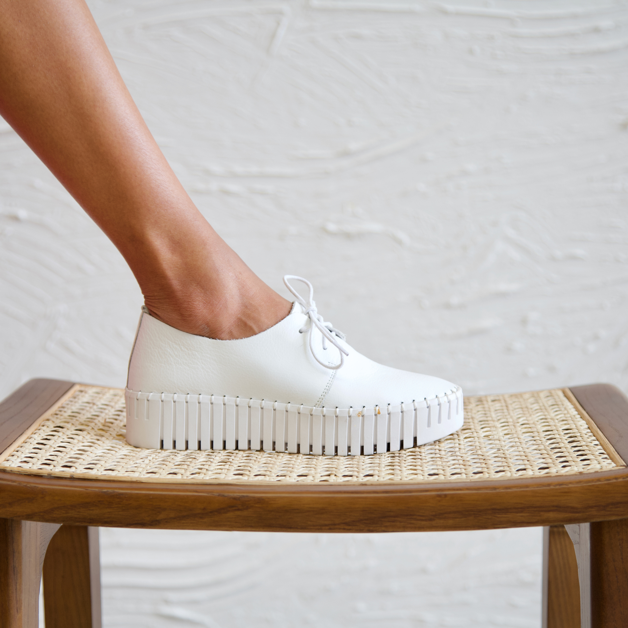 Step out in style with Brenda white by Django and Juliette. This funky modern take on the sneaker features a thick cleated outsole, a beautifully soft leather upper and laces. Pair Brenda in white with jeans and a tee for the perfect athleisure look.