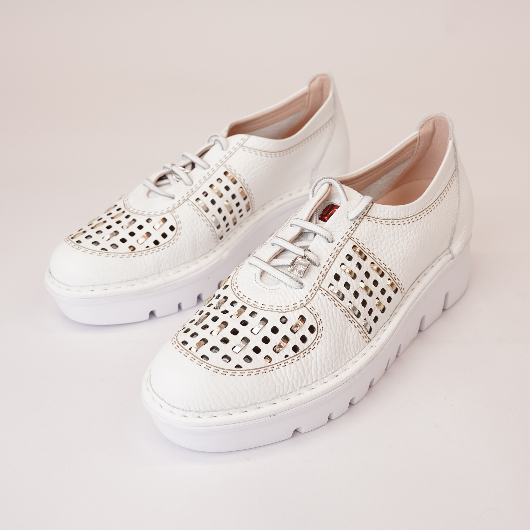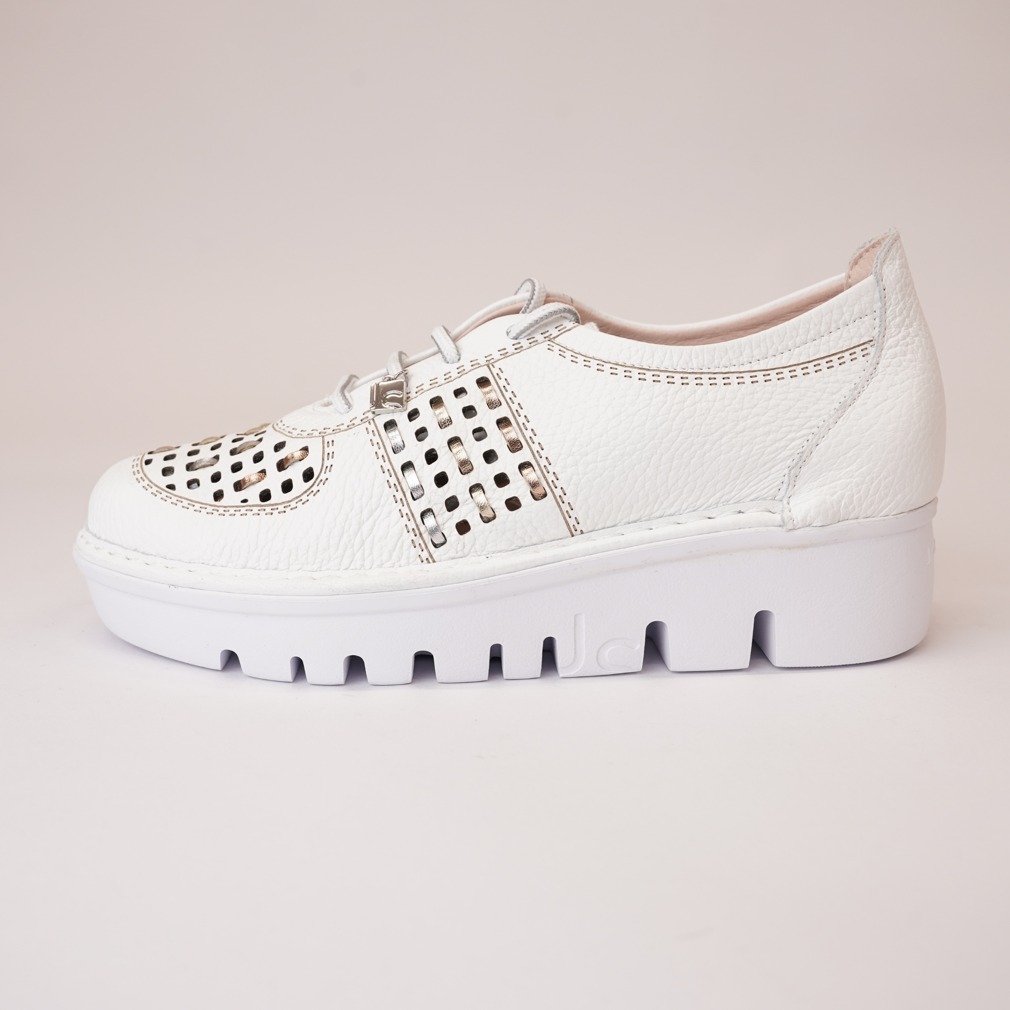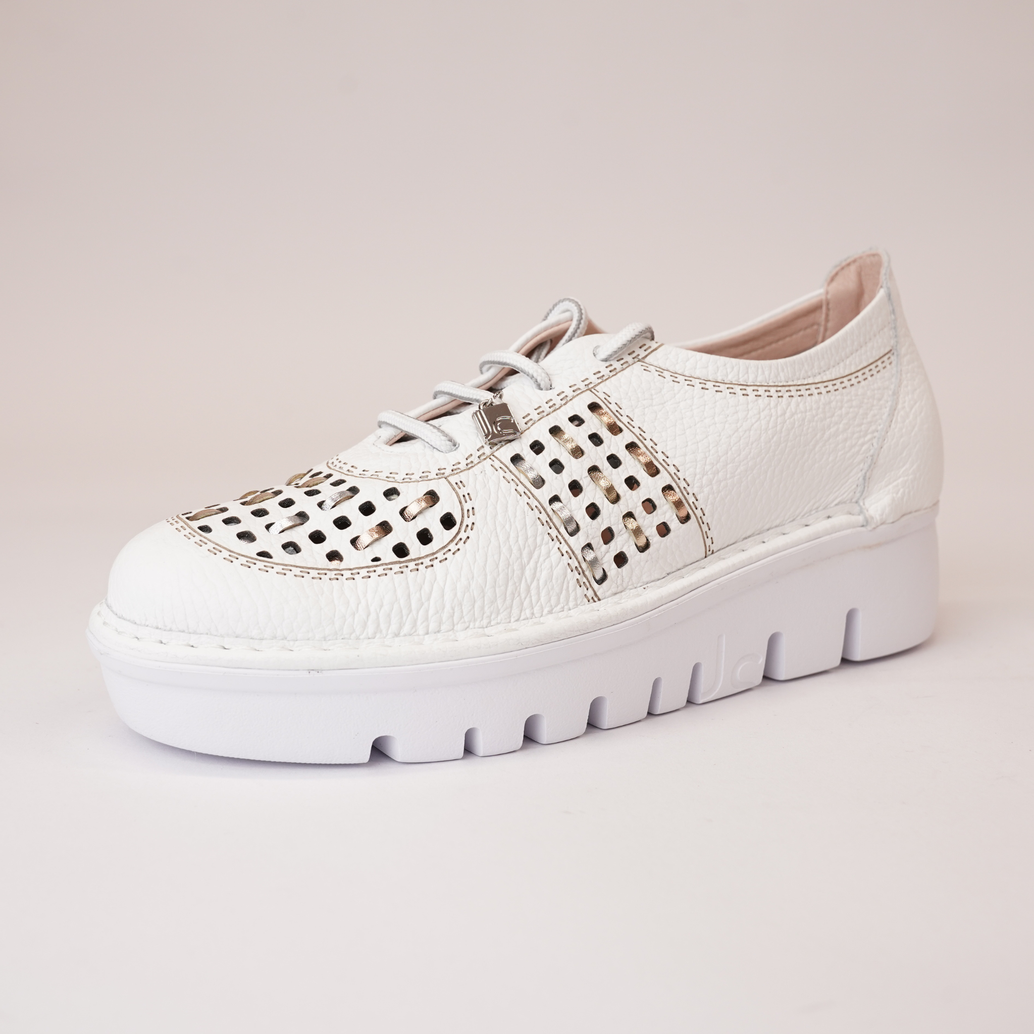 Step up your style with the JS-4423 White/Multi Leather Sneakers by Jose Saenz. Featuring premium leather with a perforated design and metallic accents, these sneakers offer a lightweight cushioned sole for all-day comfort. Orthotic-friendly with a removable insole, they provide customizable support. Versatile and chic, they pair perfectly with casual or semi-dressy outfits.
