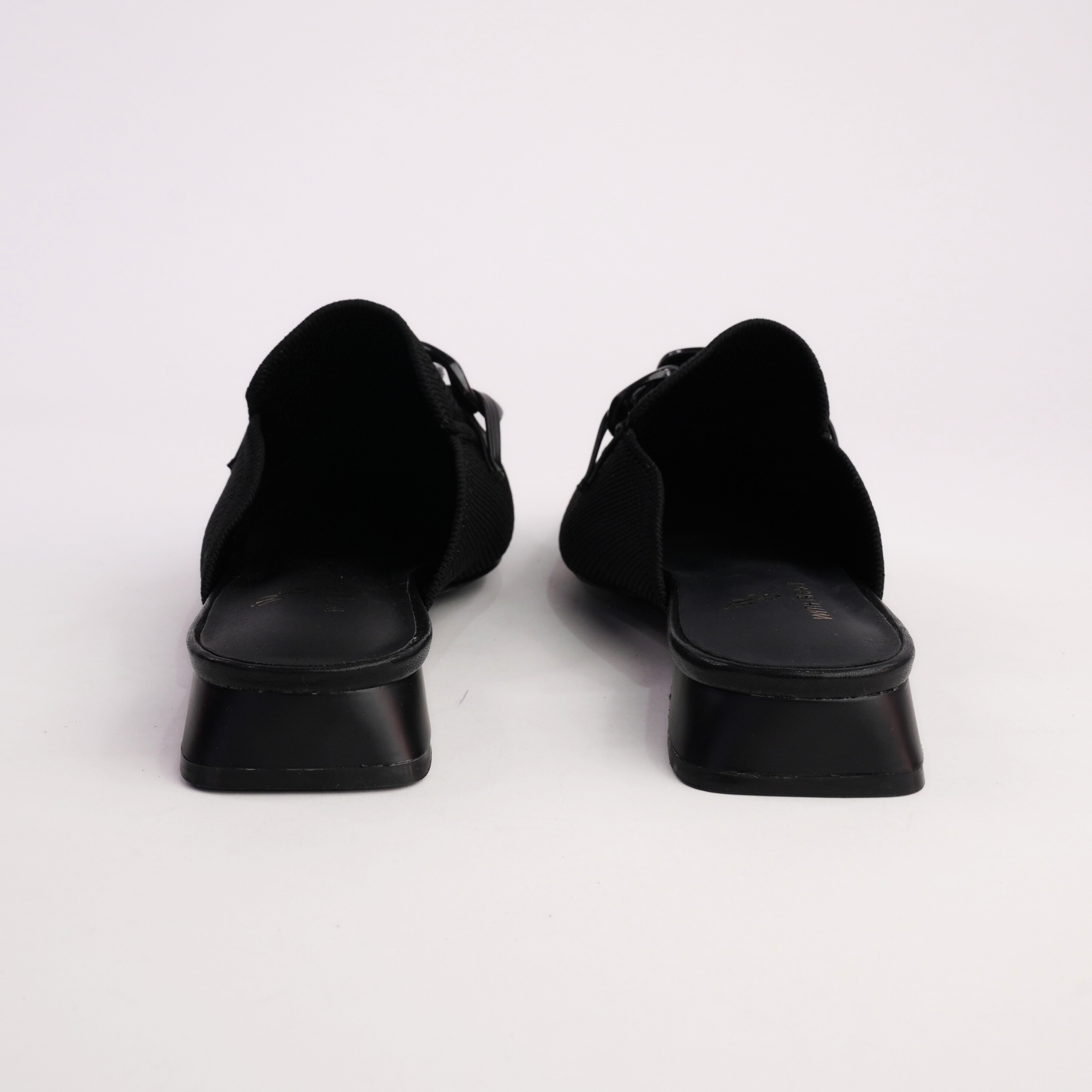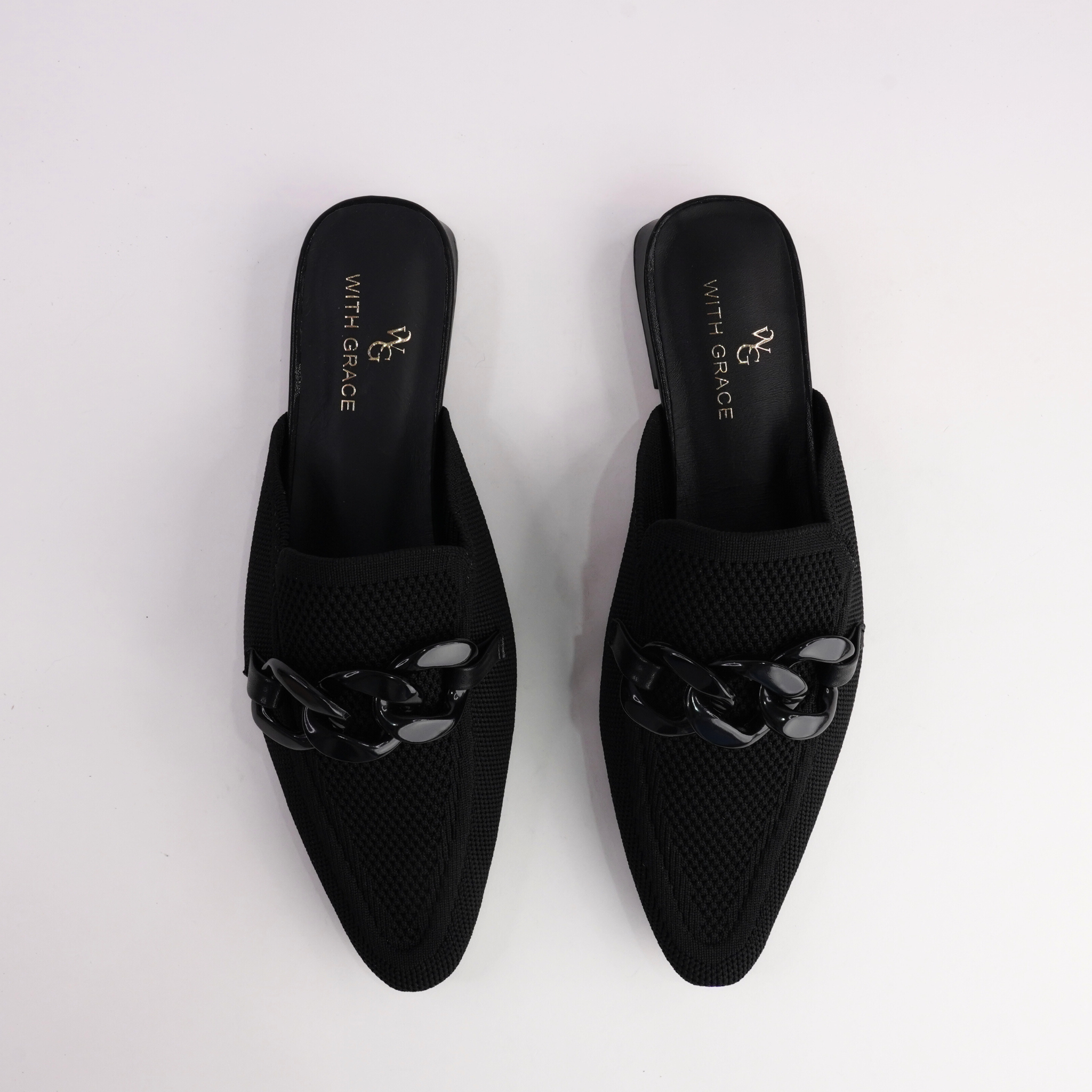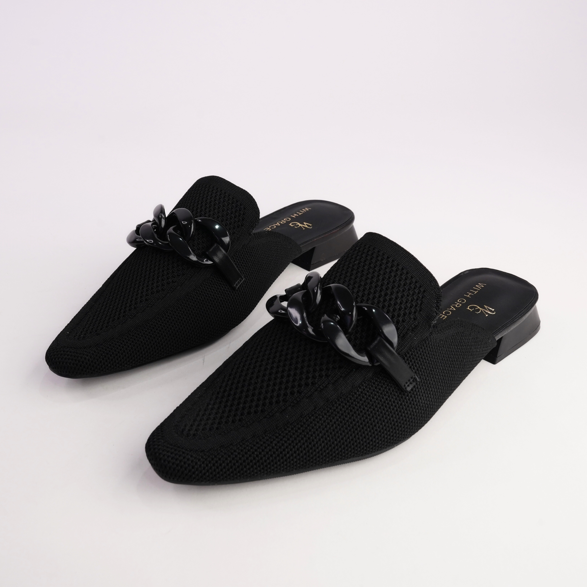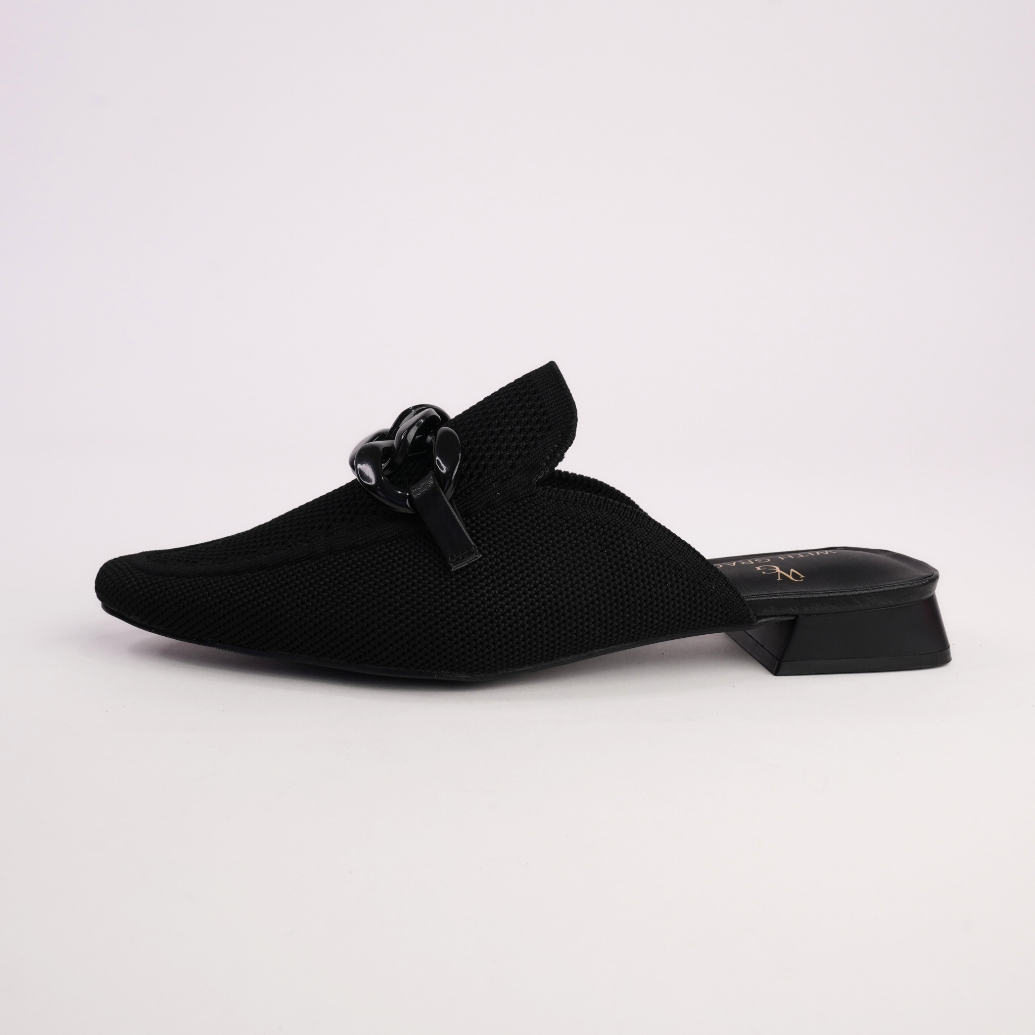 Sleek, modern and effortlessly wearable, Nova by With Grace is your elevated everyday flat. Crafted in breathable black knit, this chic mule silhouette features a bold tonal chain detail across the vamp for a contemporary edge. The slip-on design and low stacked heel make it the perfect balance of comfort and polish — ideal for work, travel or off-duty styling.