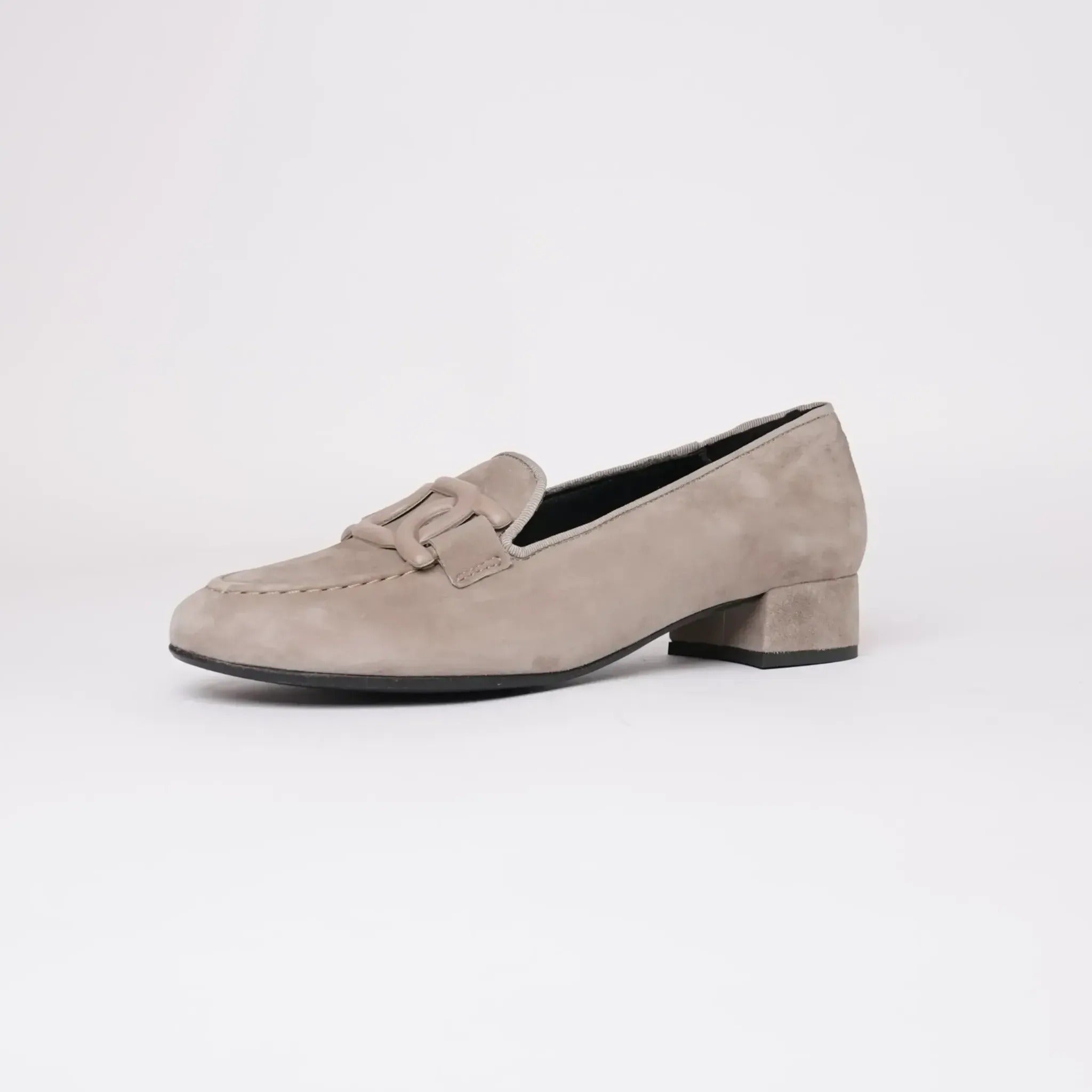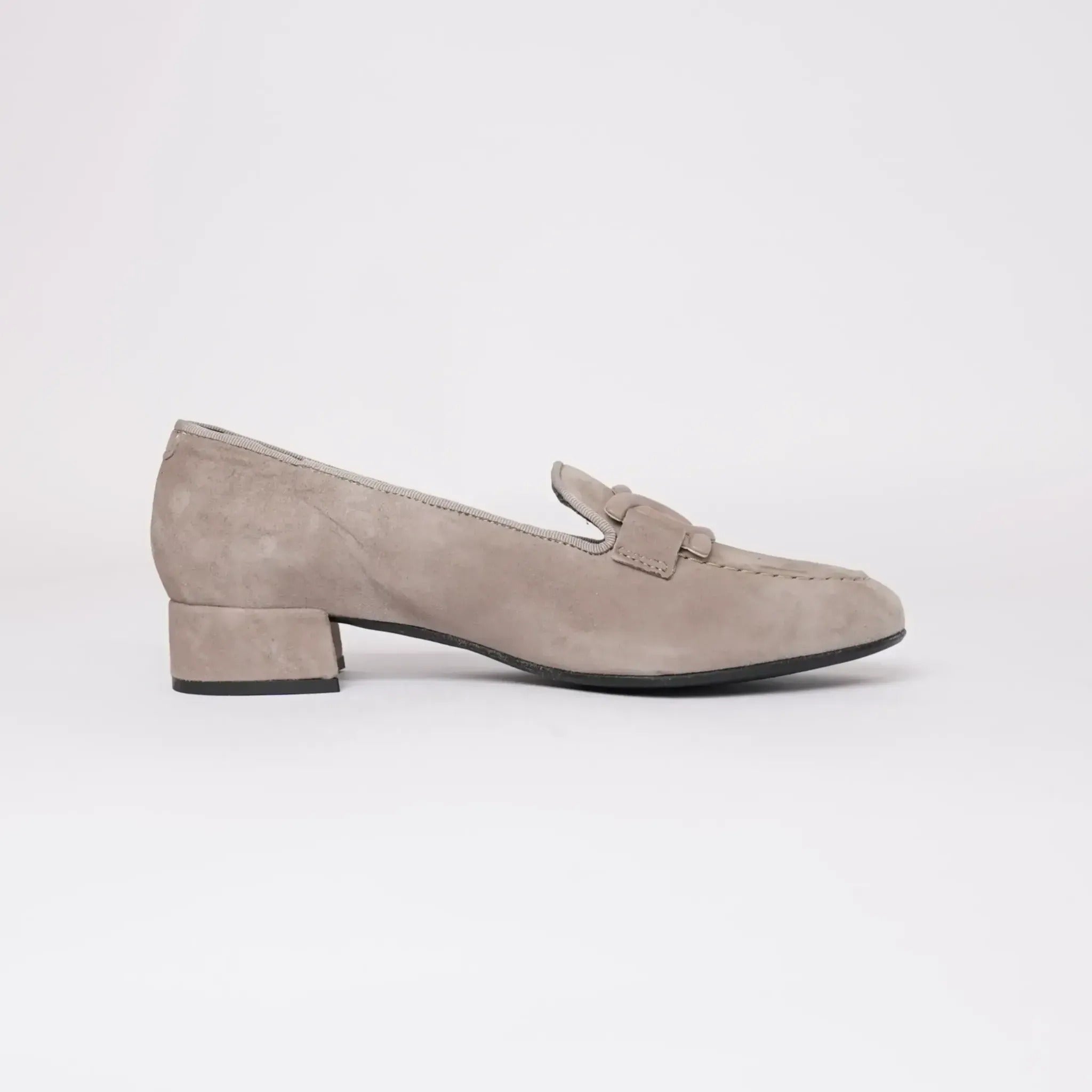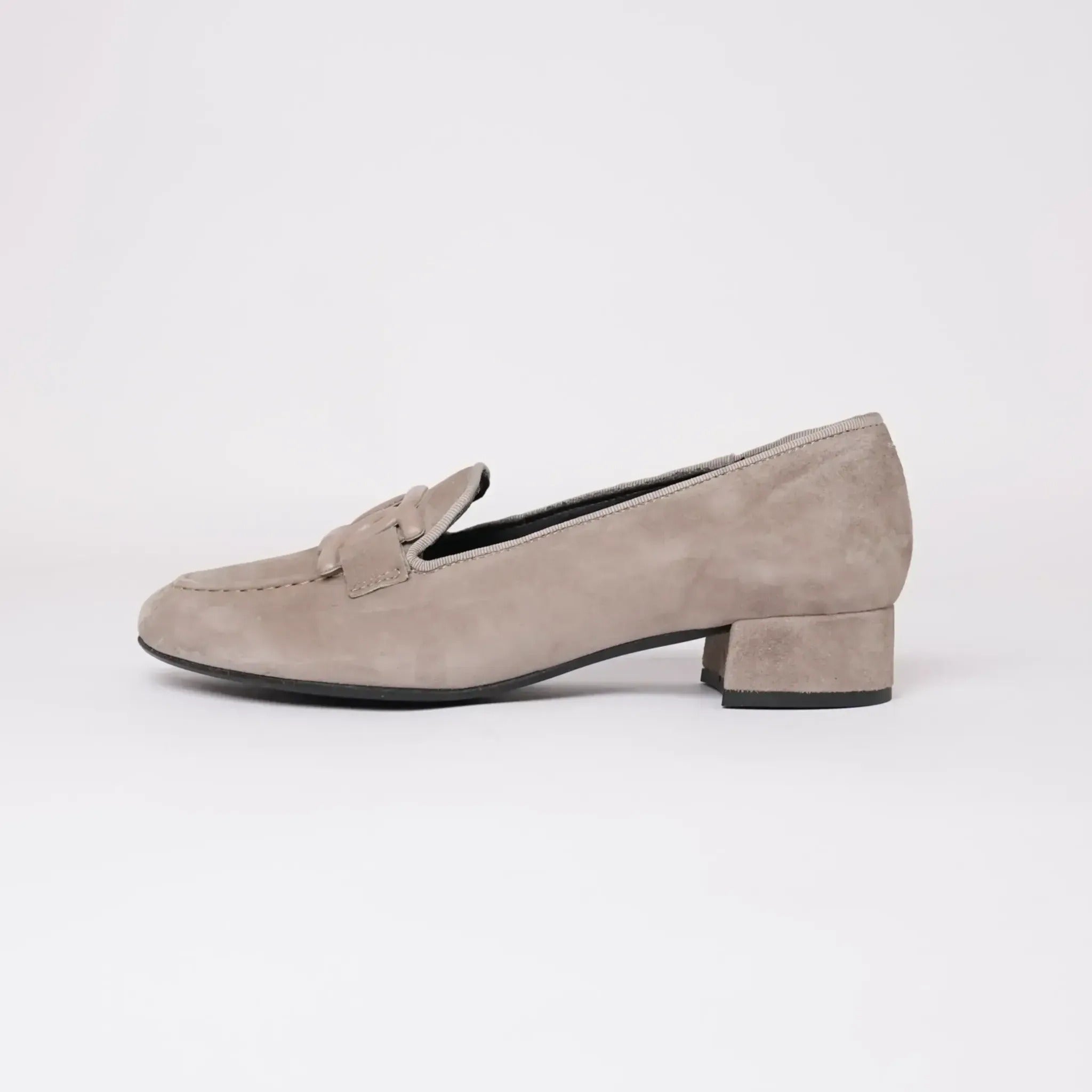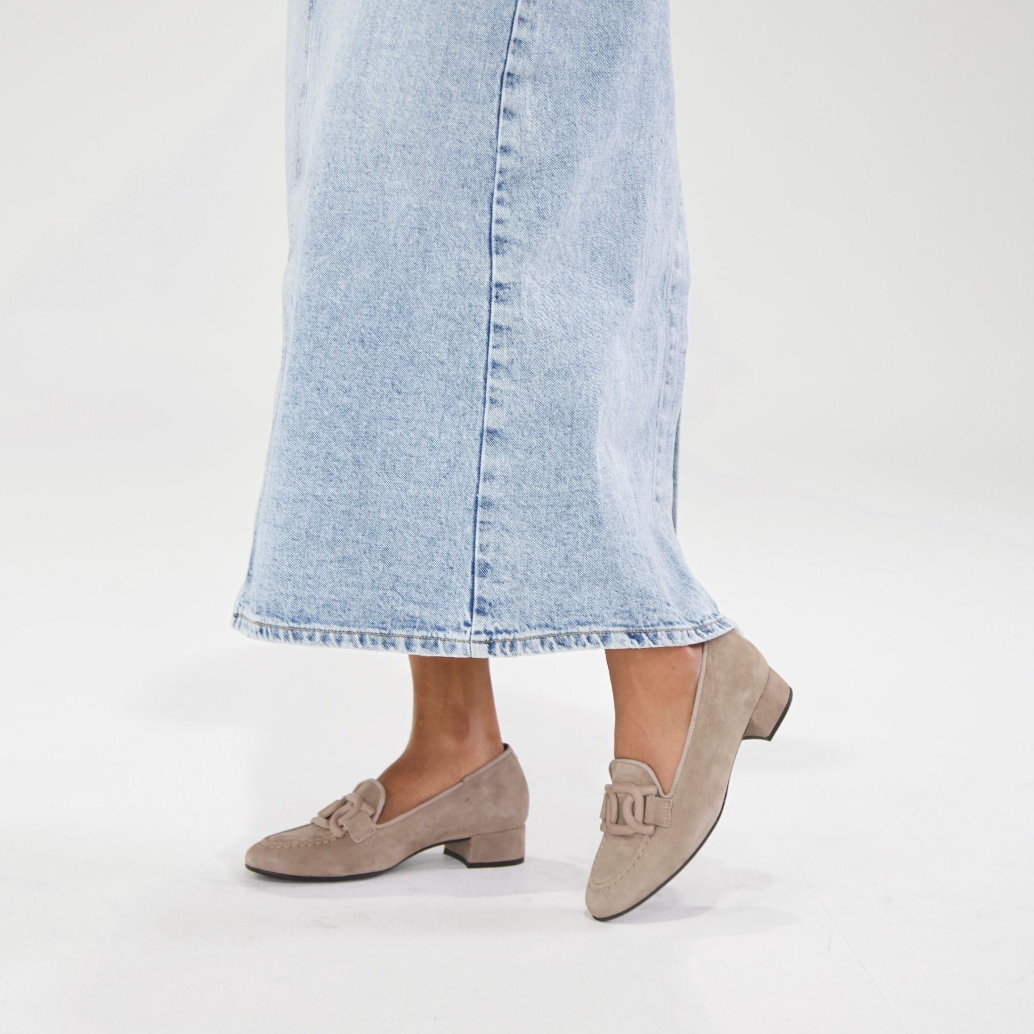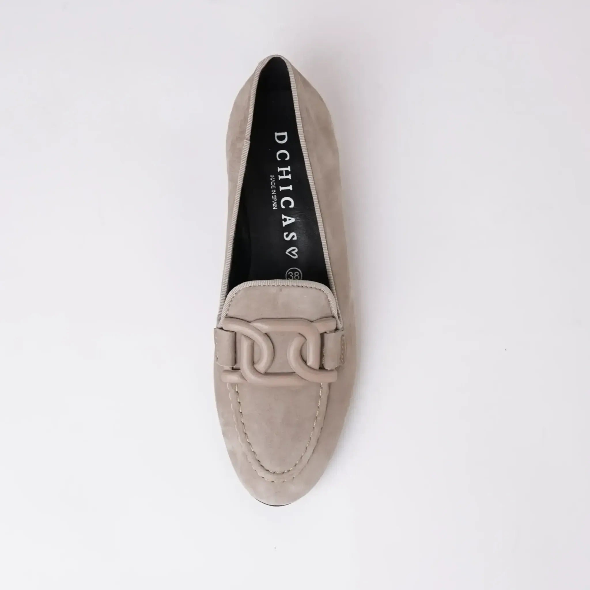 Dress to impress with our 1405 Taupe Suede Loafers by D'Chicas! Made in Spain, these leather loafers feature a padded inner sole for all-day comfort. The sophisticated chain detail at the toe adds a touch of flair, while the 3cm heel provides a subtle lift. Perfect for any occasion, these loafers will elevate your style game.