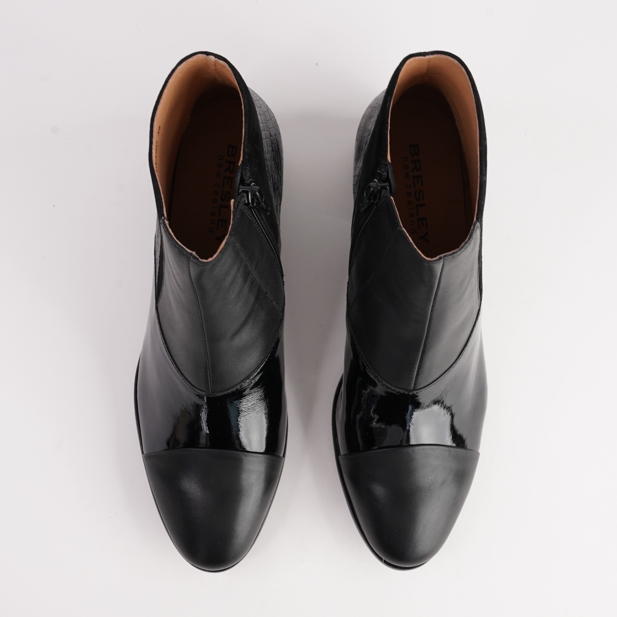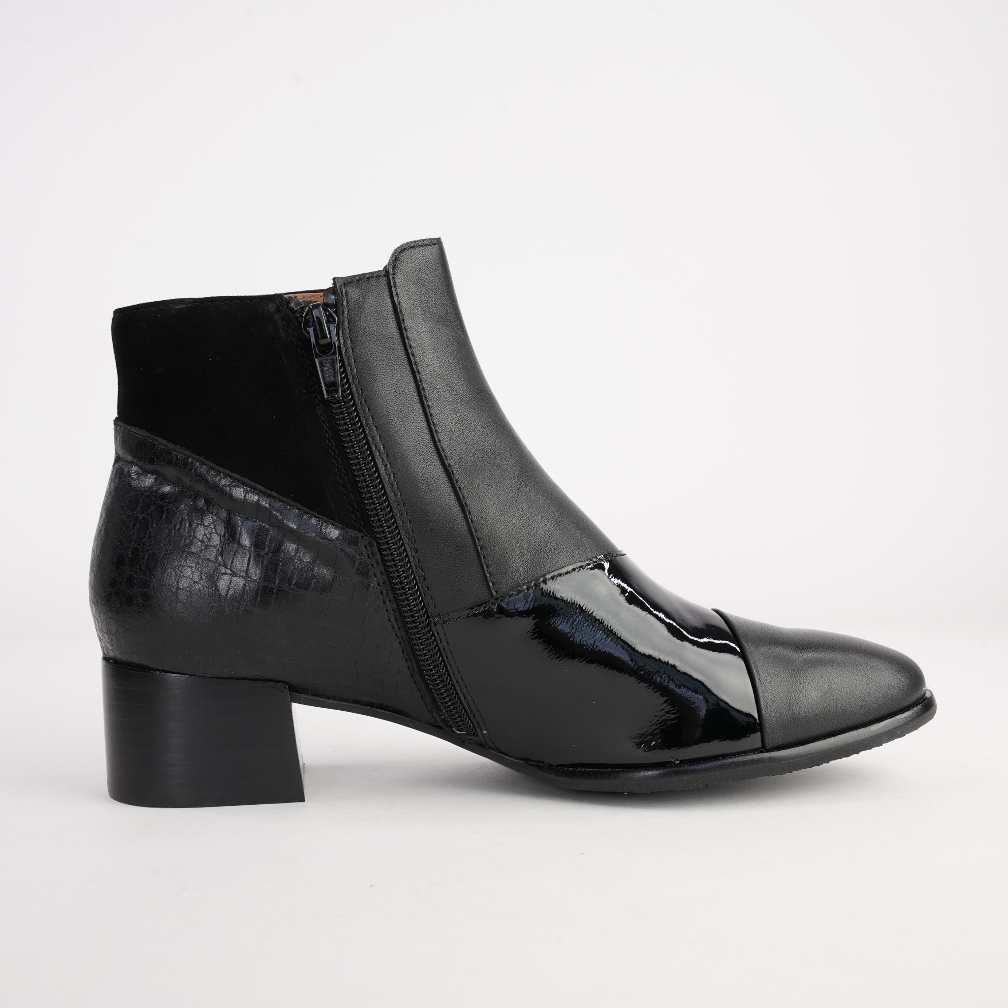 Chic and versatile, Award by Bresley is the perfect blend of texture and modern design. Crafted in a mix of smooth, patent, and subtly textured leather, this ankle boot offers a sophisticated edge to your everyday wardrobe. The sleek silhouette is complemented by a low block heel for all-day comfort, while the combination of finishes adds depth and interest. Ideal for work or weekend wear, Award is a timeless style with a contemporary twist.