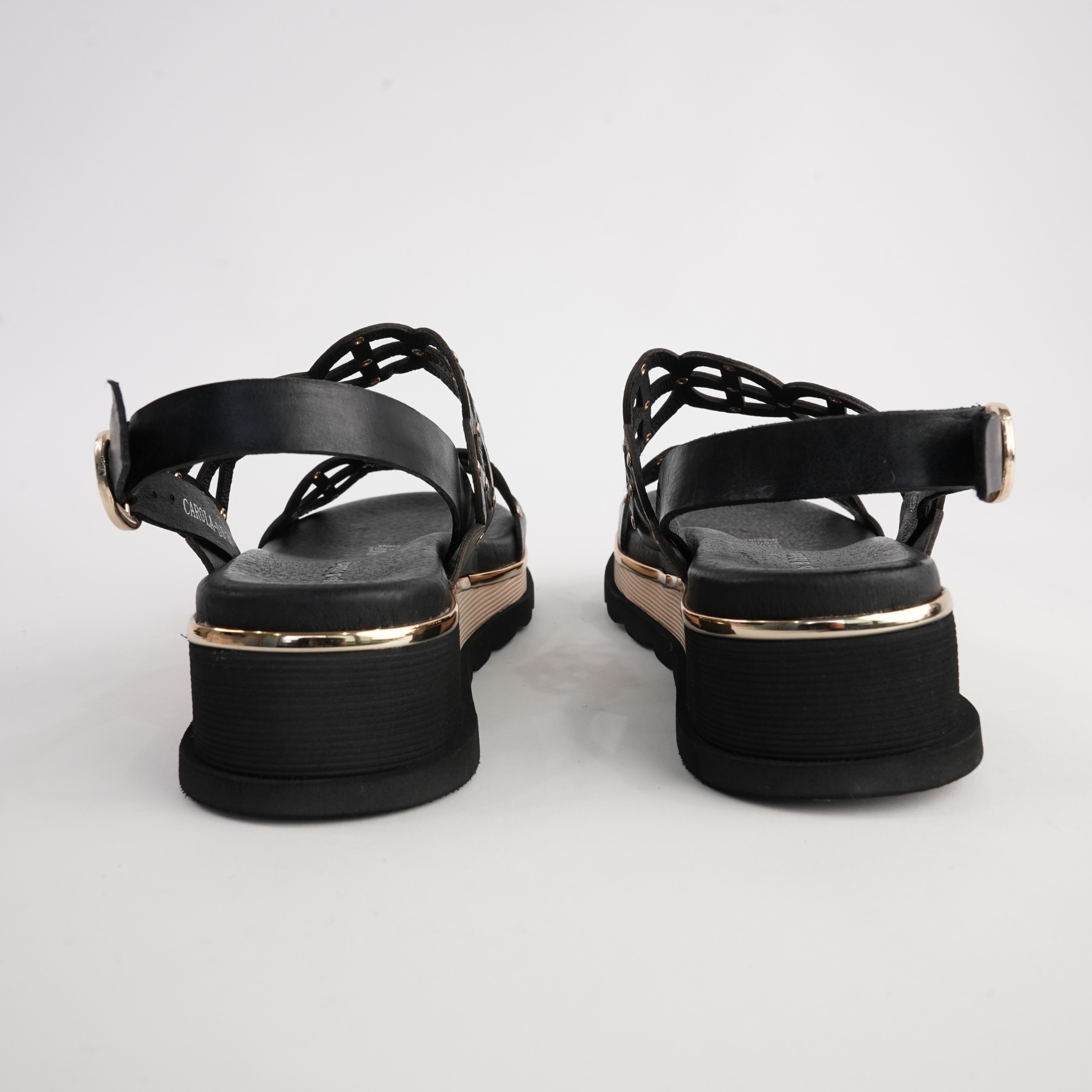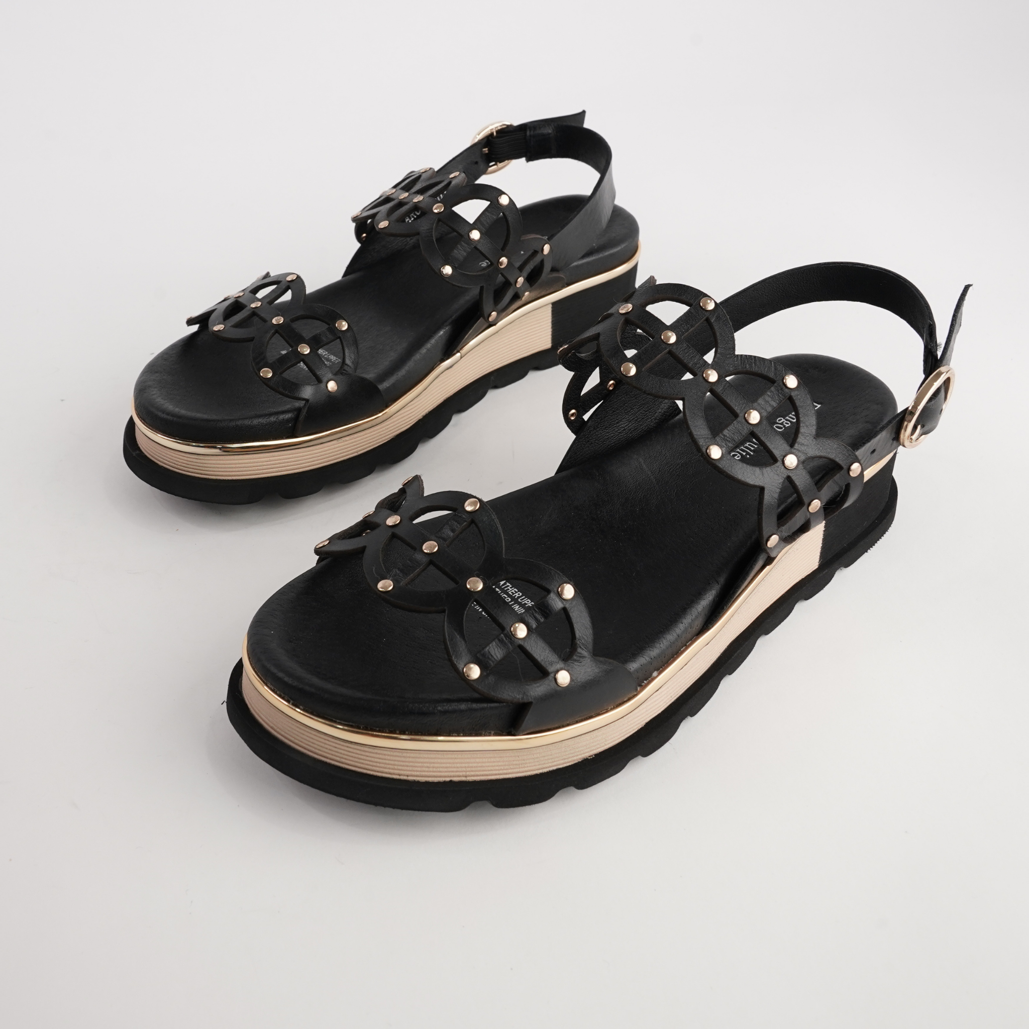 Bring a touch of statement glamour to your everyday looks with the Carola Sandals by Django & Juliette. Crafted from smooth black leather, these sandals feature intricate cut-out straps detailed with metallic studs for a bold yet feminine finish. The slingback design is elevated with a chic gold-tone buckle, while the platform sole with metallic trim adds both style and comfort. Perfect for pairing with everything from flowy dresses to tailored pants, Carola strikes the perfect balance between edge and elegance.