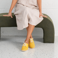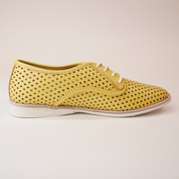 Add a burst of brightness to your steps with the Derby Punch Sunshine Leather Lace Up Flats by Rollie. These lightweight flats are crafted from premium sunshine yellow leather with punch-hole detailing, offering breathability and a trendy look. The lace-up design ensures a secure fit, while the soft, cushioned insole provides maximum comfort for all-day wear. Perfect for casual outings or a day at work, these shoes are sure to keep you both stylish and comfortable. A must-have for those who love a playful pop of colour in their wardrobe!