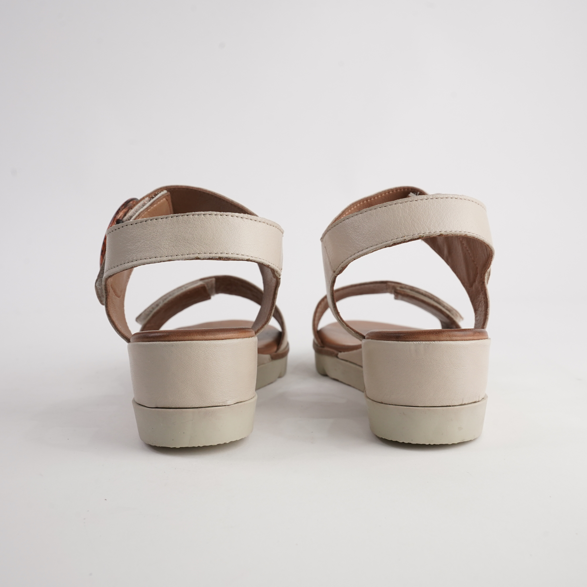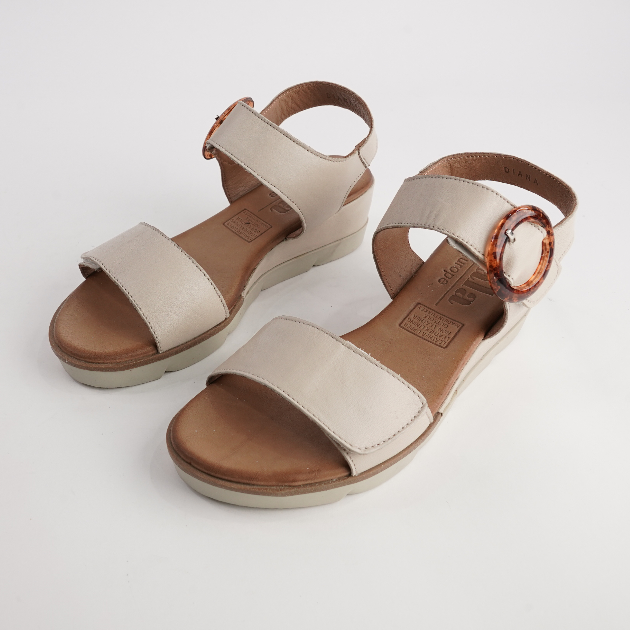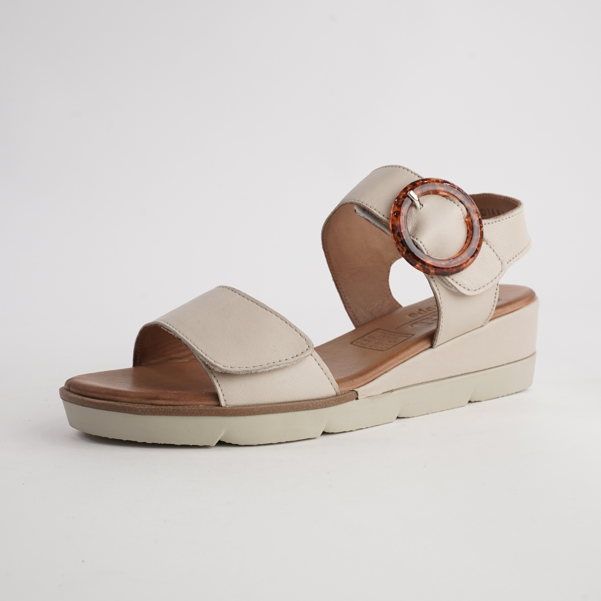Step into effortless elegance with the Diana Sandals by Sala. Crafted from smooth bone-toned leather, this style combines modern simplicity with everyday comfort. The wide front strap and cushioned insole provide secure wear, while the ankle strap features a statement tortoiseshell buckle that adds a chic finishing touch. Set on a lightweight wedge sole, the Diana Sandals offer subtle height and stability perfect for pairing with summer dresses, linen pants, or cropped jeans.