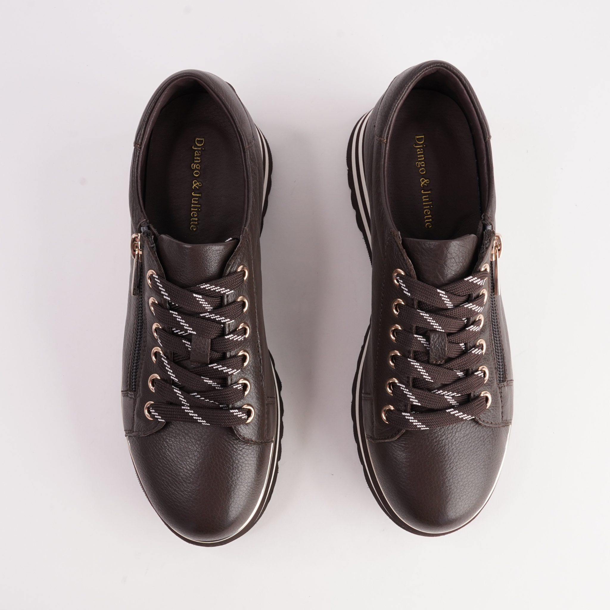 Step up your style with the Eammes Sneakers by Django & Juliette, featuring smooth choc leather, a bold platform sole, and silver accents. Designed for all-day comfort, they offer a lace-up front, side zip, and orthotic-friendly fit.