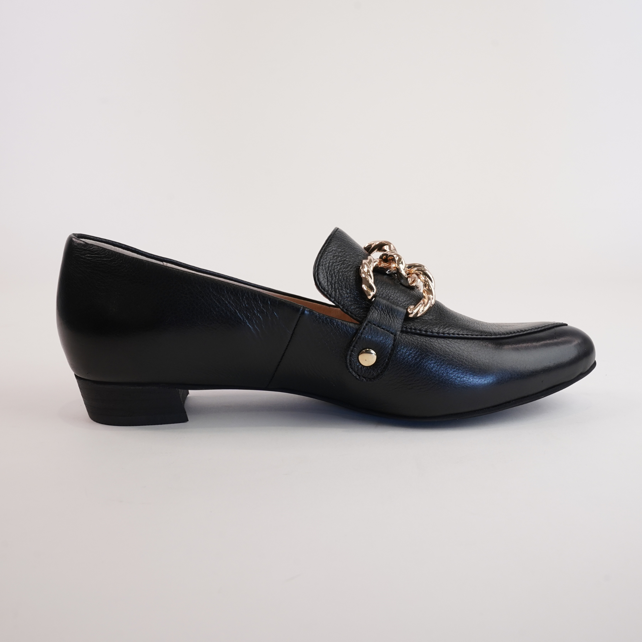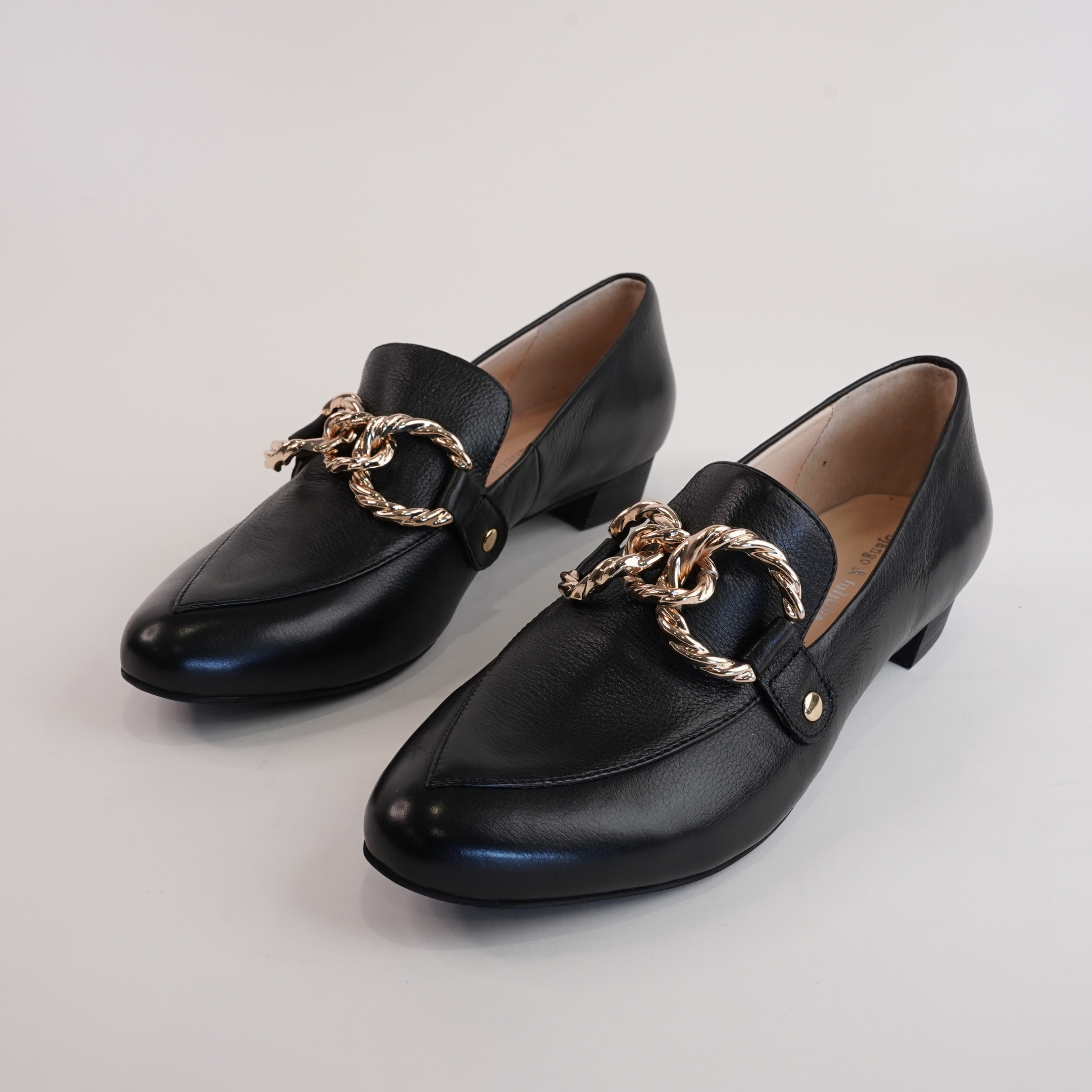 Elevate your everyday style with the Esben Loafers by Django & Juliette. Crafted from soft black leather, these sleek loafers feature a striking gold chain embellishment for a touch of elegance. Designed with a low stacked heel and cushioned footbed, they offer all-day comfort while maintaining a polished, sophisticated look.