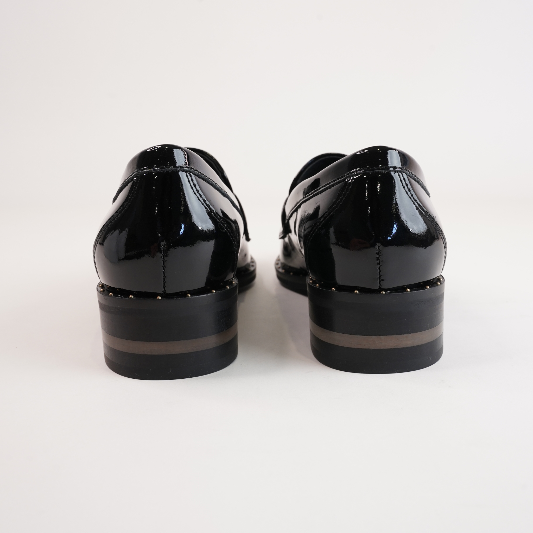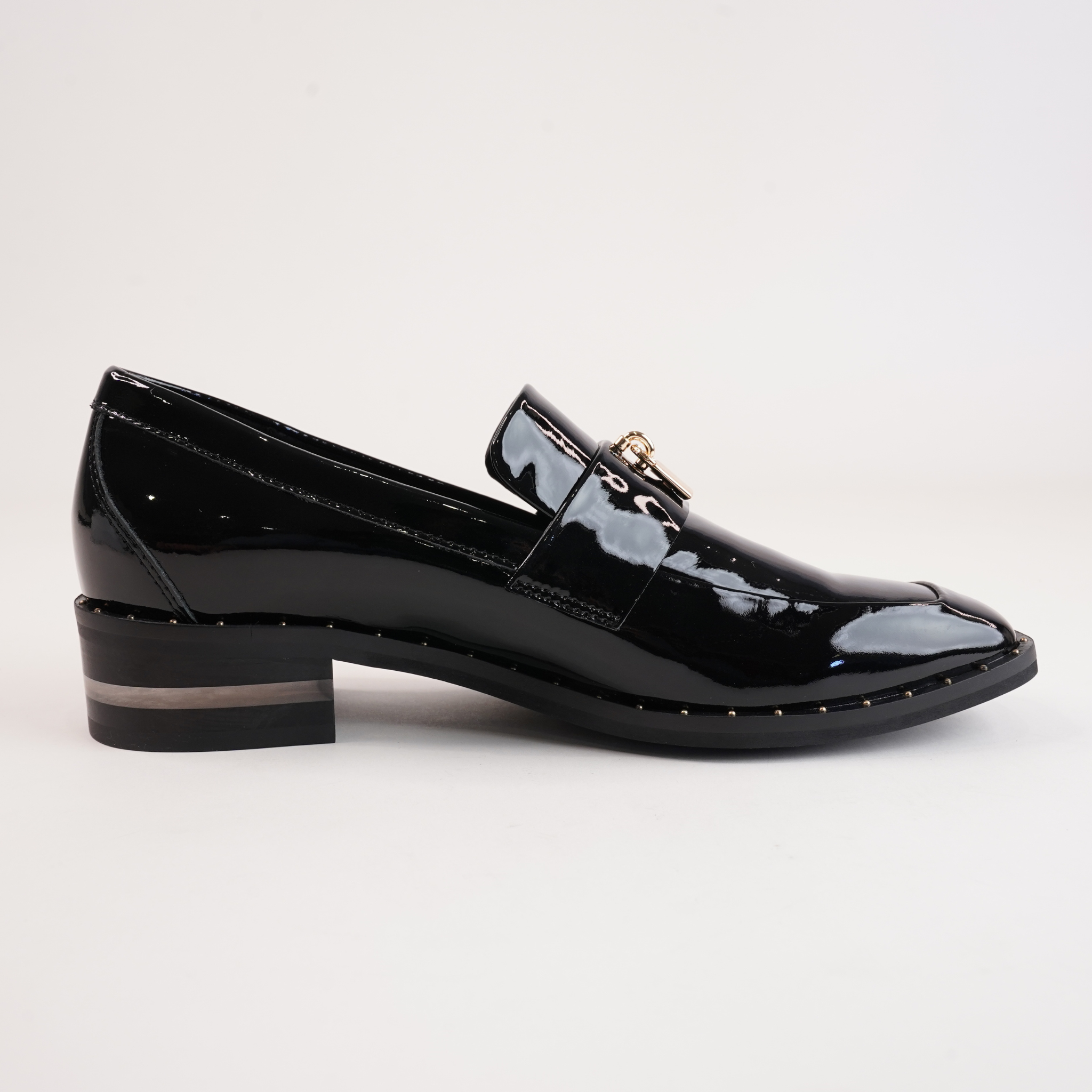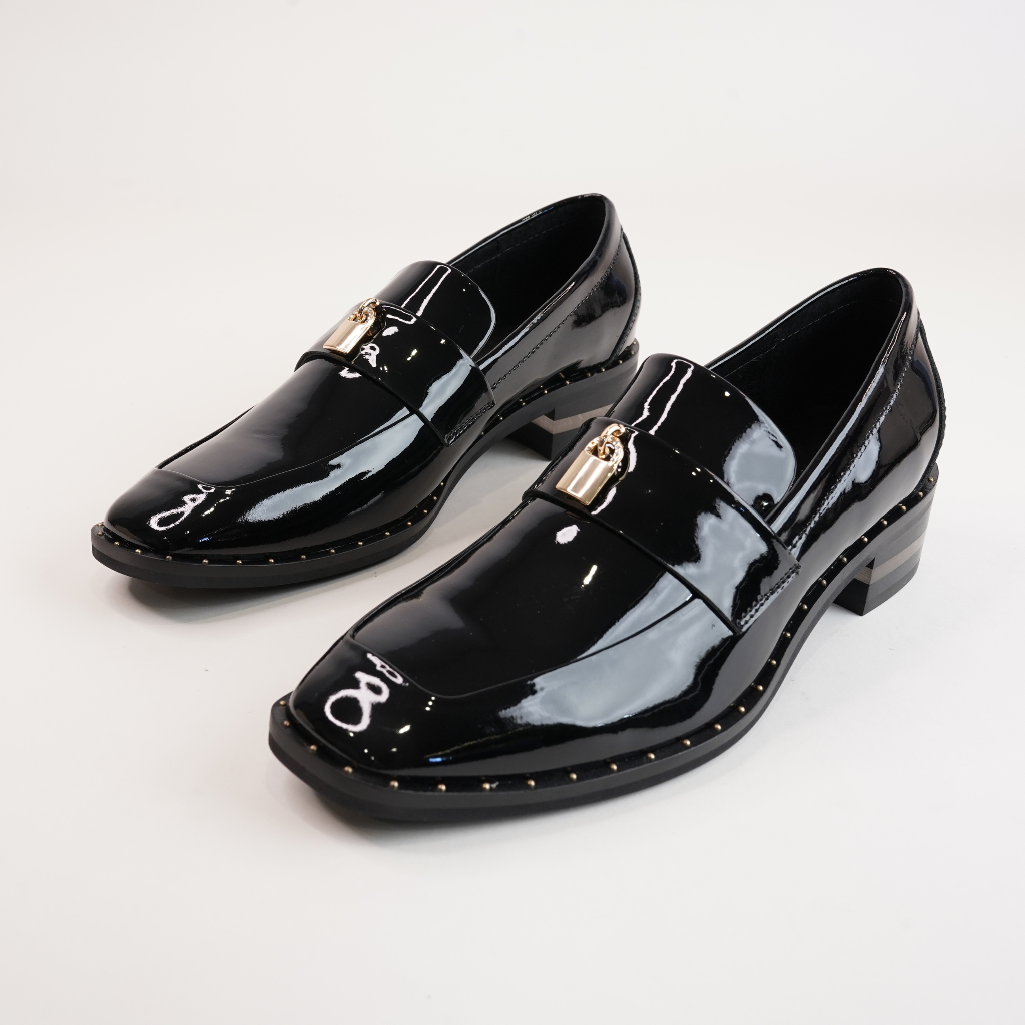 Step into sleek sophistication with the Fillipia loafers by Django & Juliette. Crafted in glossy black patent leather, these loafers make a bold statement with a chic gold padlock detail and edgy studded welt. The low block heel adds just the right amount of lift, making them perfect for both workwear polish and weekend edge.