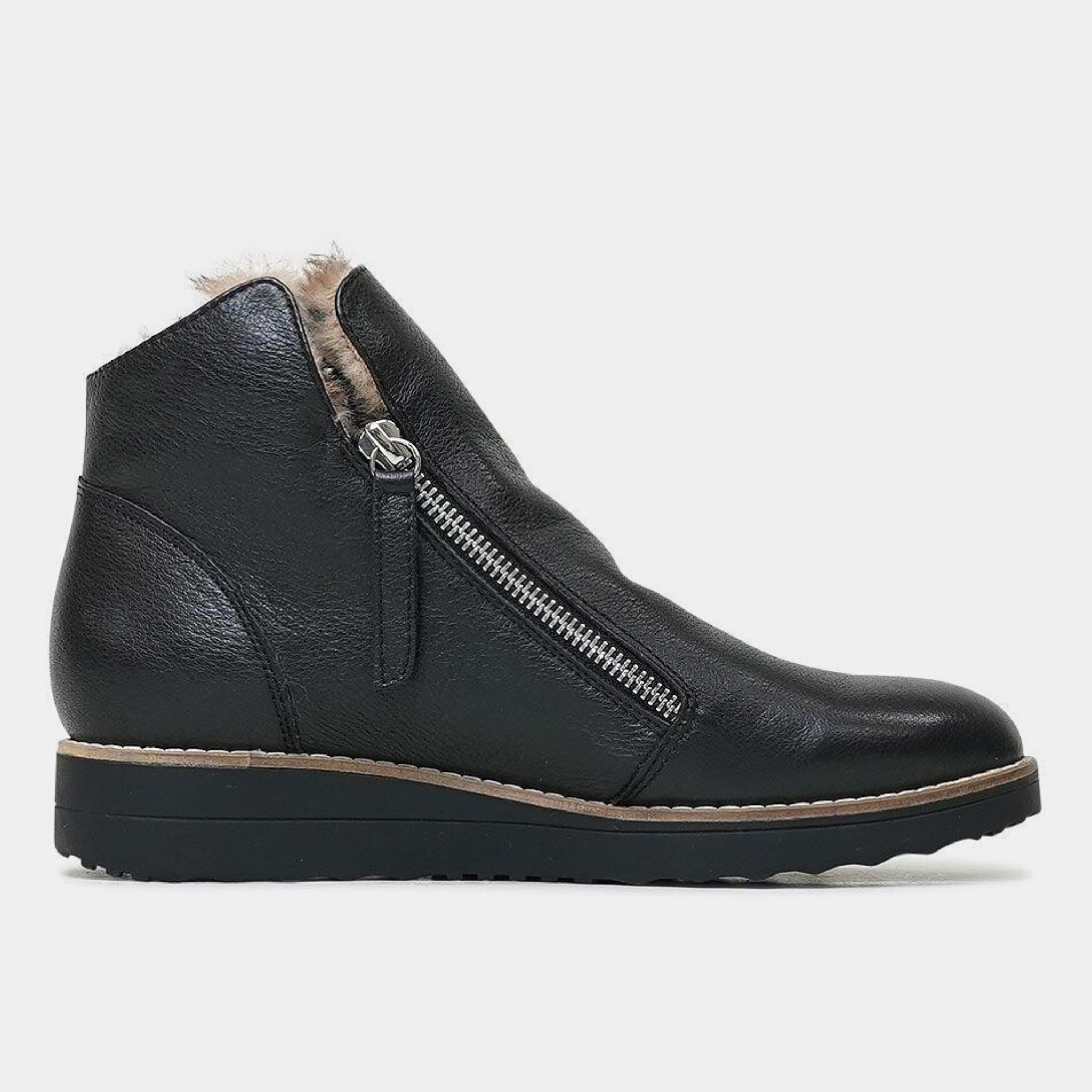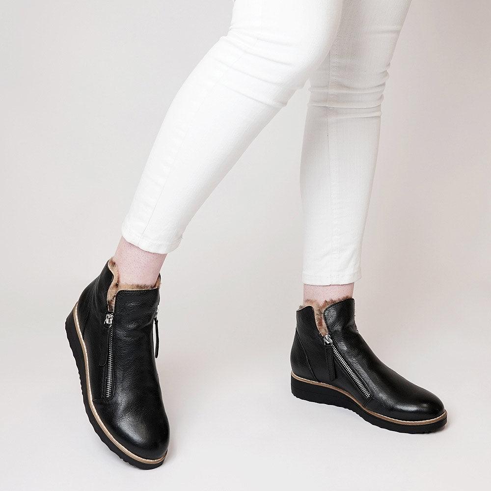 The Opal Black Leather/Ocelot Fur ankle boots by Top End sit on a low heel and feature functional side zips and faux-fur lining. These comfortable boots are great for pairing with other casual pieces in your winter wardrobe such as jeans, puffer jackets and relaxed cable-knit jumpers.