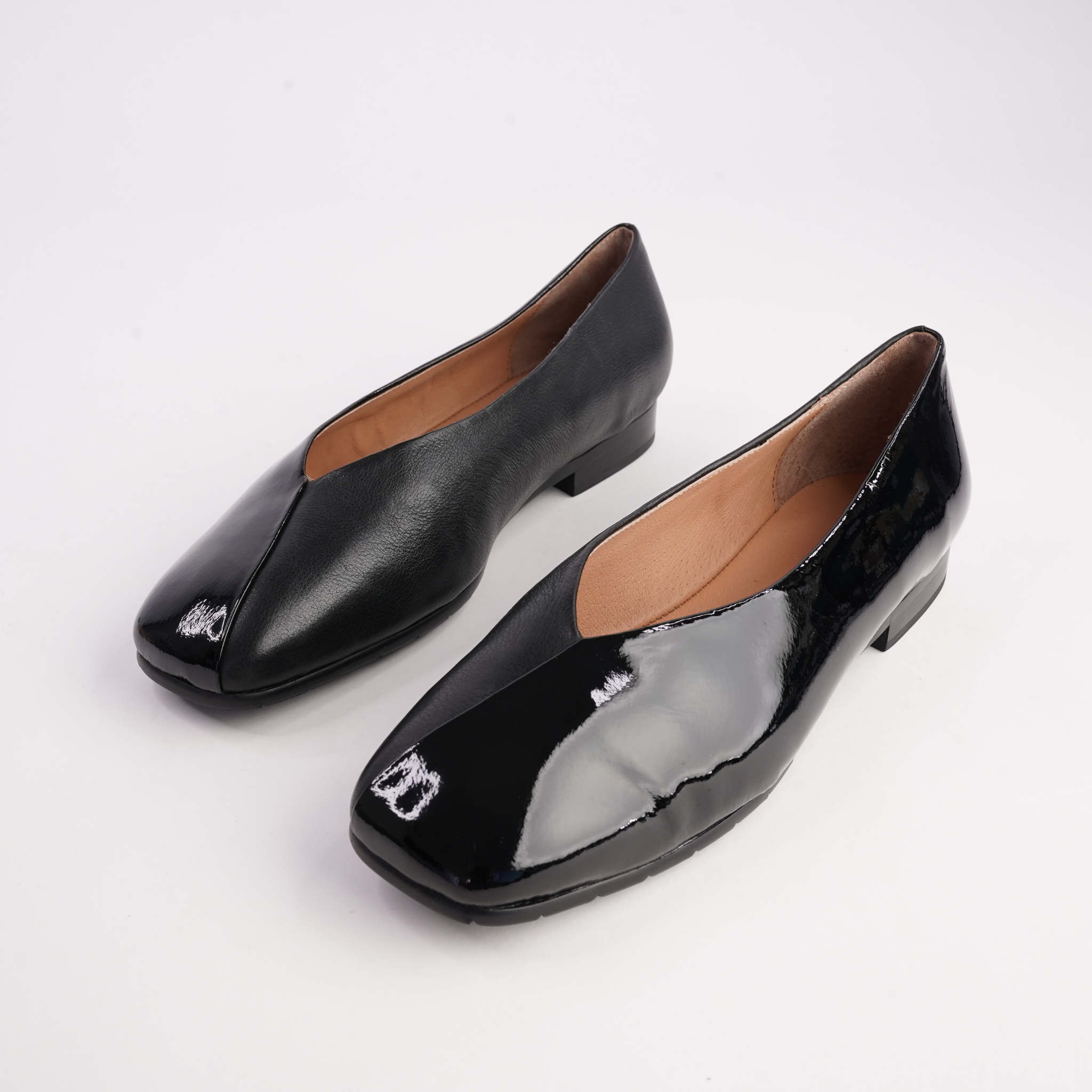 A modern flat with a little edge Paydes blends classic black leather with striking glossy patent for a look that feels effortless yet elevated. The soft leather upper and flexible sole make this an easy all-day option, while the contrast panels add just enough interest to lift simple outfits.