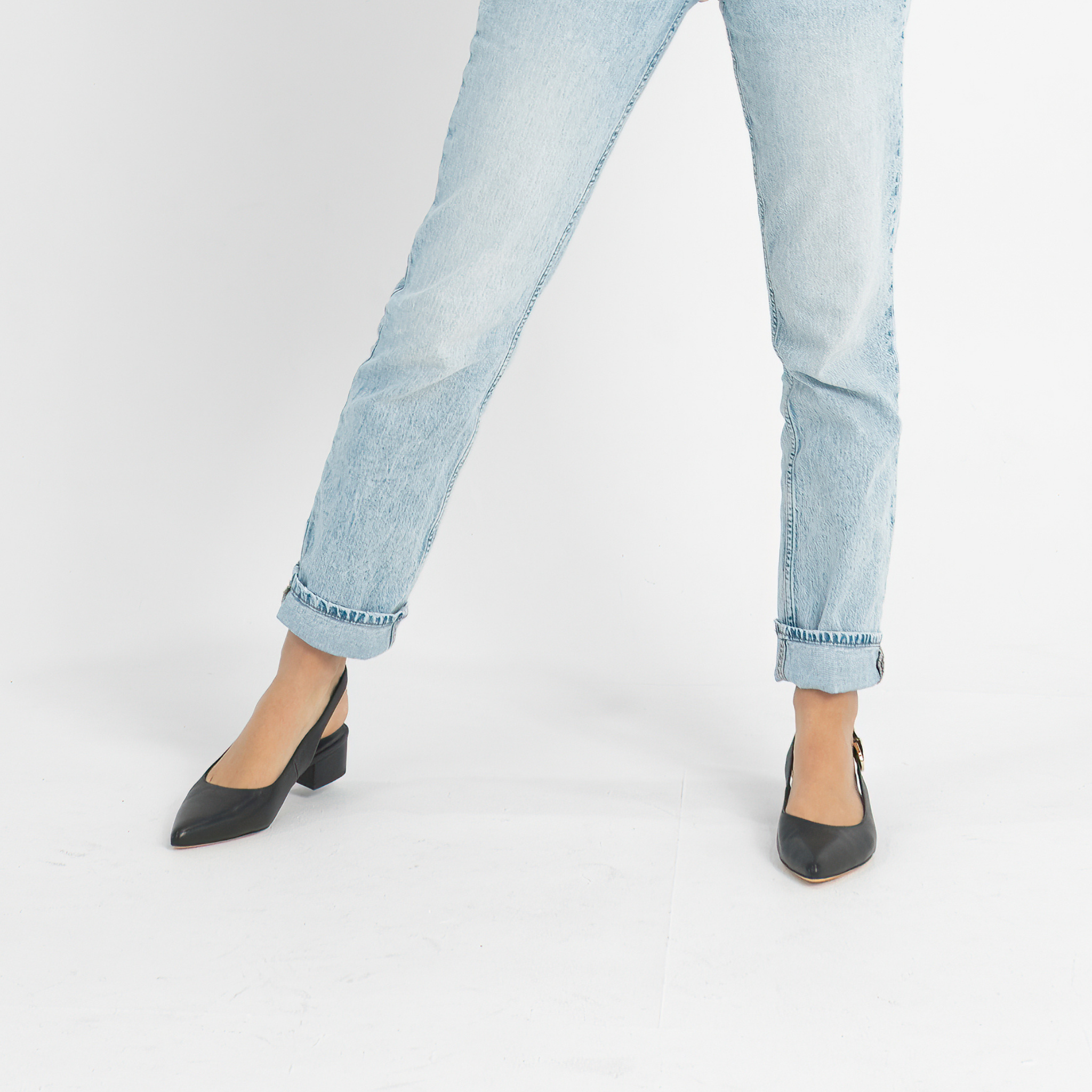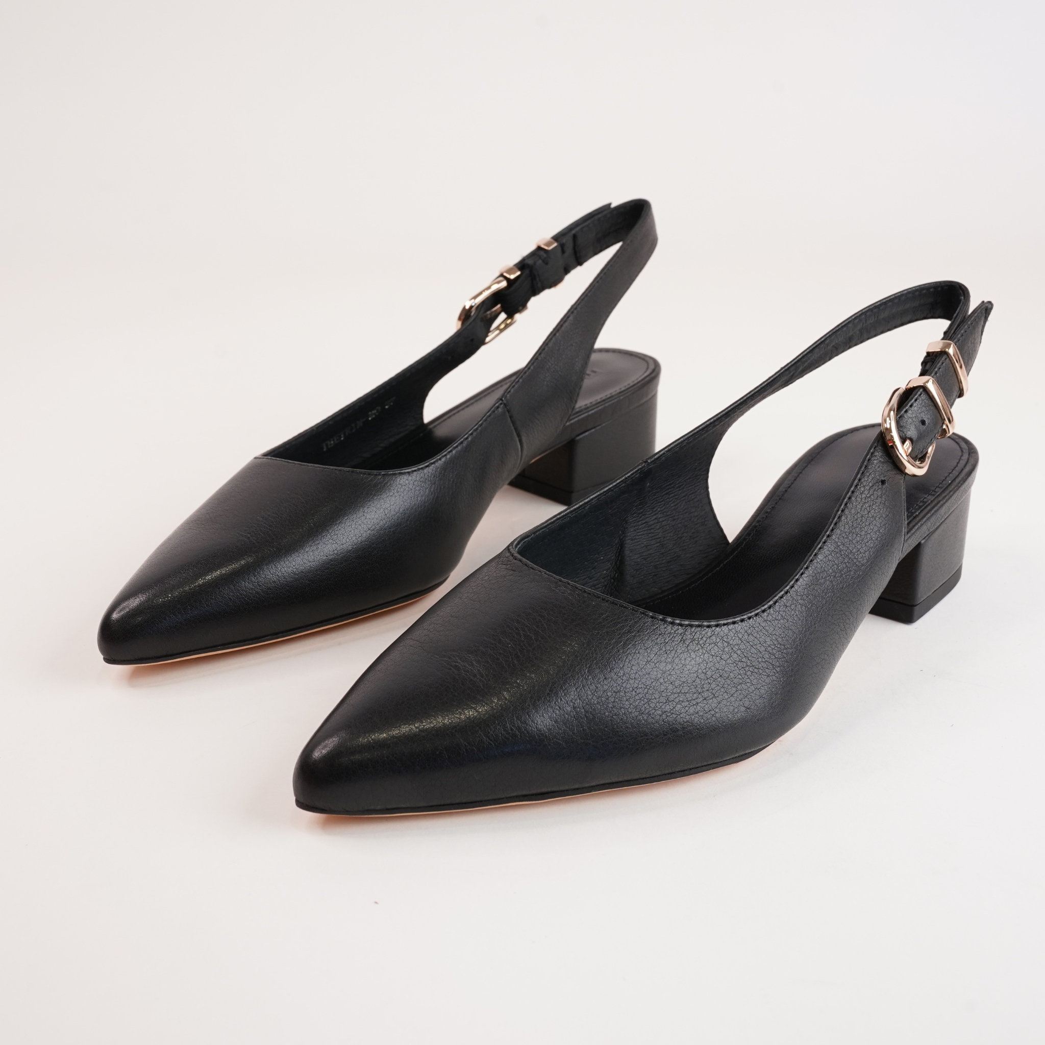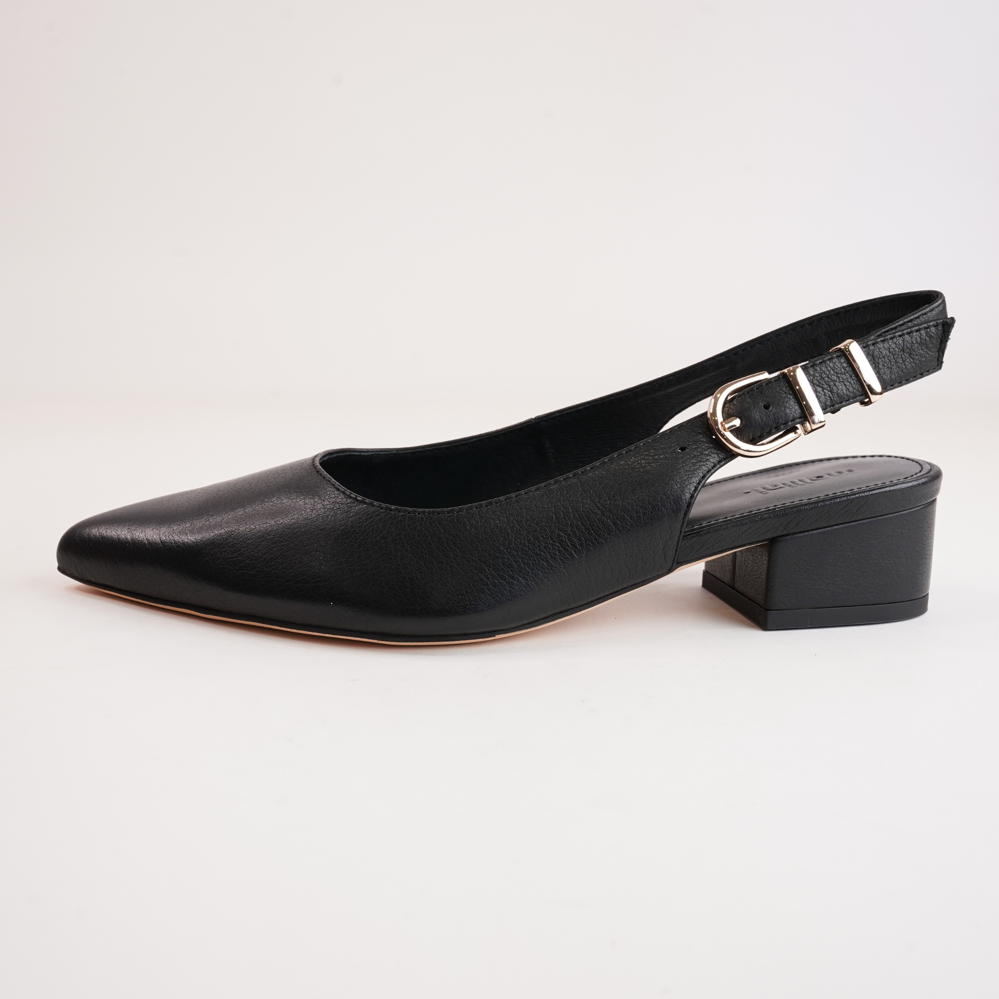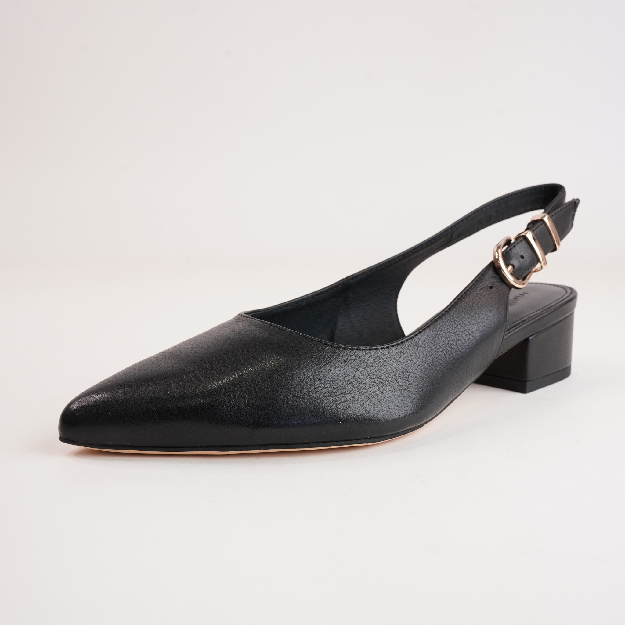 Understated elegance meets everyday wear in the Thetrim Black Leather Heels by Mollini. Crafted from smooth black leather with a chic pointed toe and slingback strap, this low-block heel offers timeless sophistication in a sleek, minimalist silhouette.