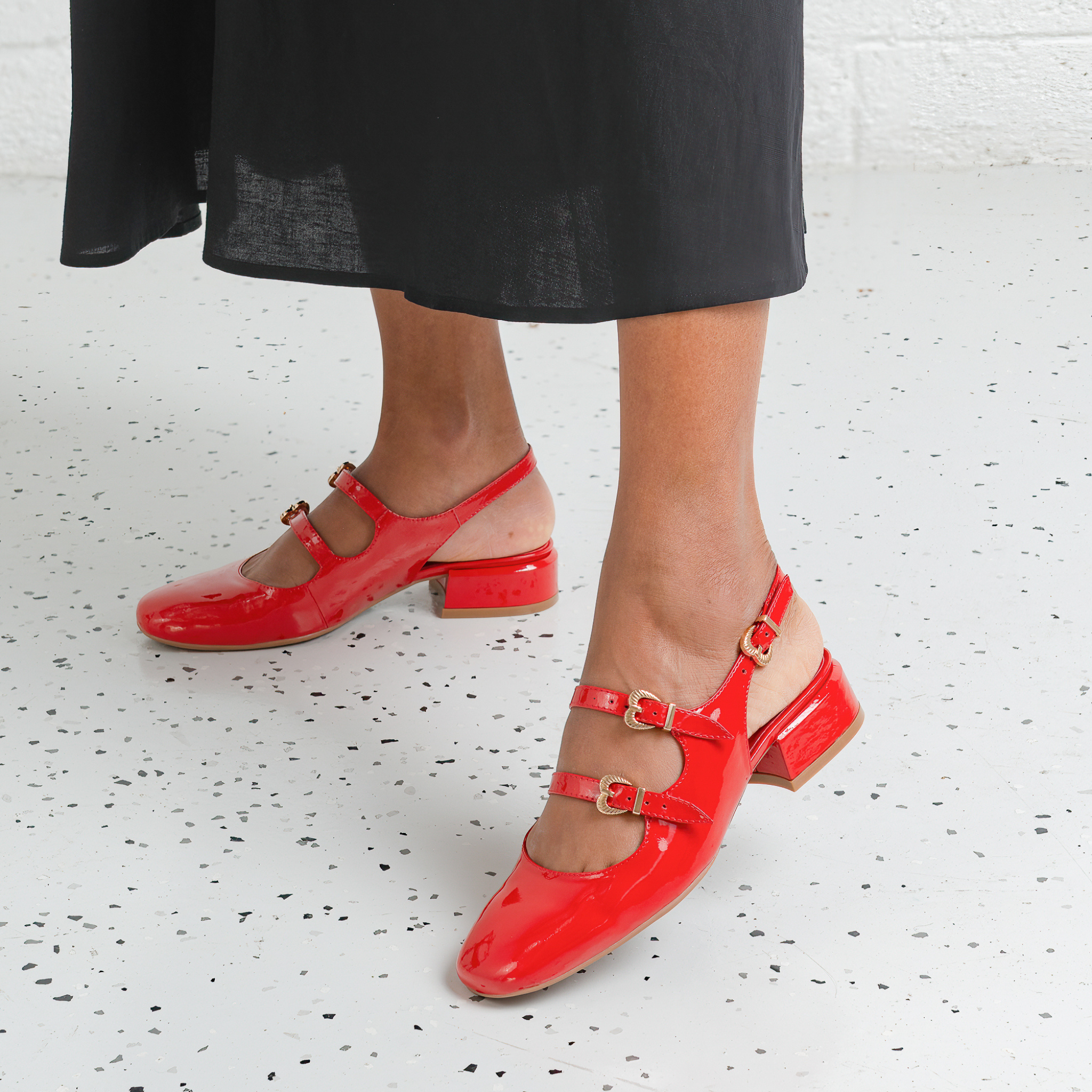 The Viraz Red Patent Leather Heels by Django & Juliette add a bold, vintage-inspired touch to any outfit. Featuring glossy patent leather, dual buckle straps, and a comfortable block heel, they effortlessly combine elegance with everyday wearability.