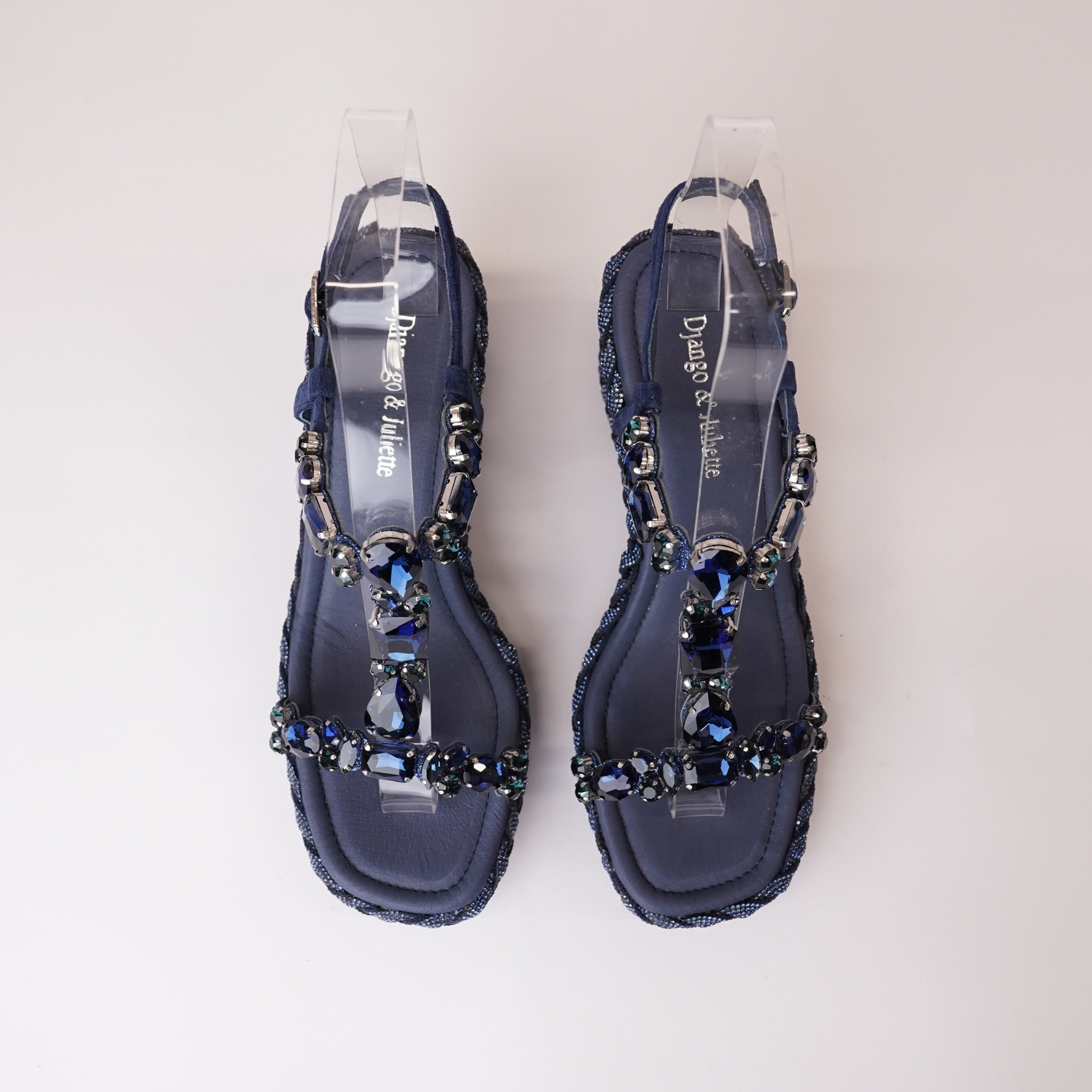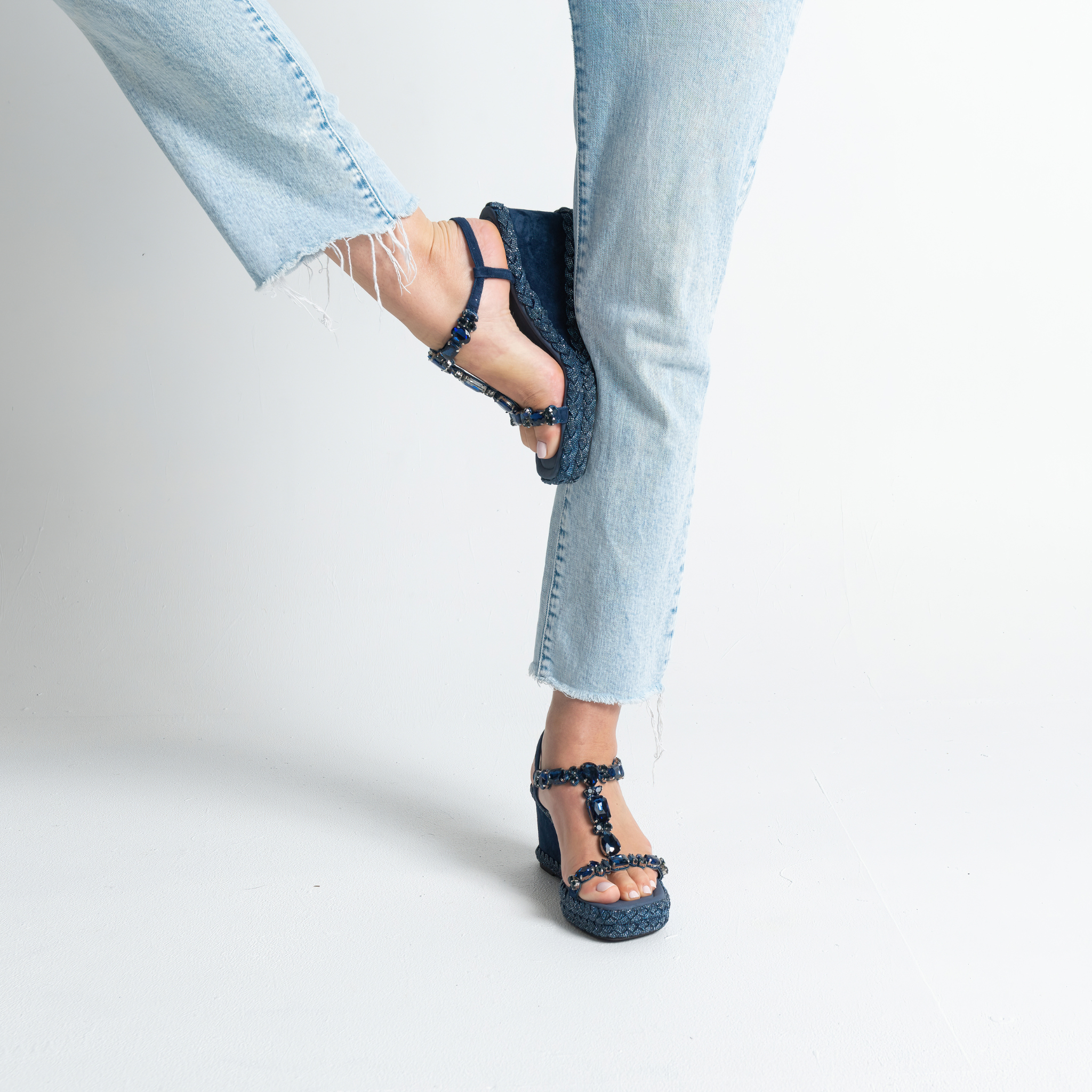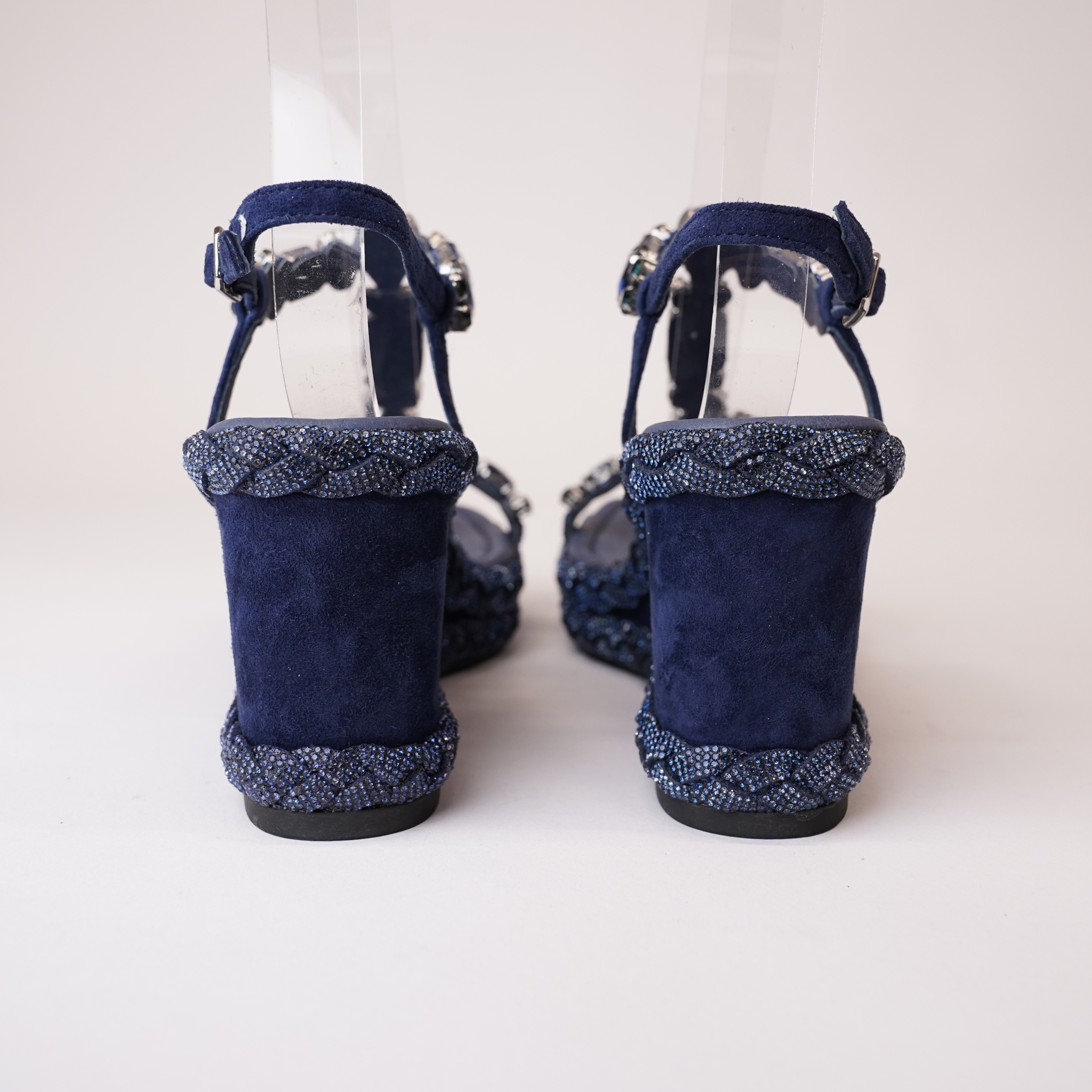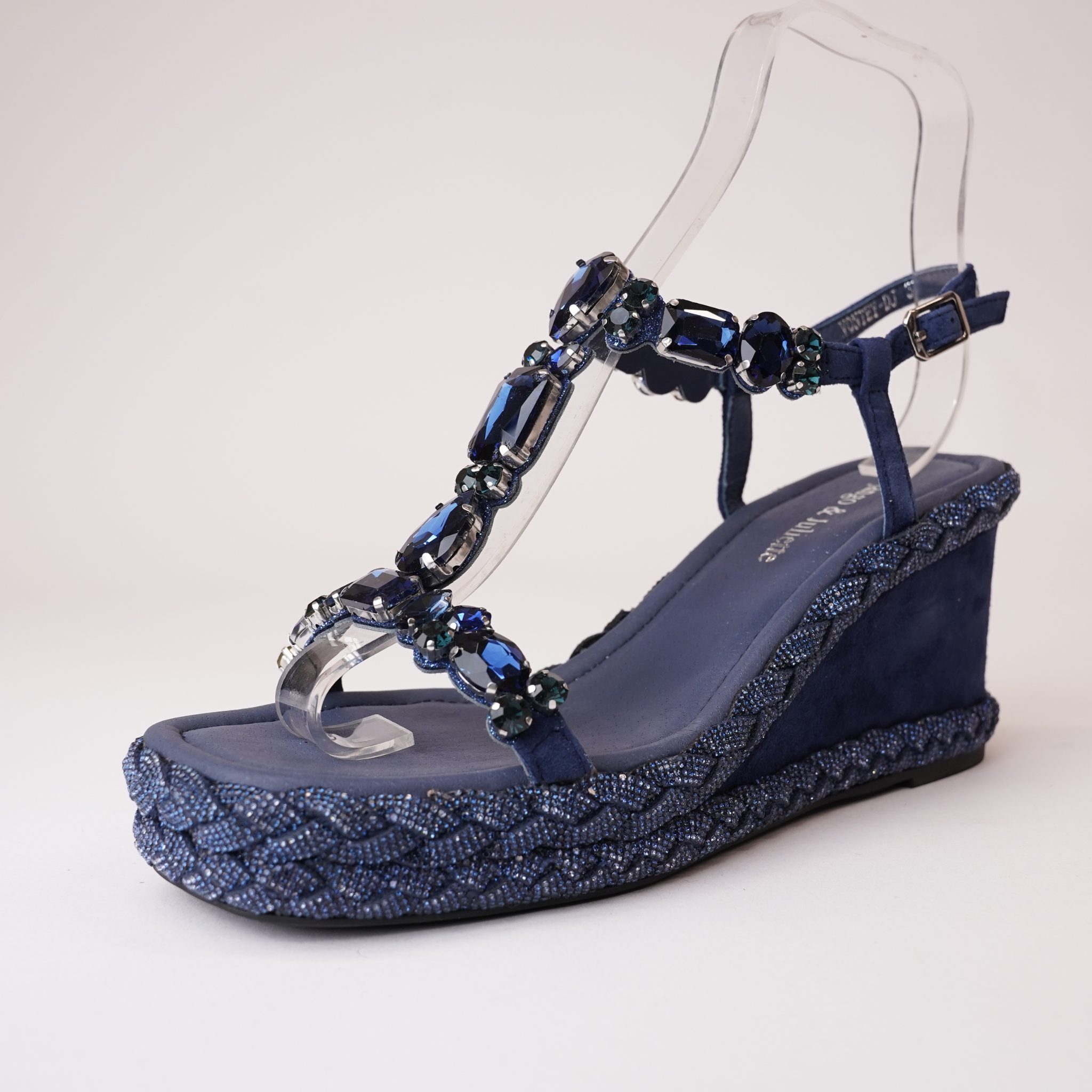 Add some sparkle to your step with Vontey Navy Suede Wedge Sandals by Django & Juliette! Made with a leather upper and lining, these sandals also feature jewelled embellishment and a buckled ankle strap for a perfect fit. With a 9cm wedge heel and a 2cm underfoot platform with soft padding, these sandals will have you looking chic and comfortable.